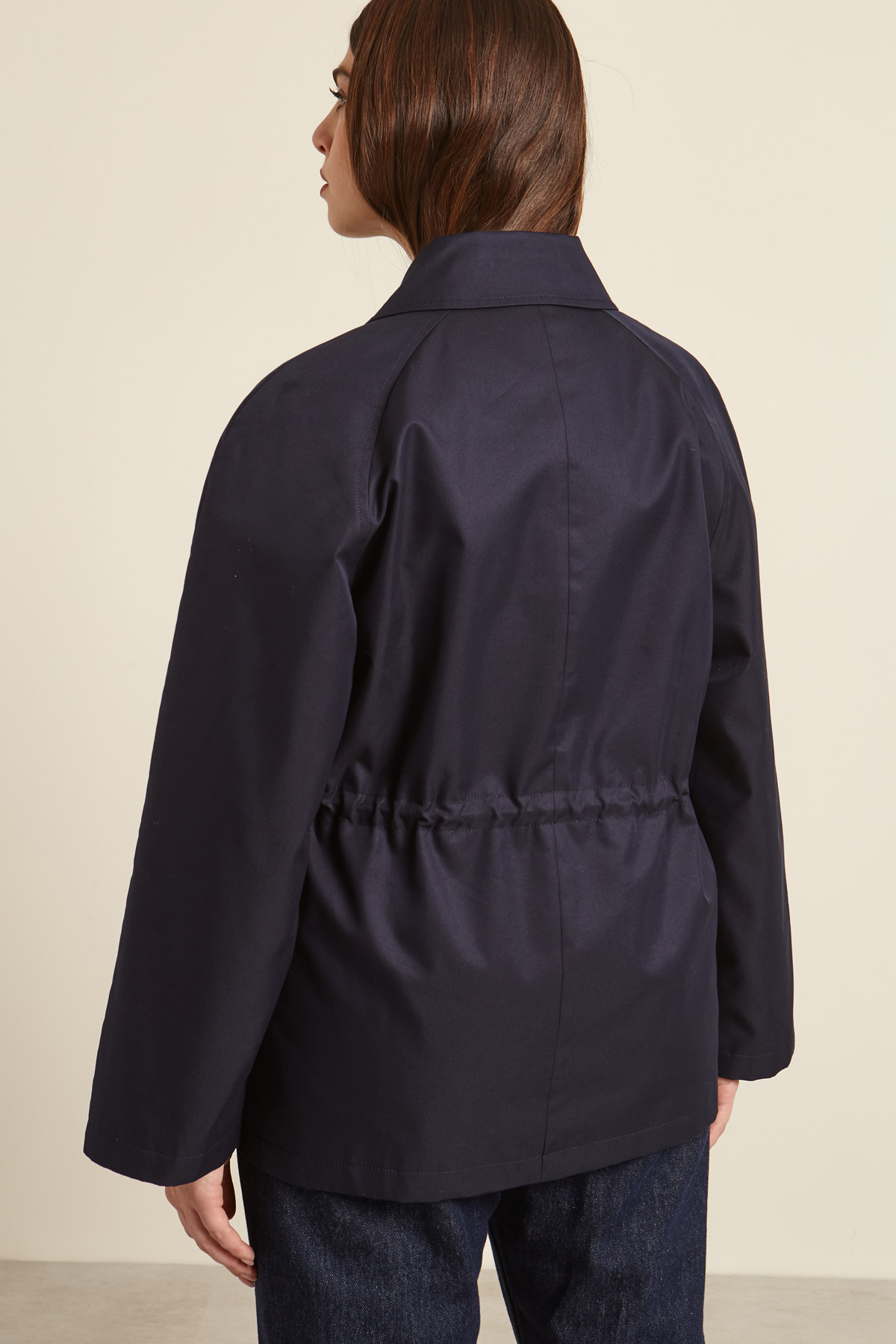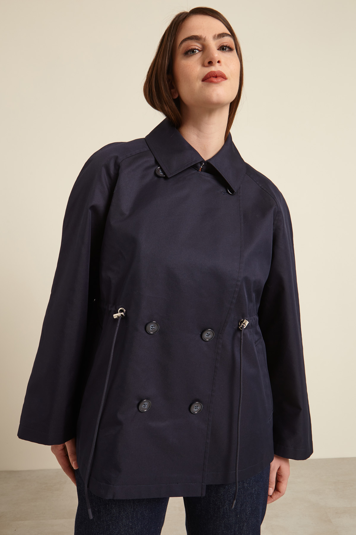 Impermeabile caban dalla linea dritta realizzato in tessuto di misto cotone antigoccia con colletto a camicia, rever sovrapposti, maniche lunghe raglan, dettaglio coulisse in vita con cordini regolabili e tasche a filettone. Chiusura tramite bottoni e uncinello nel colletto. Capo foderato.