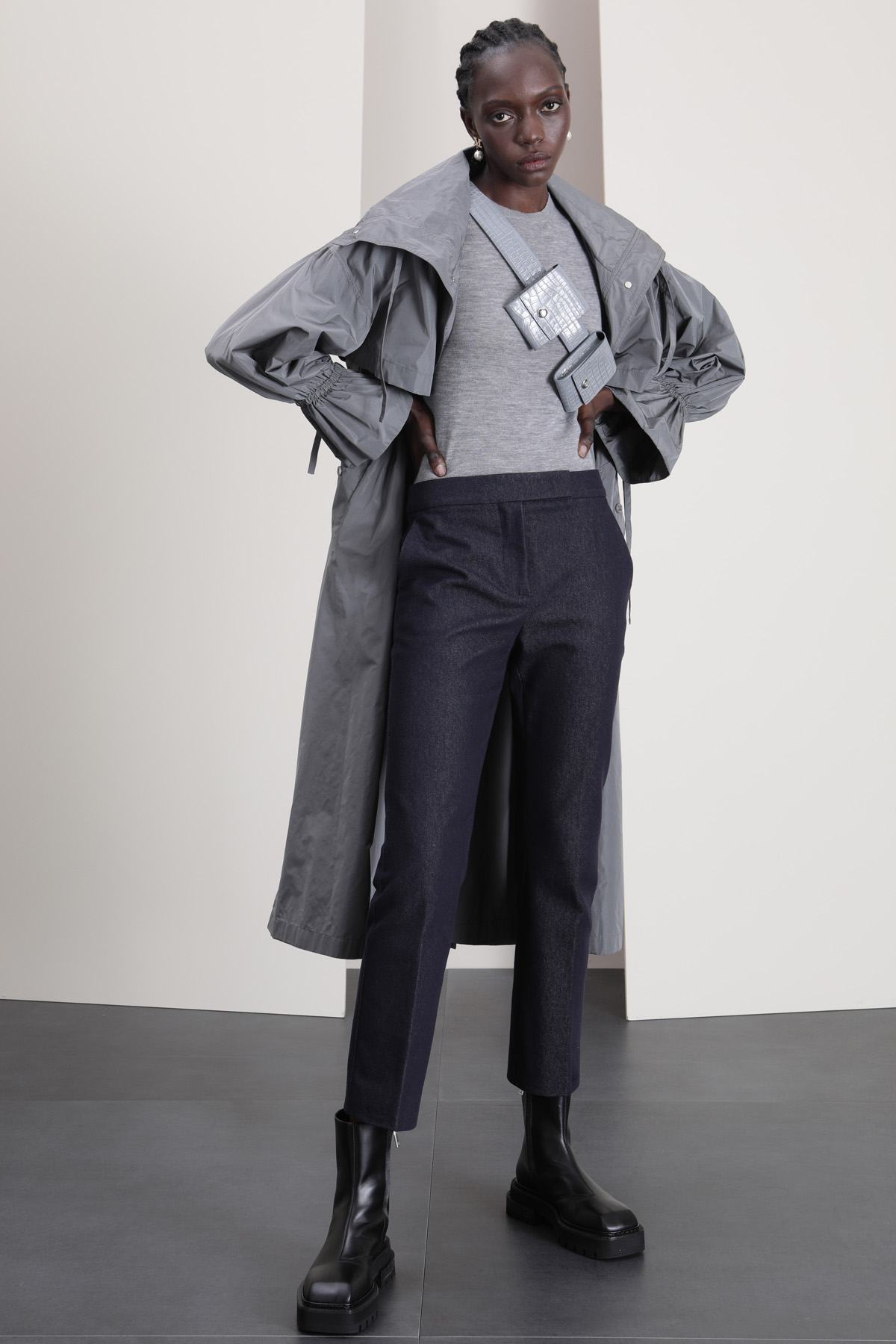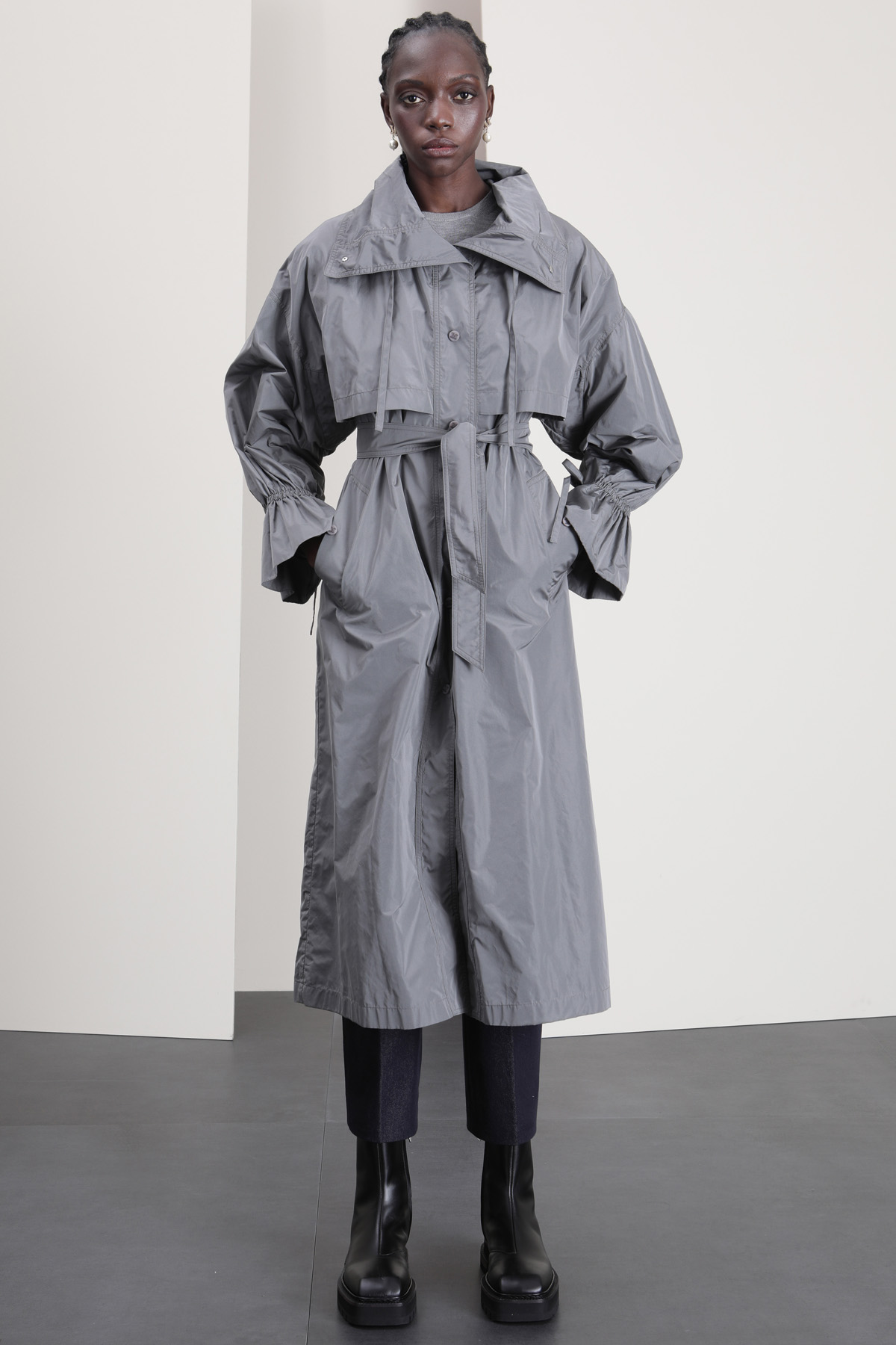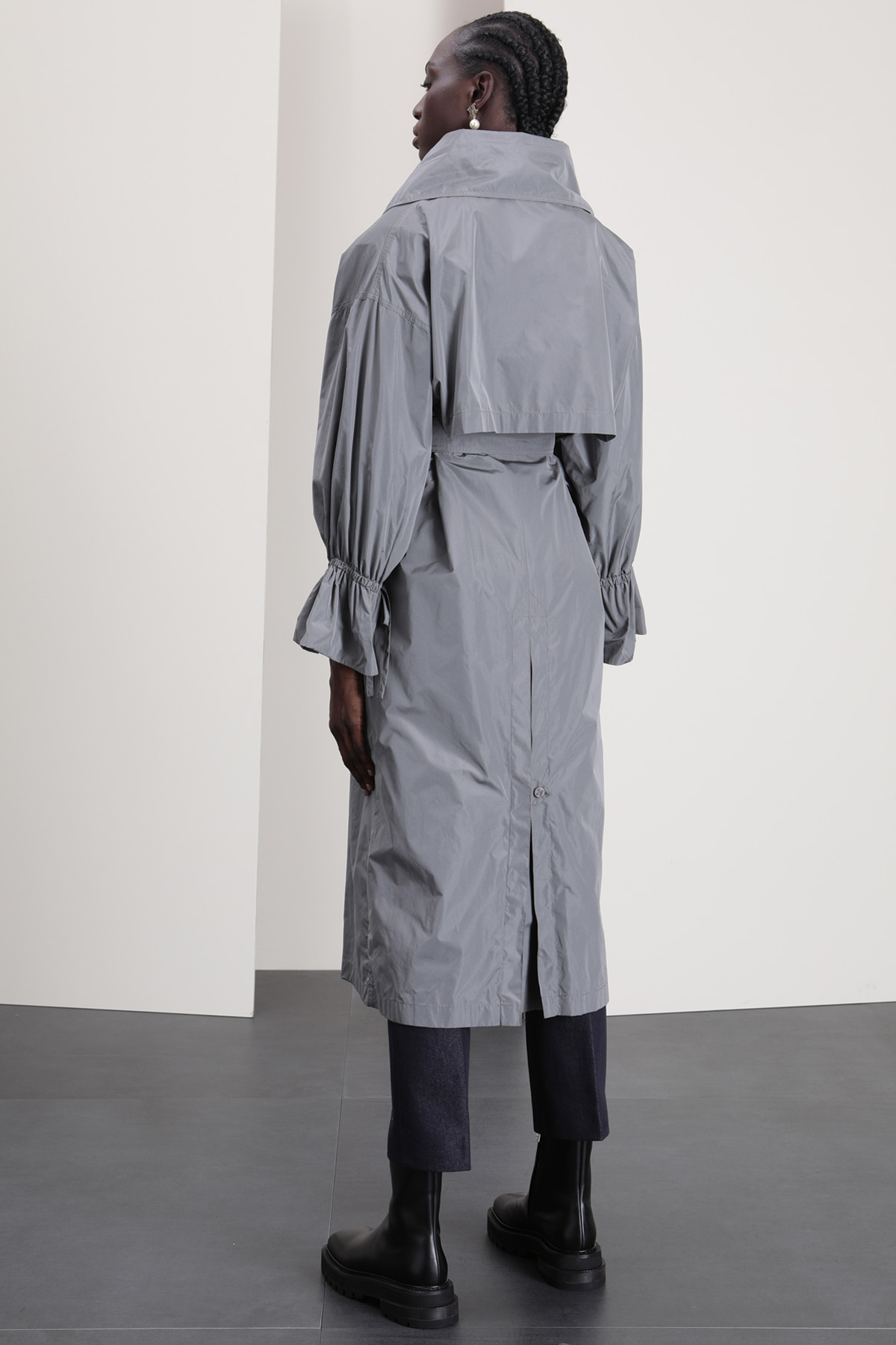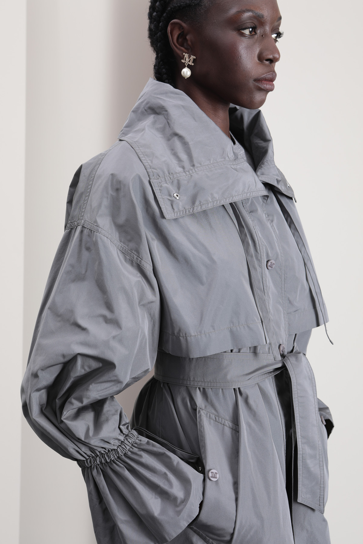 Impermeabile dalla linea morbida realizzato in taffetà antigoccia, con collo alto, maniche lunghe con inserto elastico, coulisse al collo e al polso, tasche oblique a filettone con bottone, allacciatura tramite bottoni automatici e cintura coordinata. Capo sfoderato.