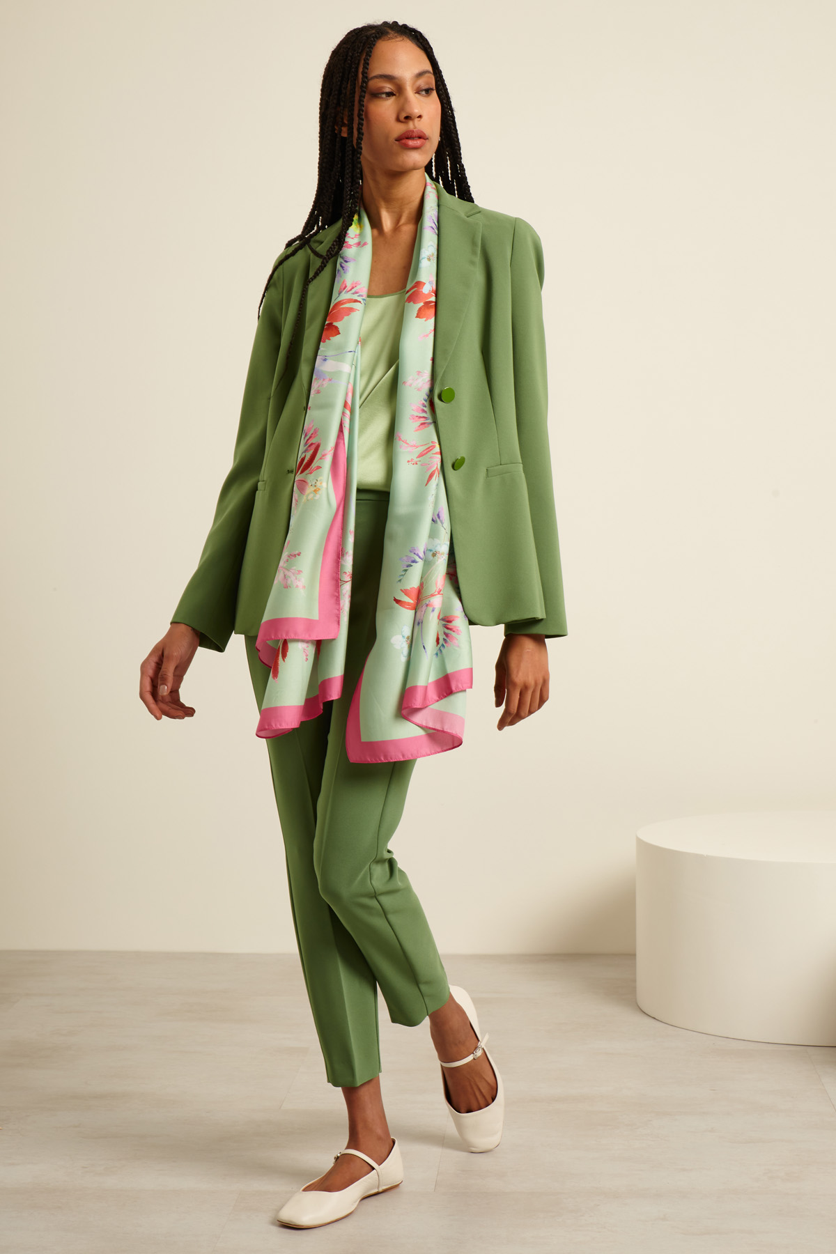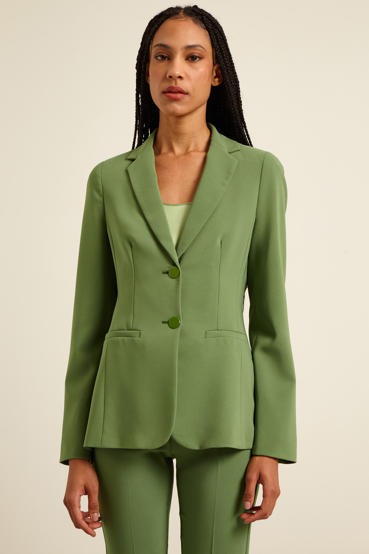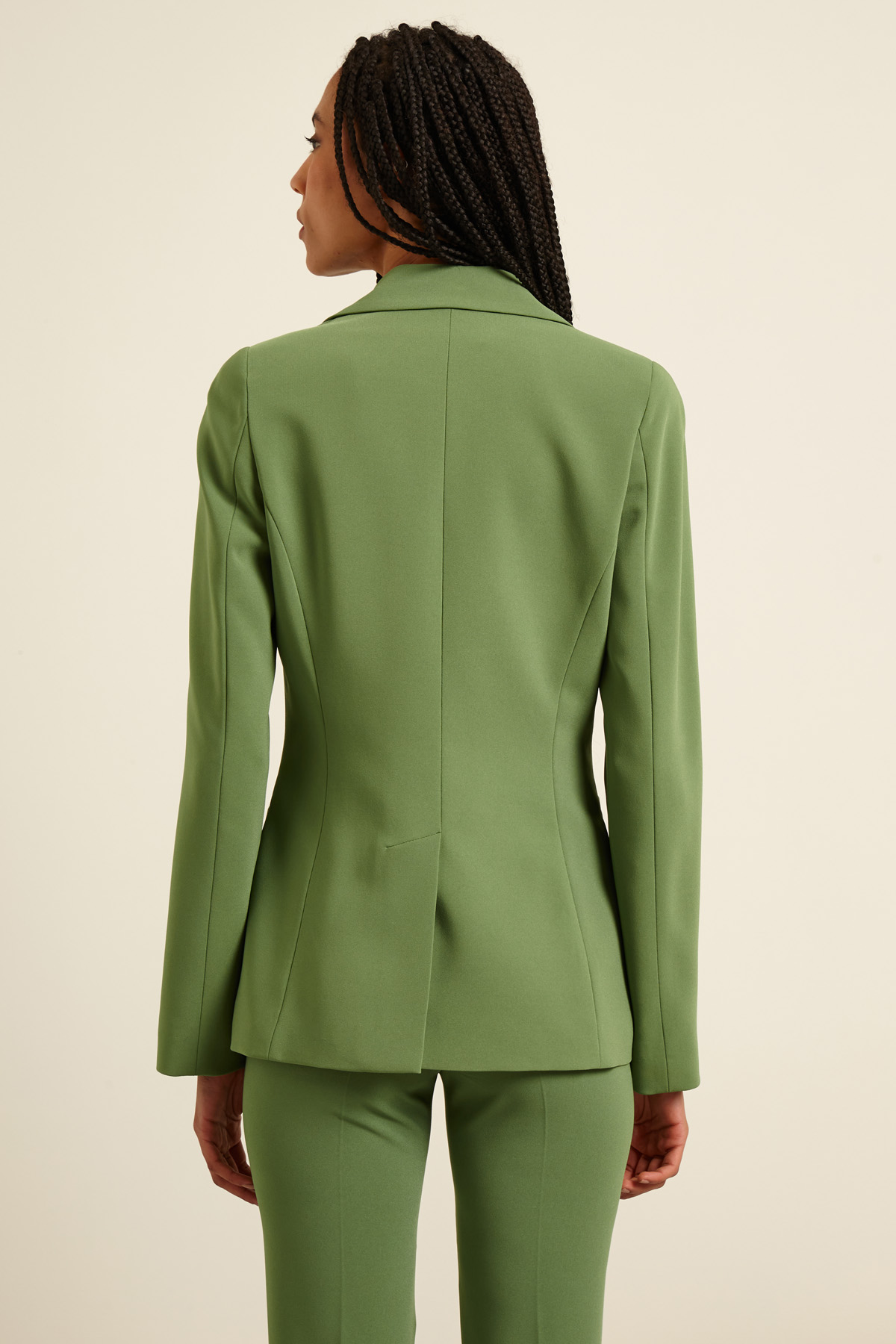 Blazer semiaderente realizzato in cady stretch, con collo a rever, maniche lunghe, tasche a filetto e spacco nel retro. Allacciatura monopetto tramite bottoni. Foderato.