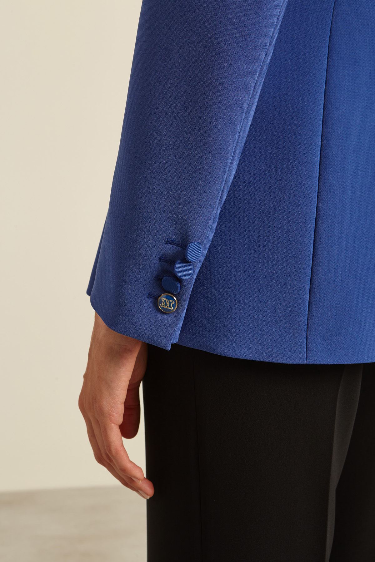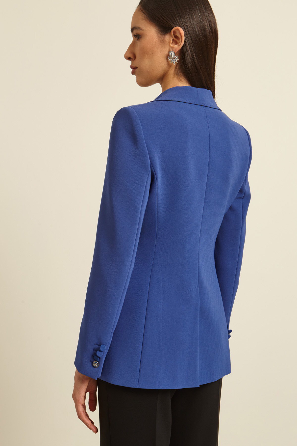 Blazer dalla linea dritta realizzato in cady con inserti in faille, collo a rever, maniche lunghe con bottoni al fondo, tasche a doppio filetto con patta, spacco nel retro e profili rifiniti a puntino. Allacciatura monopetto tramite bottone. Foderato.