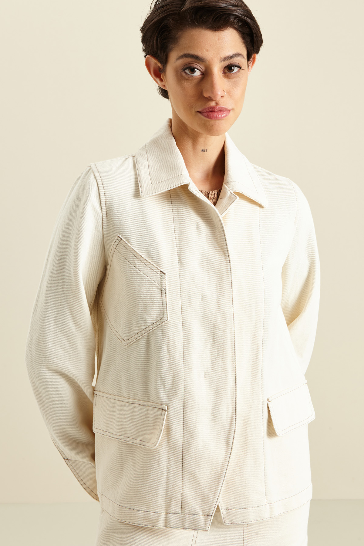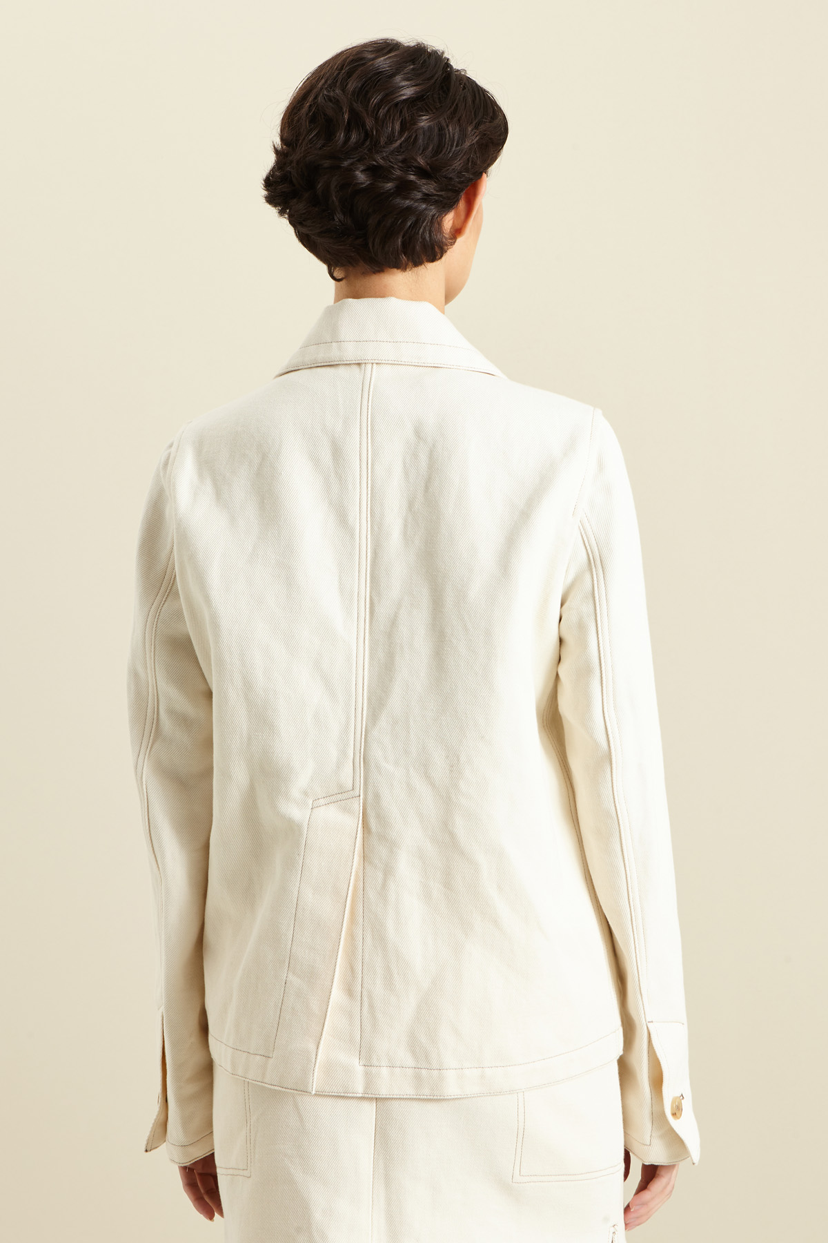 Giacca corta dalla linea dritta realizzata in drill di cotone e lino, con impunture a contrasto, collo a camicia, spacco e bottone al polso, tasche a filetto con patta e chiusura coperta a bottoni. Capo sfoderato.
