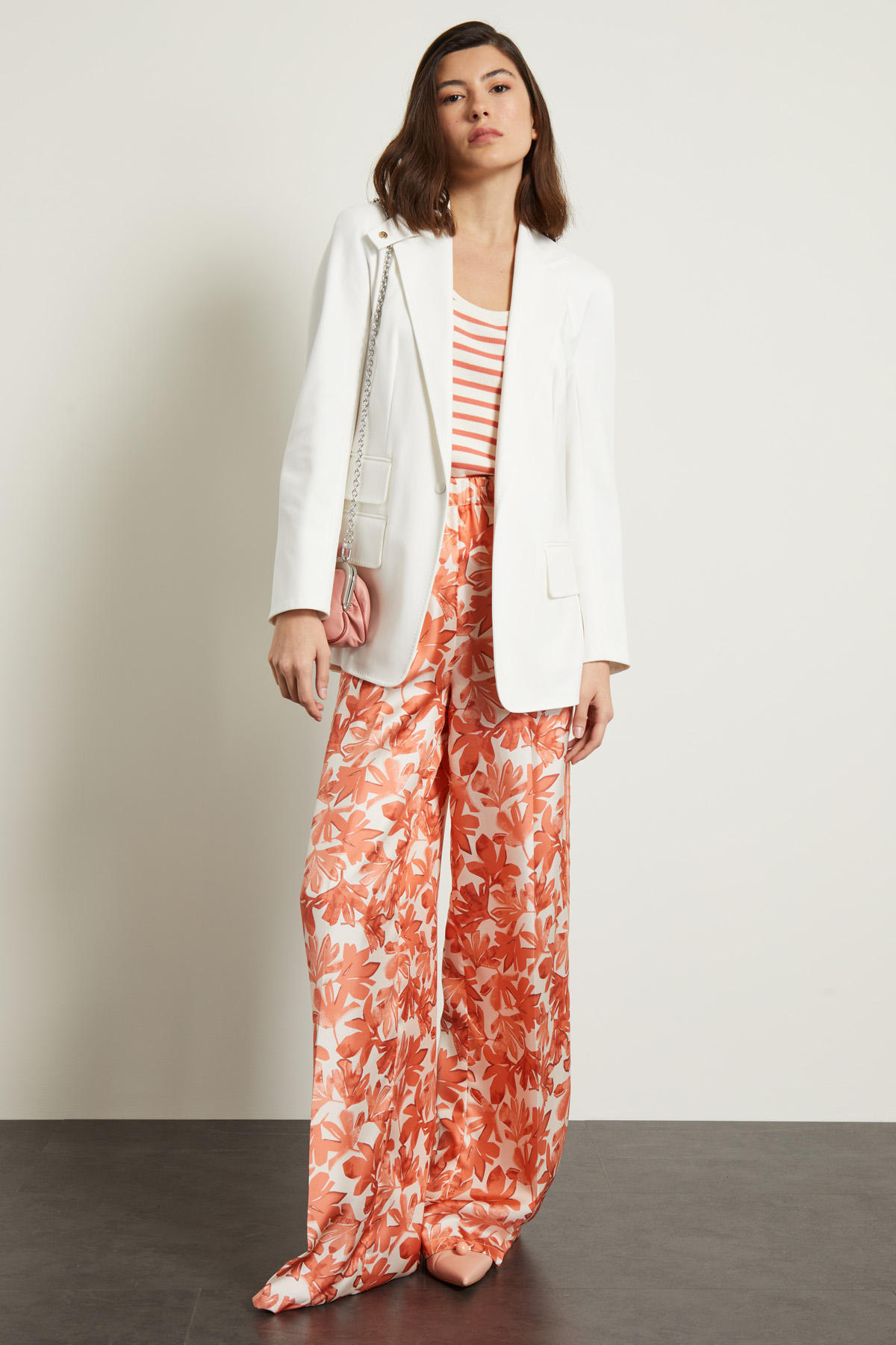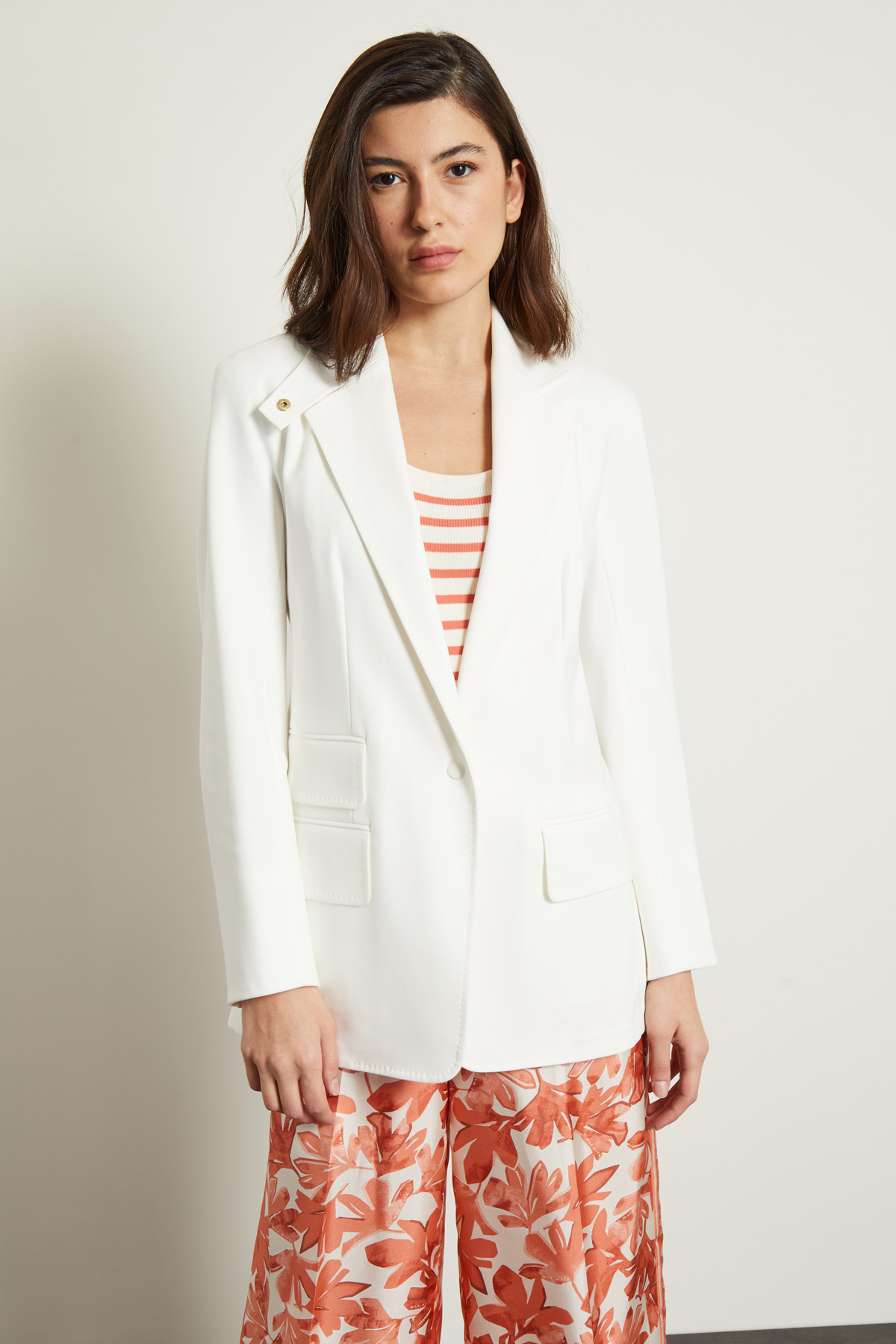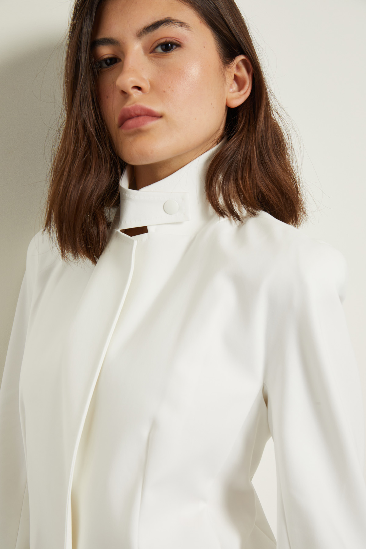 Giacca dalla linea sfiancata realizzata in levantina doppia di cotone stretch, collo alto con bottone automatico, maniche lunghe a kimono, tasche a doppio filetto con patta, spacchi laterali al fondo e profili rifiniti a puntino. Allacciatura monopetto tramite bottone automatico. Semifoderato.