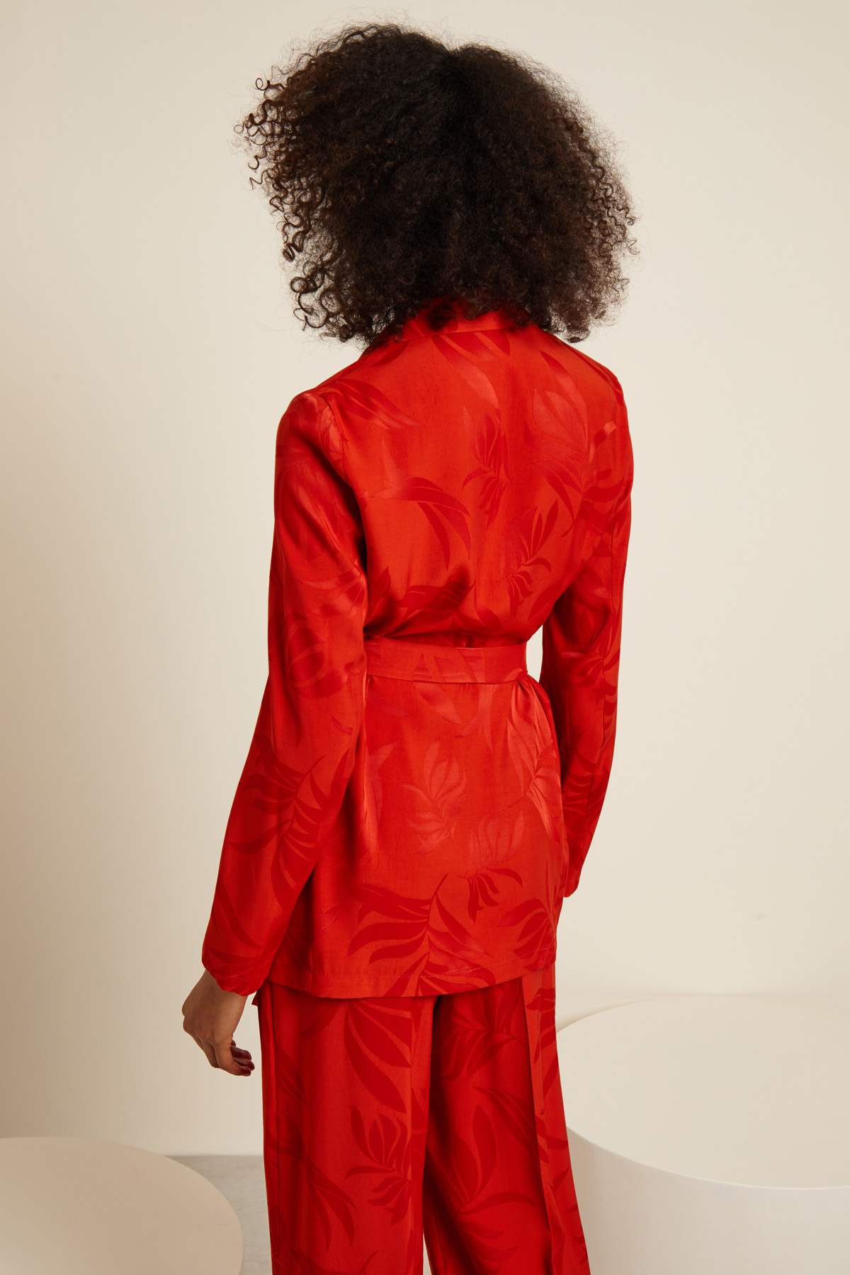 Blazer dalla linea morbida realizzato in tessuto jacquard di viscosa, con collo rever e maniche lunghe. Allacciatura monopetto tramite bottone e cintura coordinata. Sfoderato.
