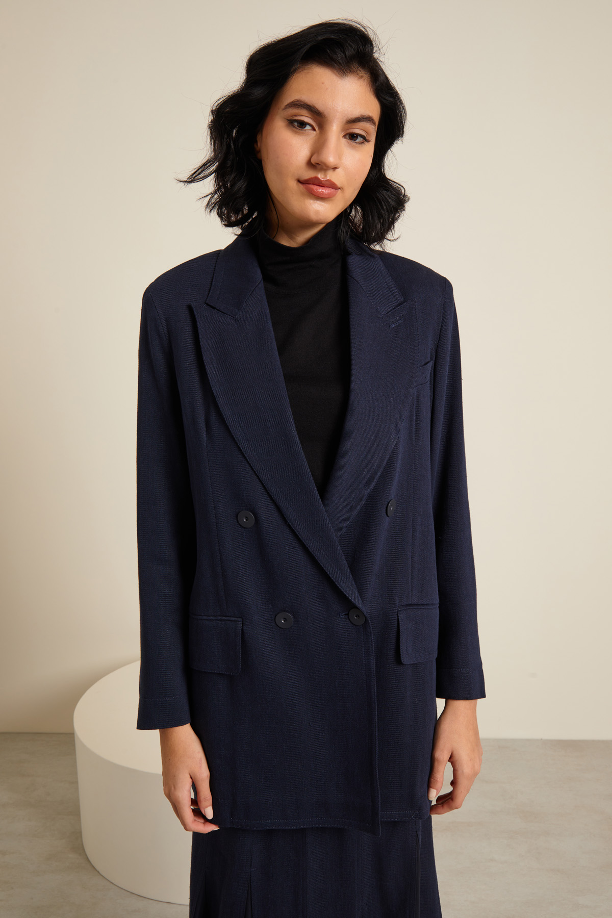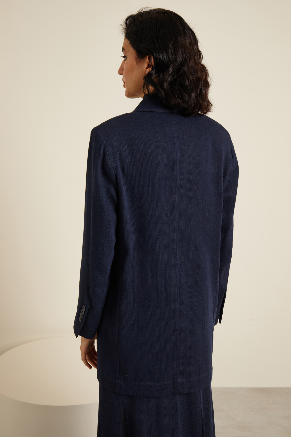 Blazer lungo dalla linea dritta realizzato in bull di lino e cotone, con collo a rever, maniche lunghe con bottoni al fondo, taschino a filettone, tasche a doppio filetto con patta. Allacciatura doppiopetto tramite bottoni. Semifoderato.