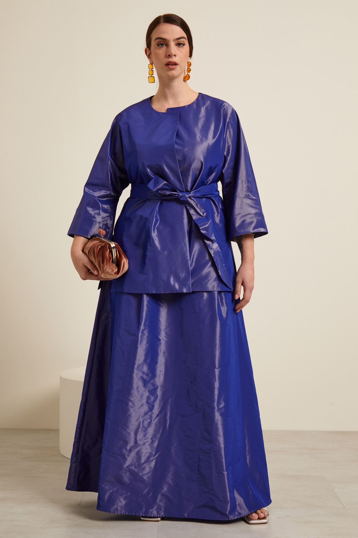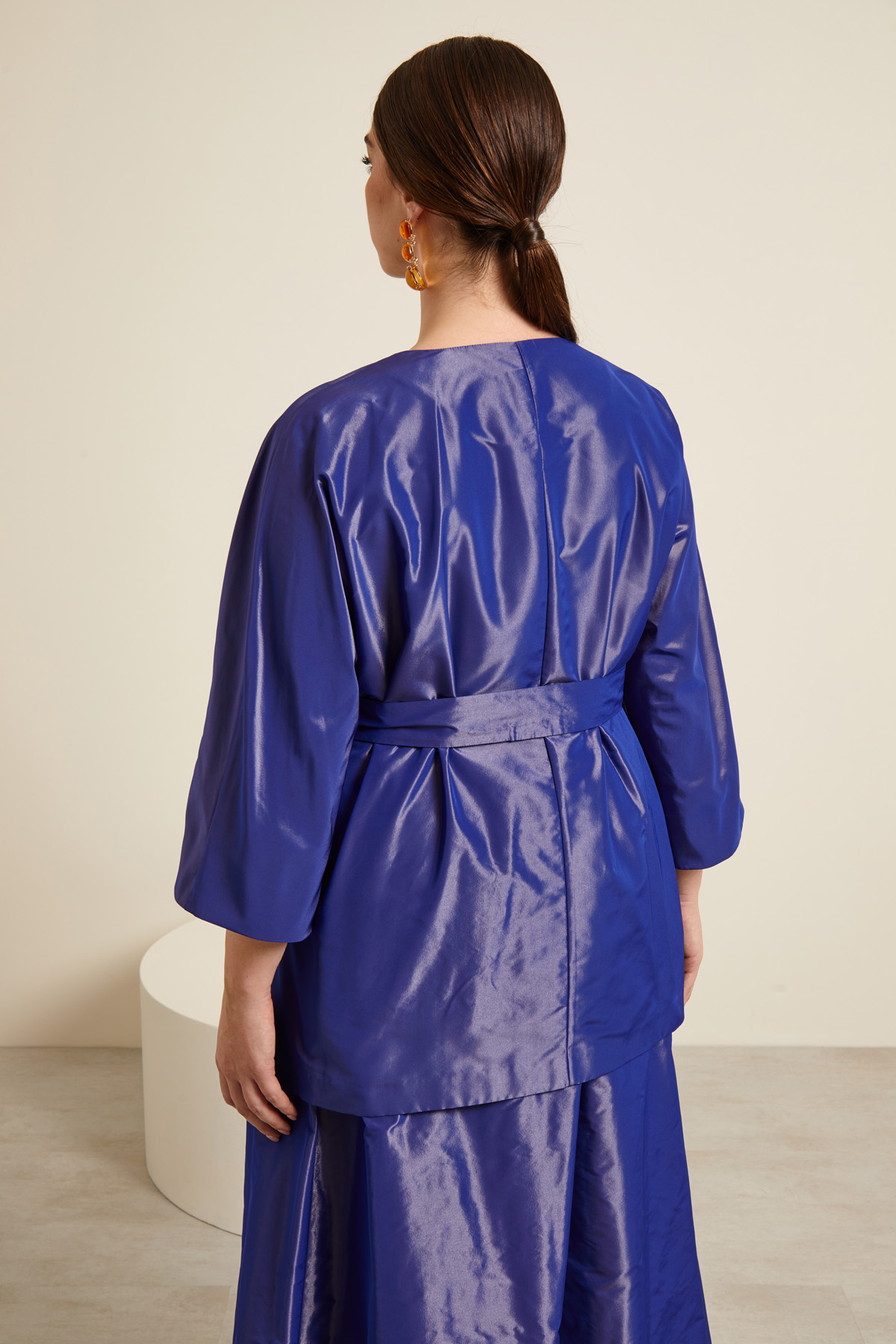 Spolverino dalla linea leggermente svasata realizzato in taffetà, con scollo a giro, maniche kimono a tre quarti, spacchi laterali al fondo e allacciatura tramite cintura coordinata. Capo sfoderato.