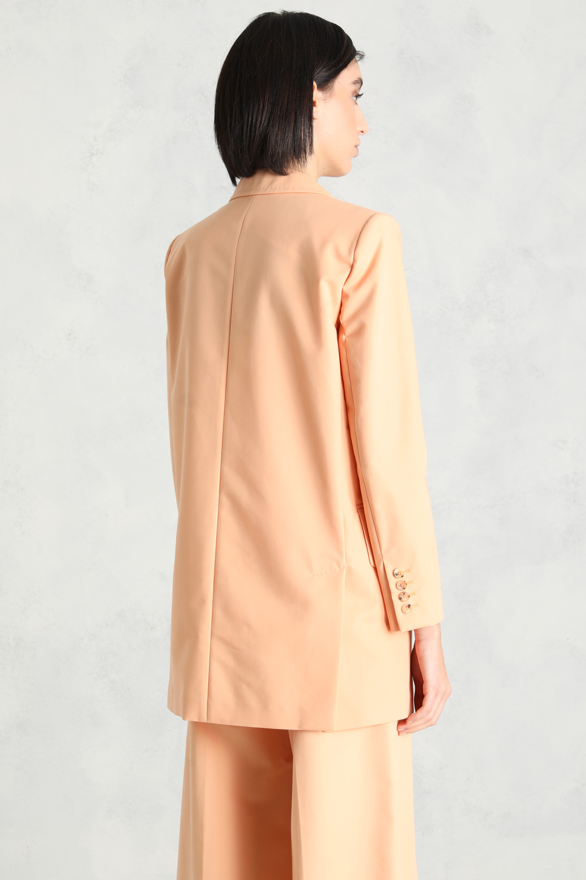 Blazer dalla linea dritta realizzato in gabardine antigoccia di misto cotone, con rifinitura a puntino, collo a rever e maniche lunghe con bottoni al fondo. Modello con taschino e tasche a battente, spacchi laterali nel retro e allacciatura monopetto tramite bottone. Sfoderato.