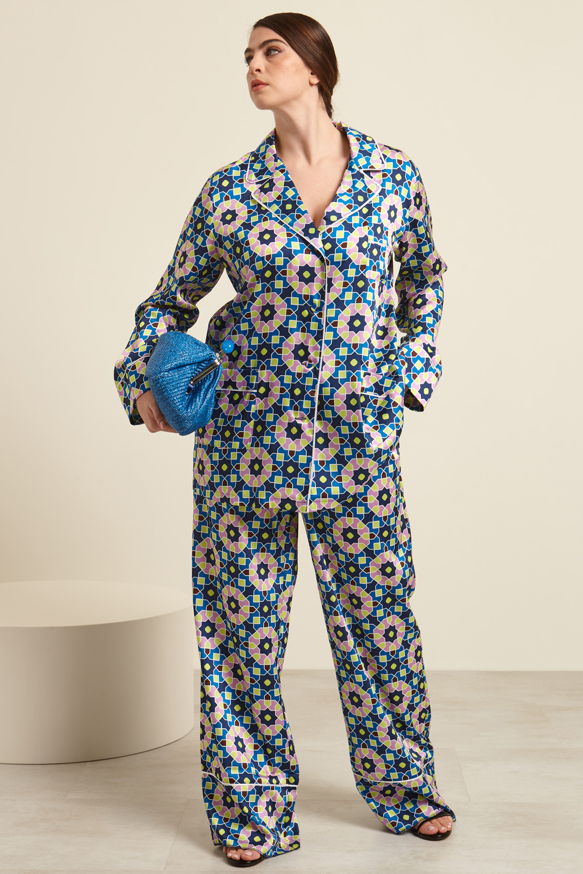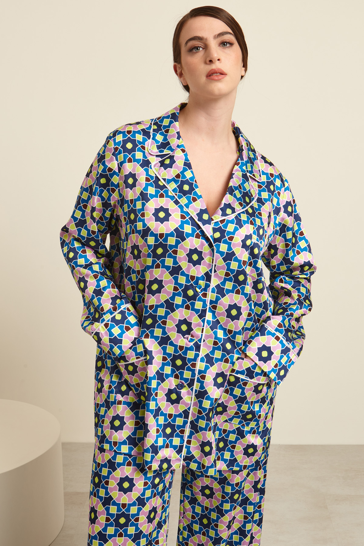 Blazer dalla linea dritta realizzato in twill stampato, con collo a rever, maniche lunghe con polsino, tasche e taschino applicati, profili rifiniti da piping. Allacciatura monopetto tramite bottoni. Sfoderato.