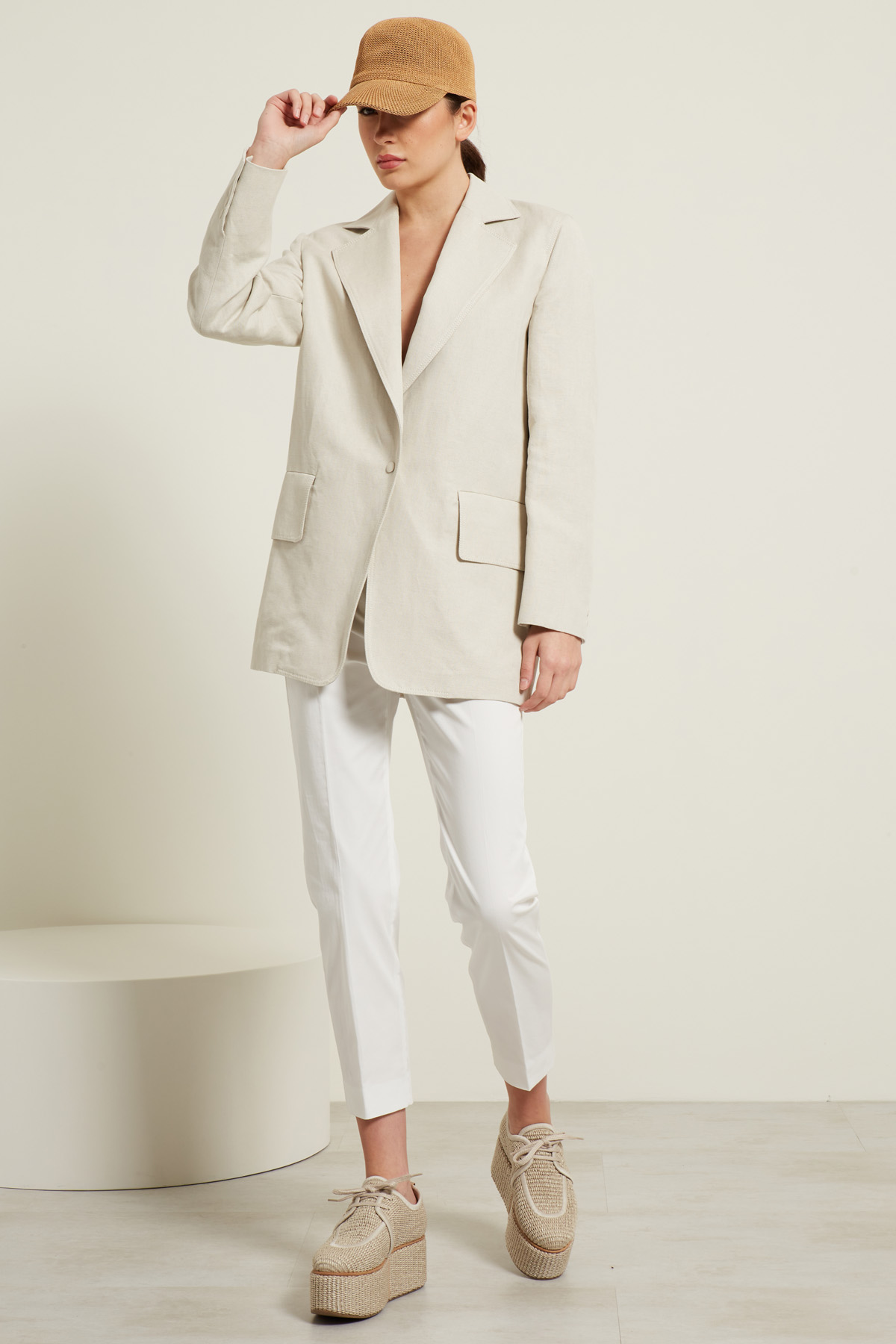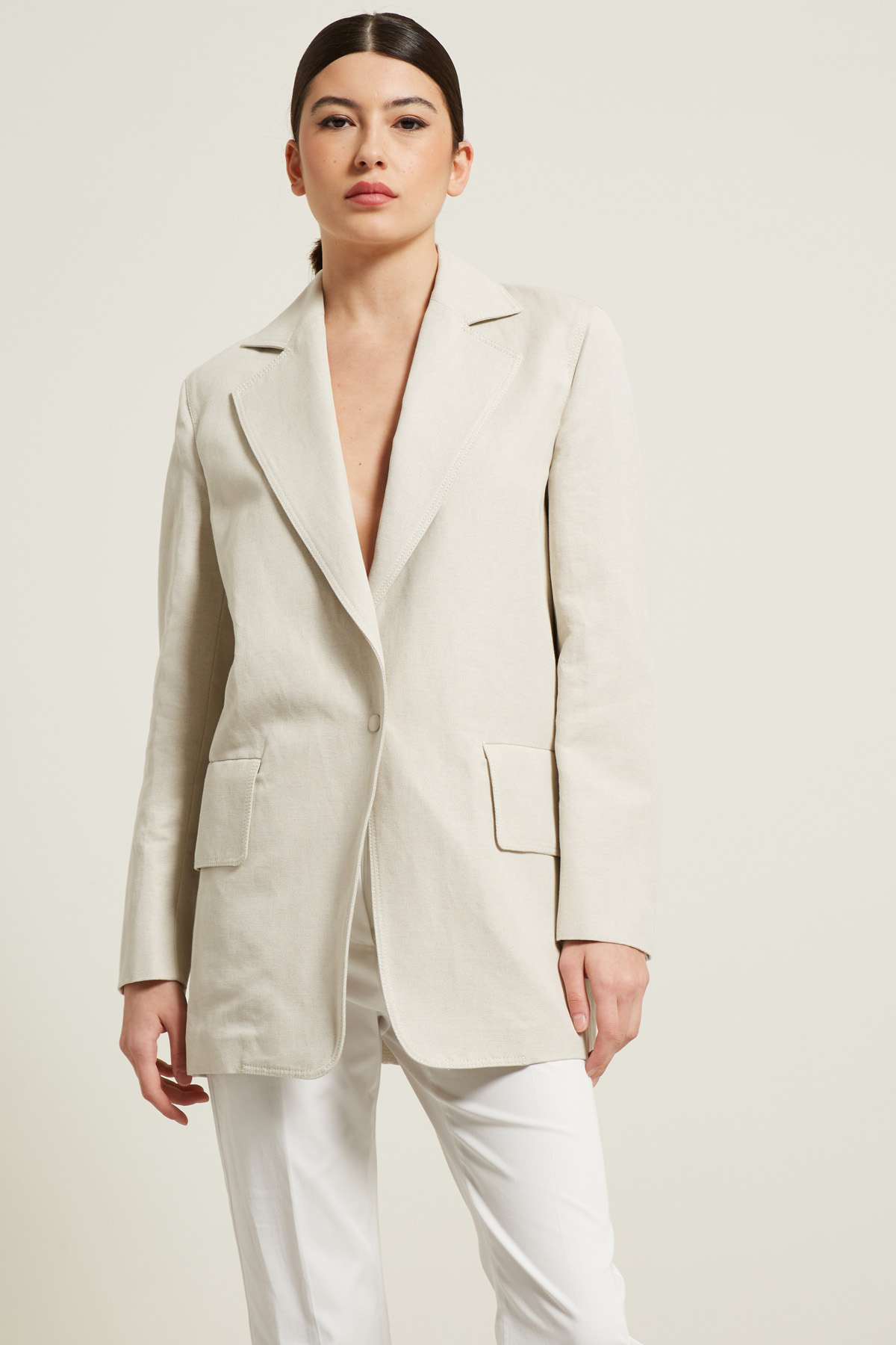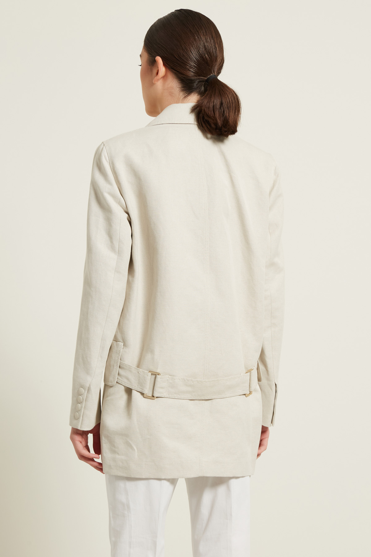 Giacca monopetto dalla linea dritta realizzata tela pesante di misto cotone e lino, con rever, maniche lunghe con spacchetto e bottoni, tasche a filetto con patta e inserto di martingala removibile nel retro. Allacciatura monopetto tramite bottone a pressione. Semifoderato.