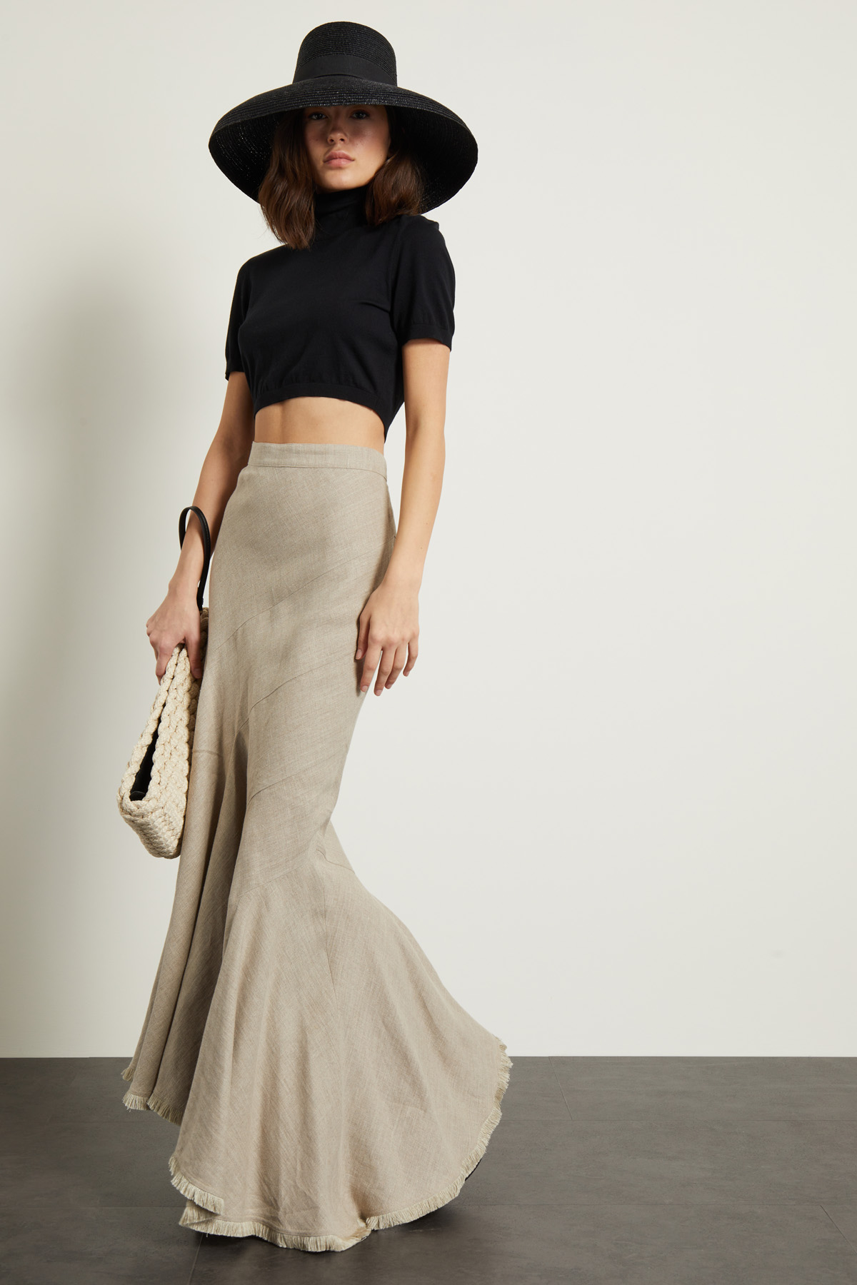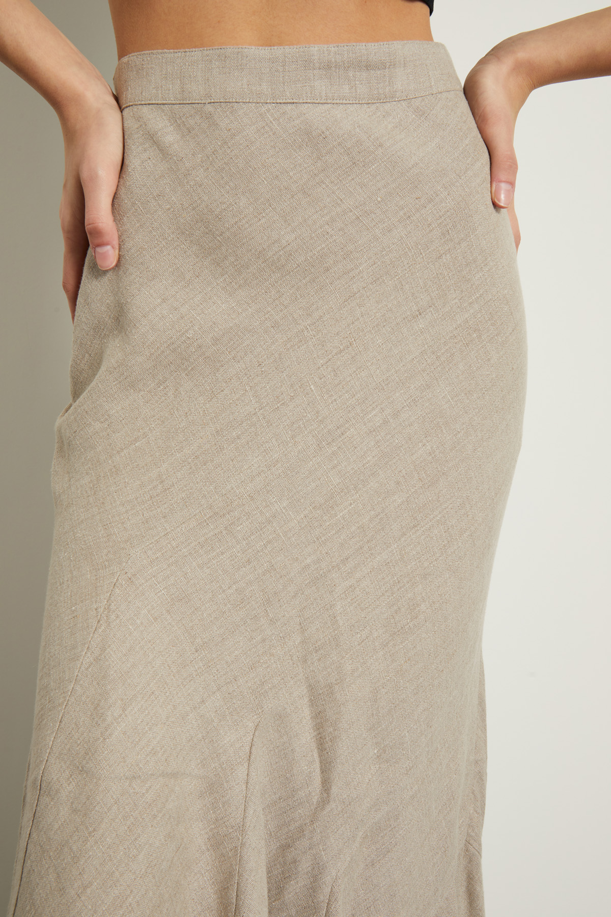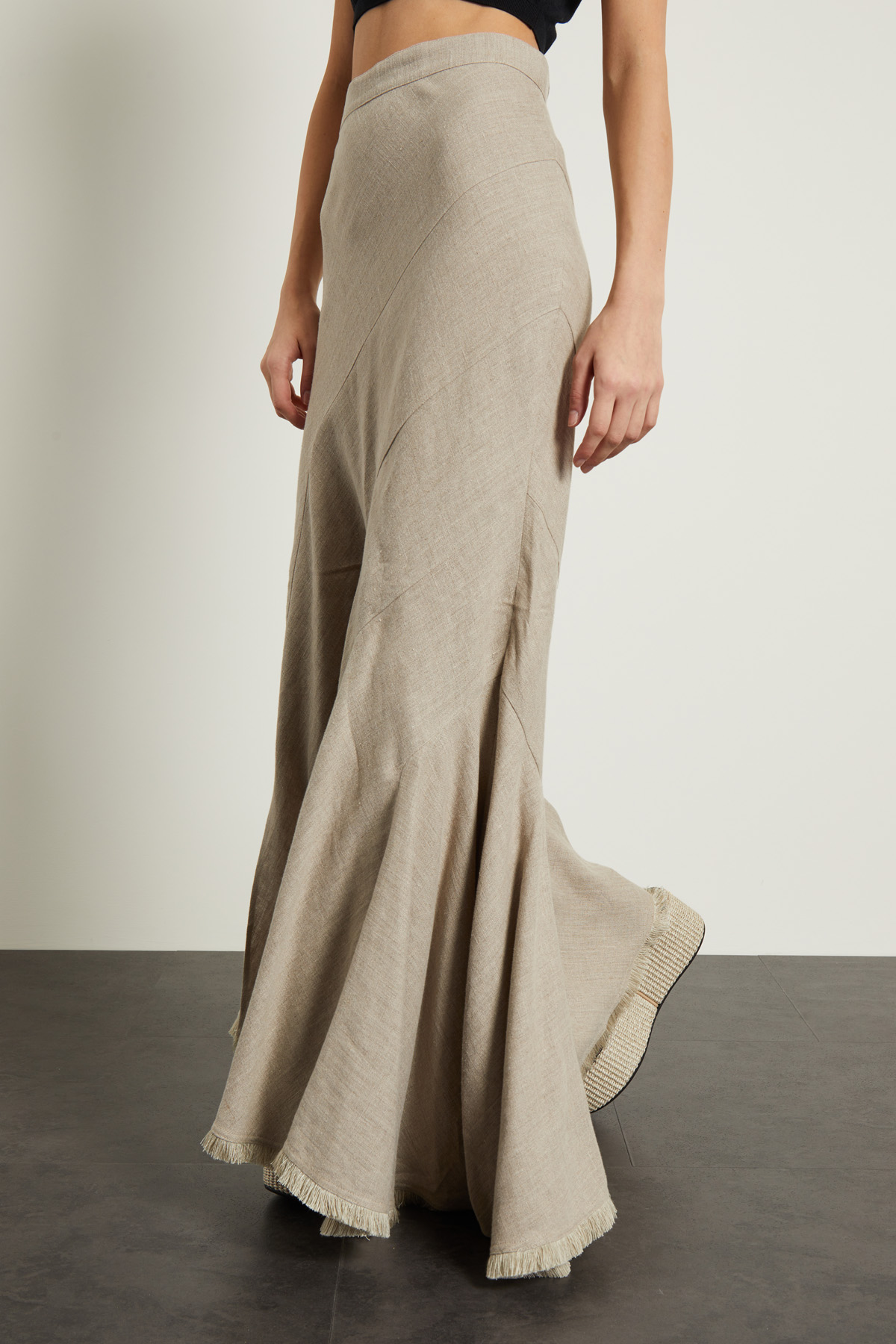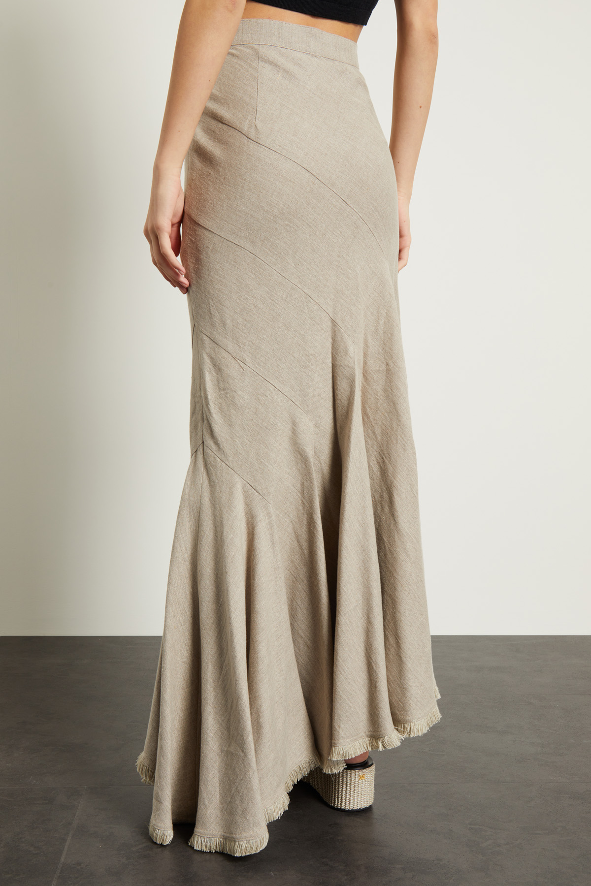 Gonna a sirena realizzata in tela di puro lino, con cintone in vita, fondo asimmetrico, spacco laterale e dettaglio di passamaneria sfrangiata. Chiusura tramite zip invisibile sul fianco.