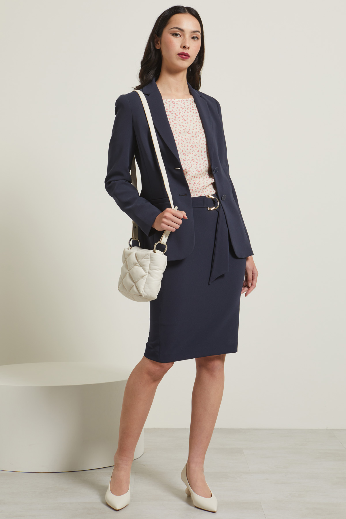 Gonna a tubo dalla linea aderente realizzata in cady stretch, con spacco e allacciatura tramite zip invisibile nel retro. Capo dotato di cintura coordinata con fibbia a scorrimento in metallo. Foderata.