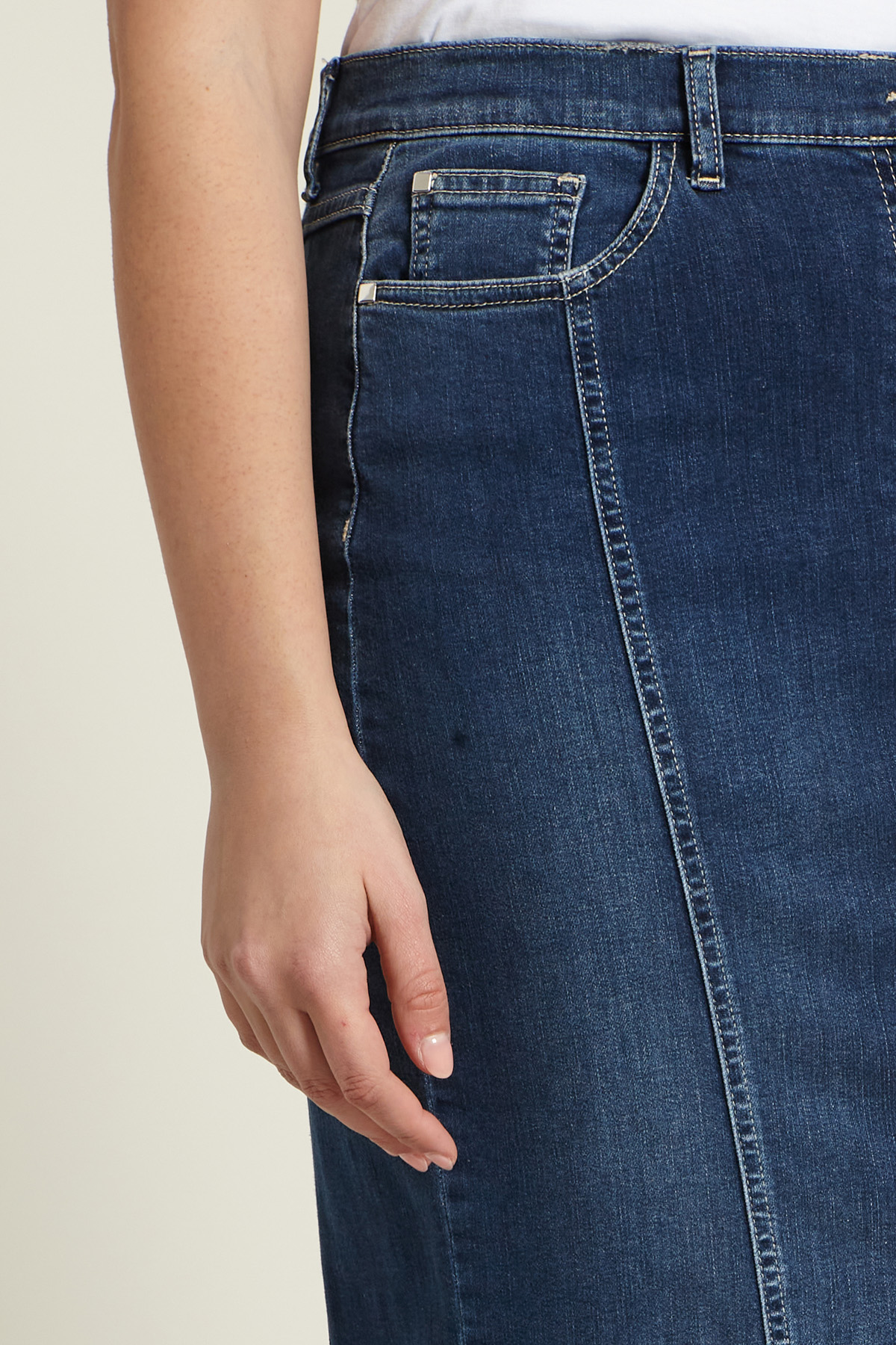 Gonna ia tubino realizzata in denim di cotone stretch, con passanti in vita, cinque tasche e spacco al fondo davanti. Allacciatura tramite zip nascosta e bottone in metallo.