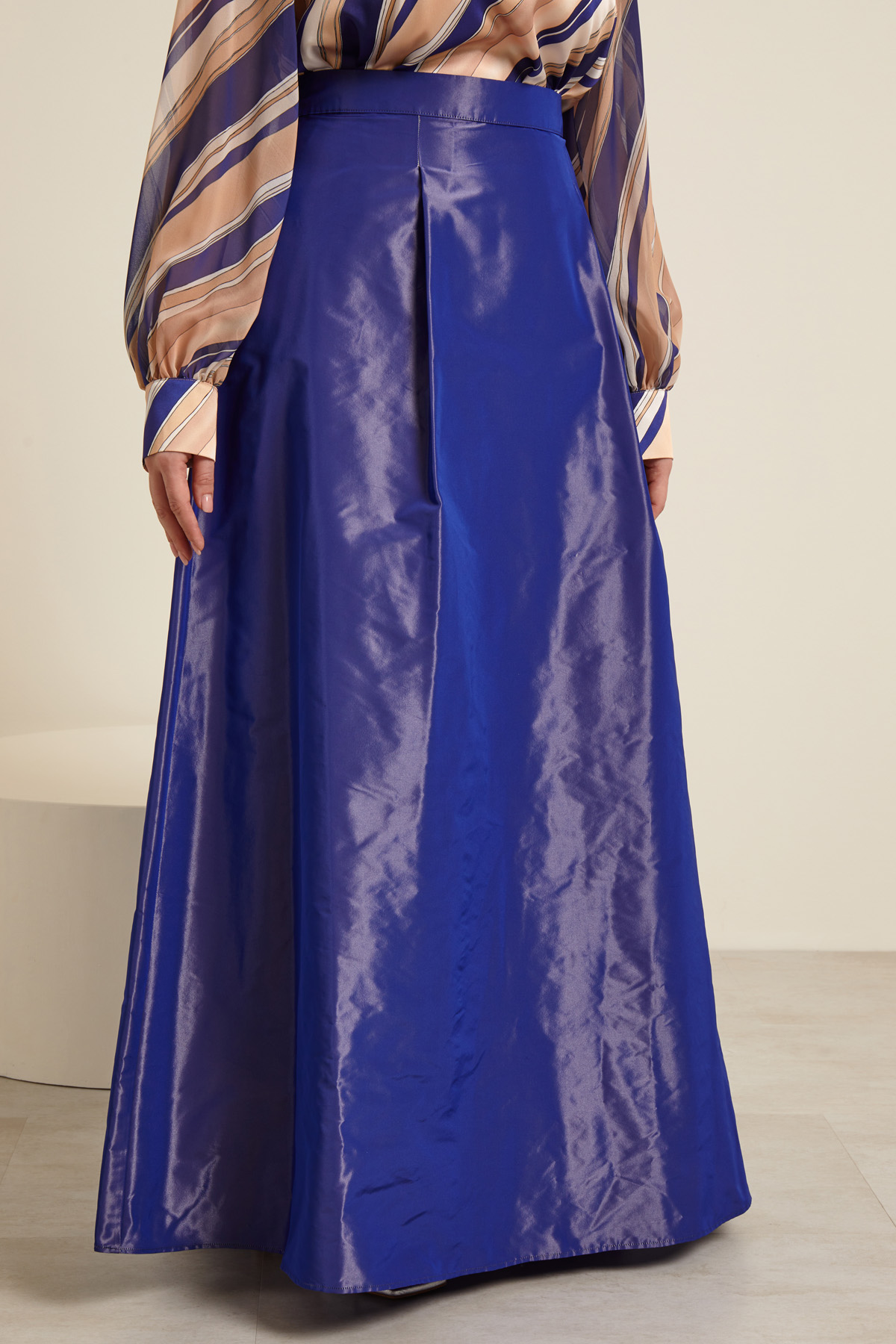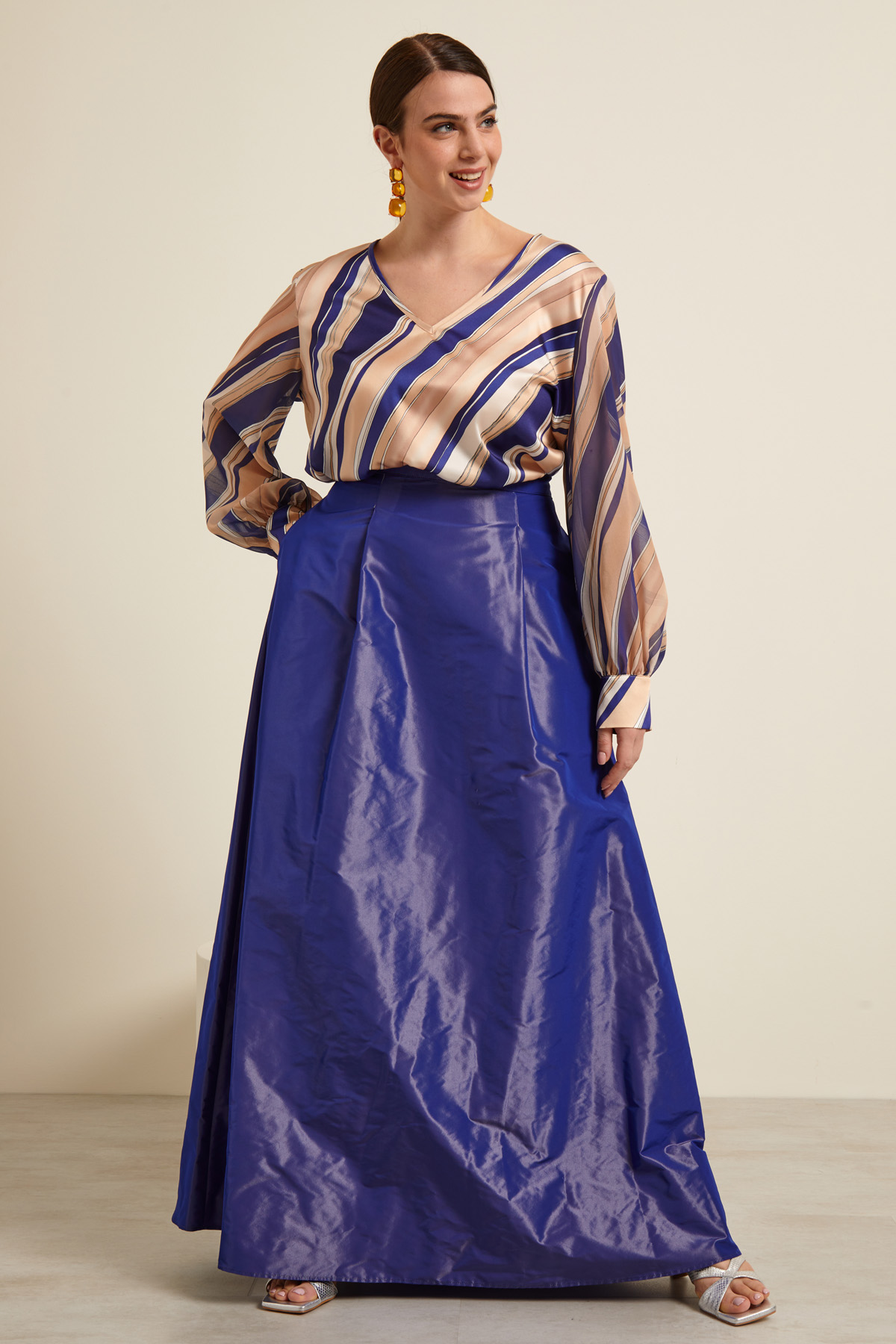 Gonna dalla linea ampia e svasata realizzata in taffetà, con inserto elastico in vita sul retro, tasche laterali inserite in cucitura e allacciatura tramite zip invisibile e bottone.