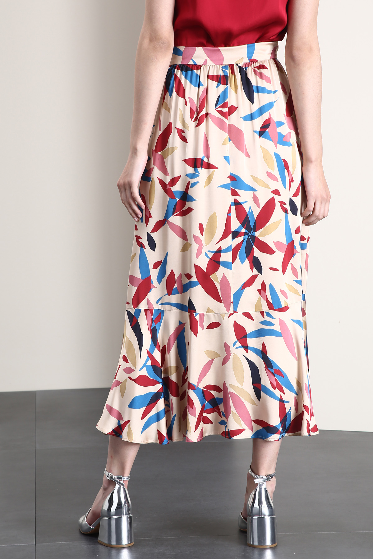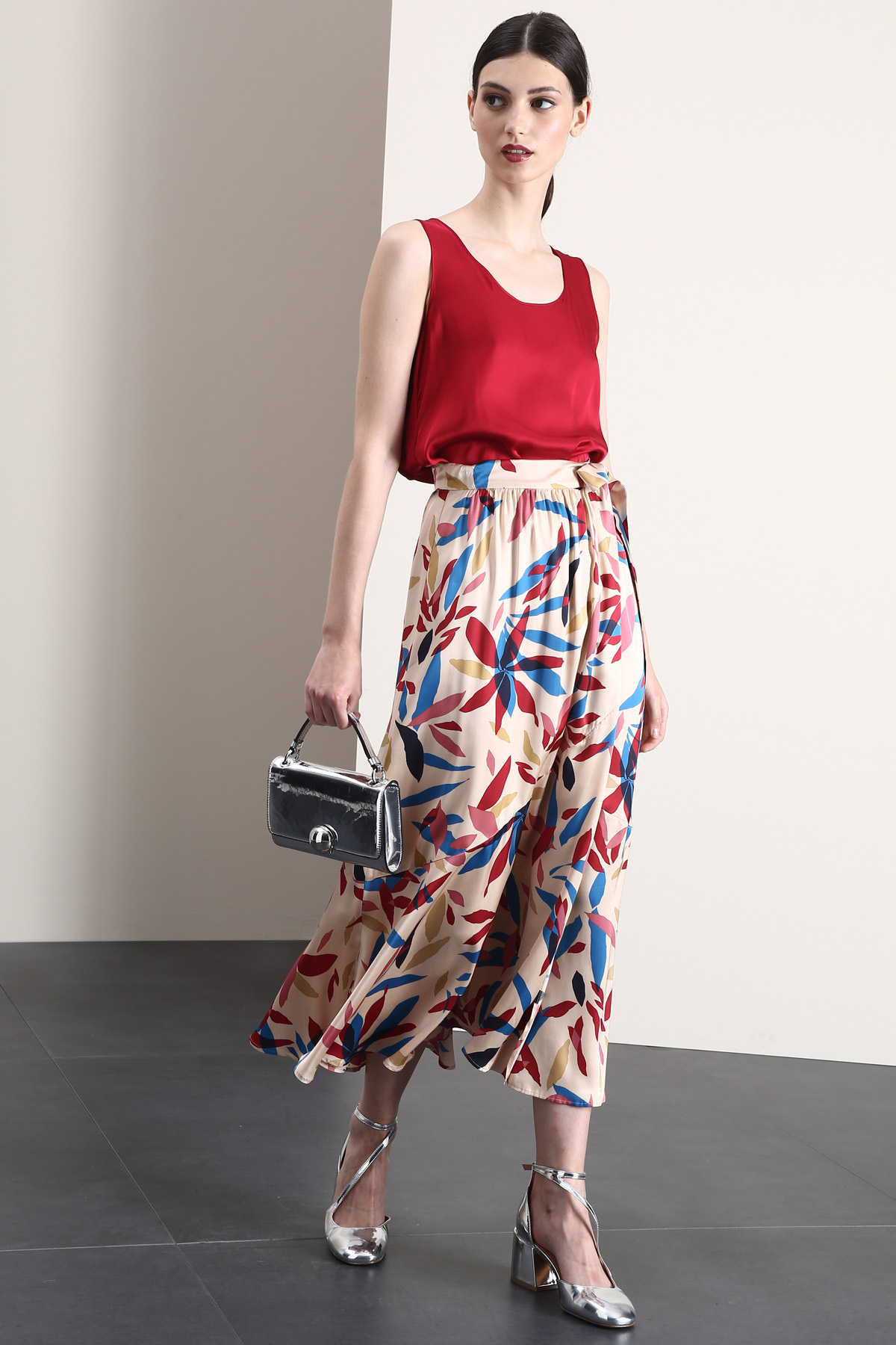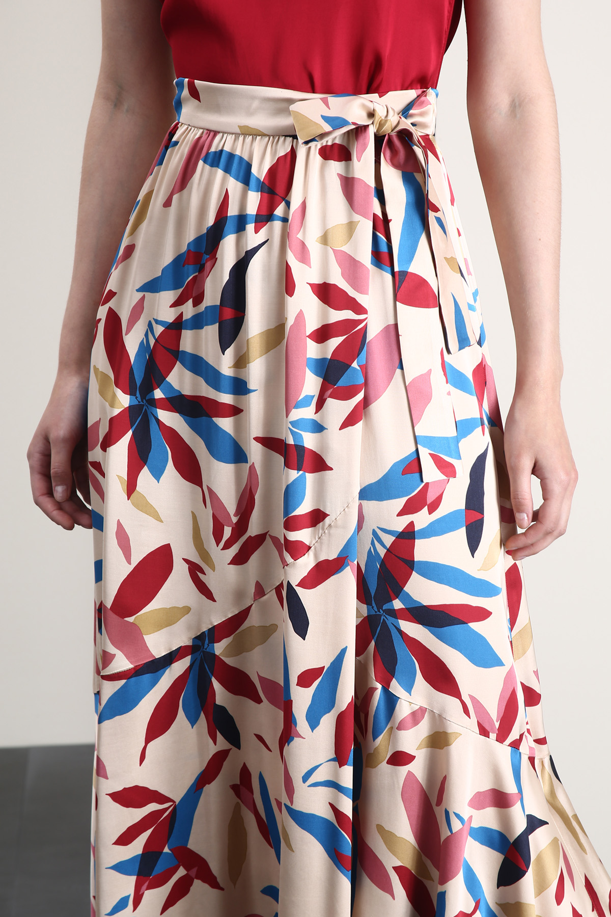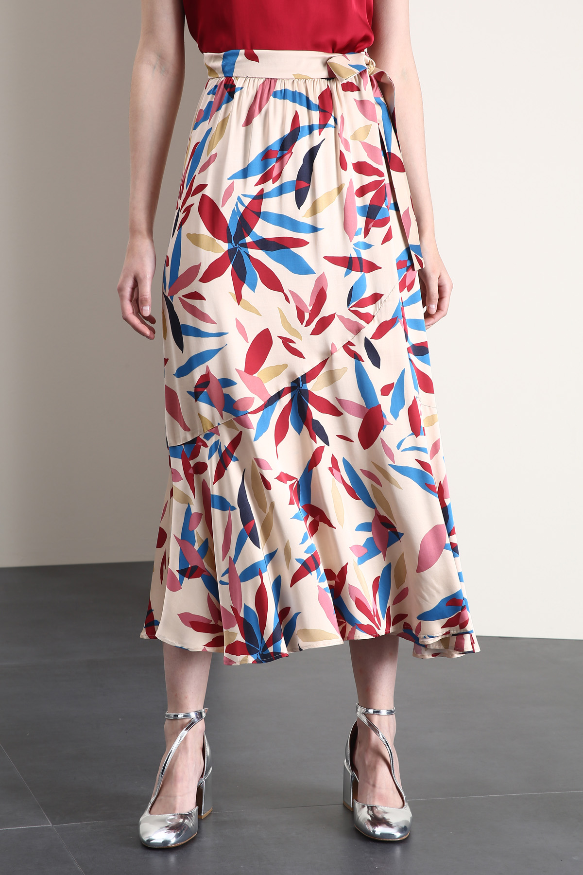 Gonna a portafoglio realizzata in raso di pura viscosa, con arricciatura in vita, balza asimmetrica al fondo e allacciatura tramite bottoni e nastri da annodare.