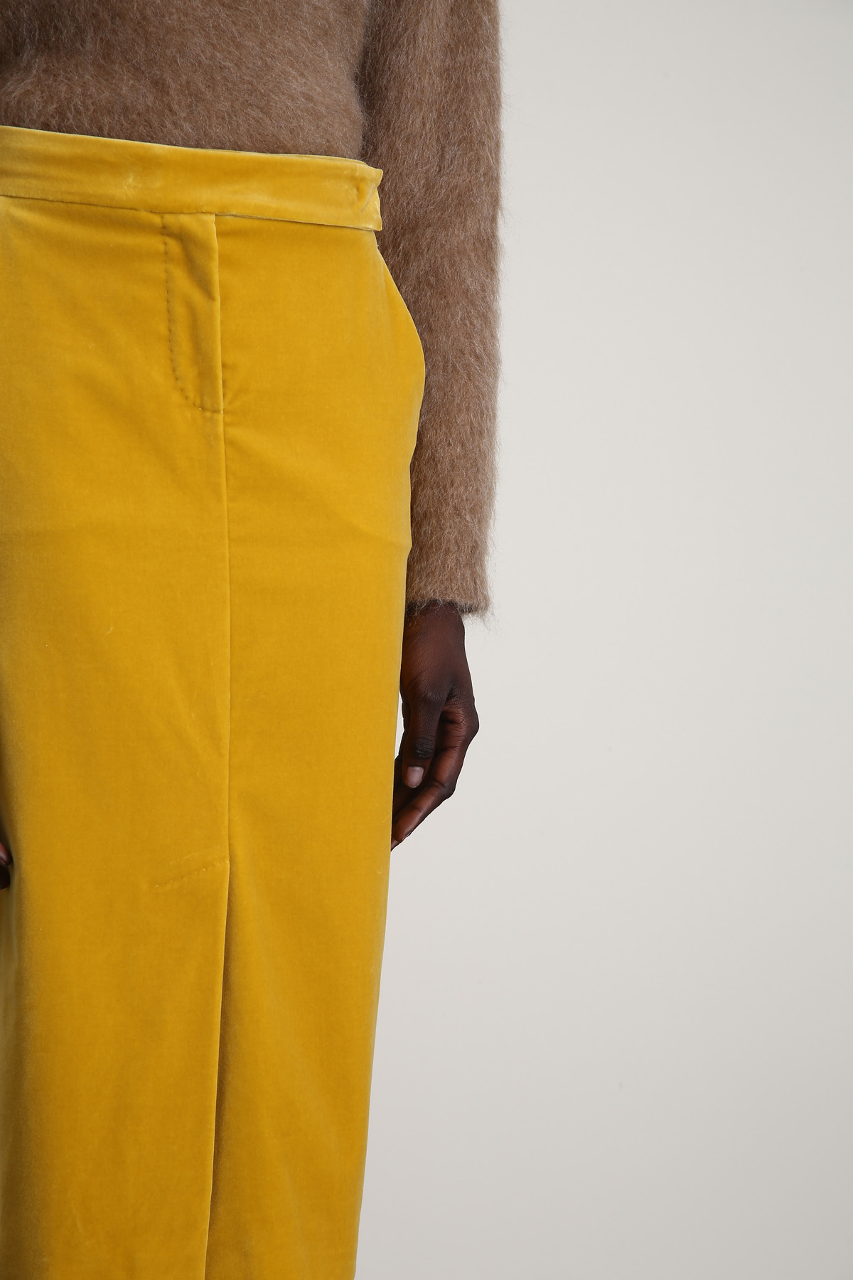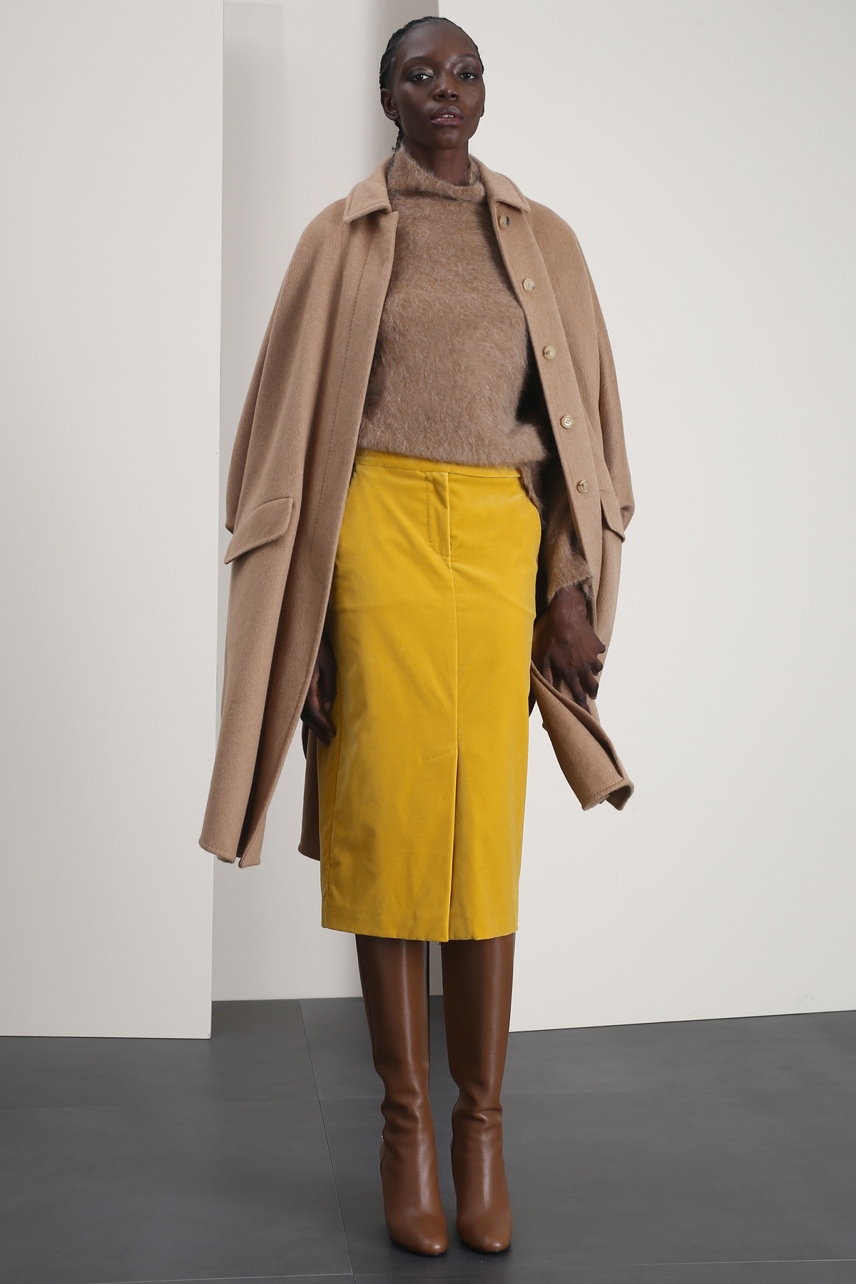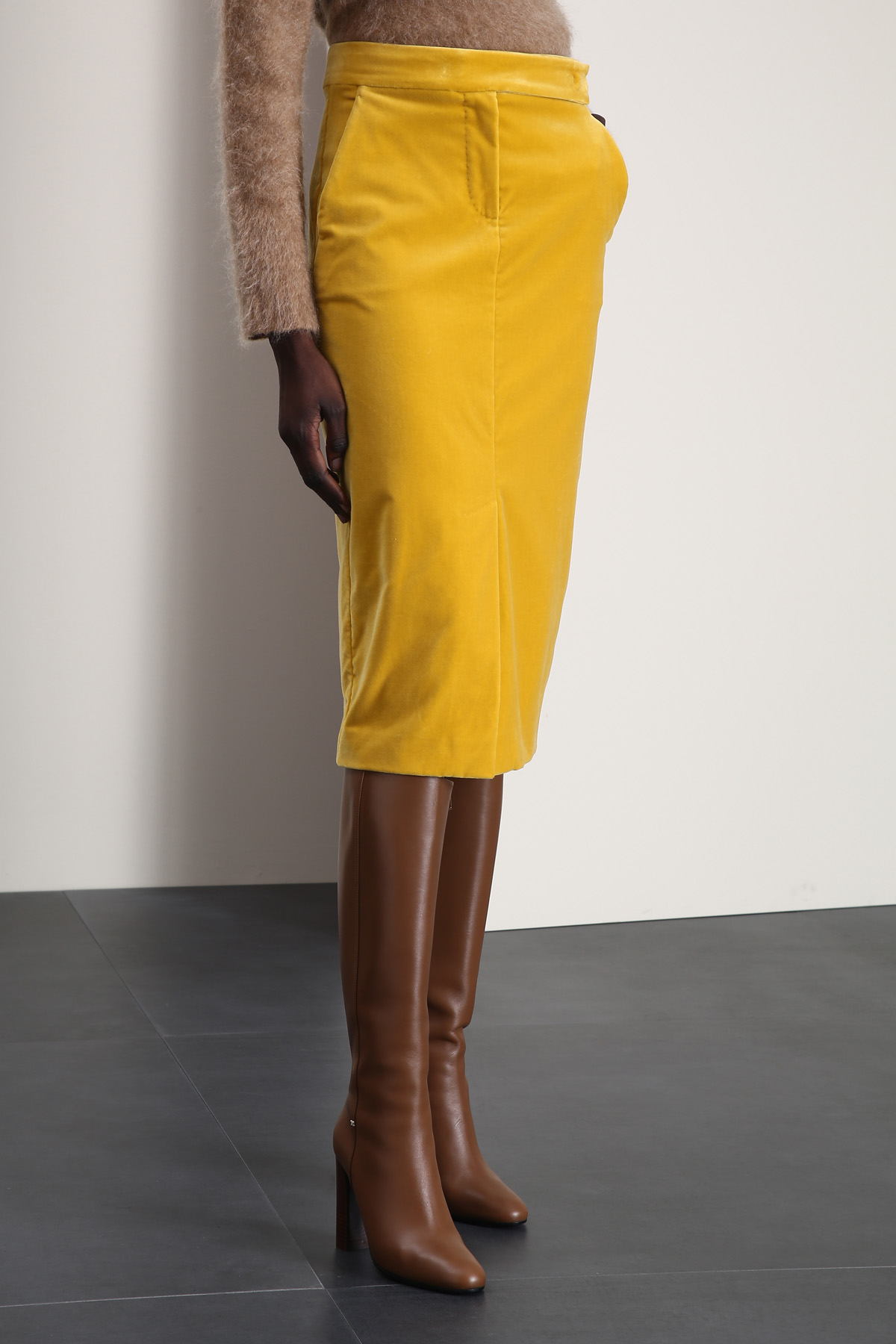 Gonna a tubo realizzata in velluto liscio di cotone stretch, con tasche alla francese e taschini a filetto con bottone sul retro, spacco centrale sul davanti e allacciatura nascosta tramite zip, bottone e ganci. Capo foderato.