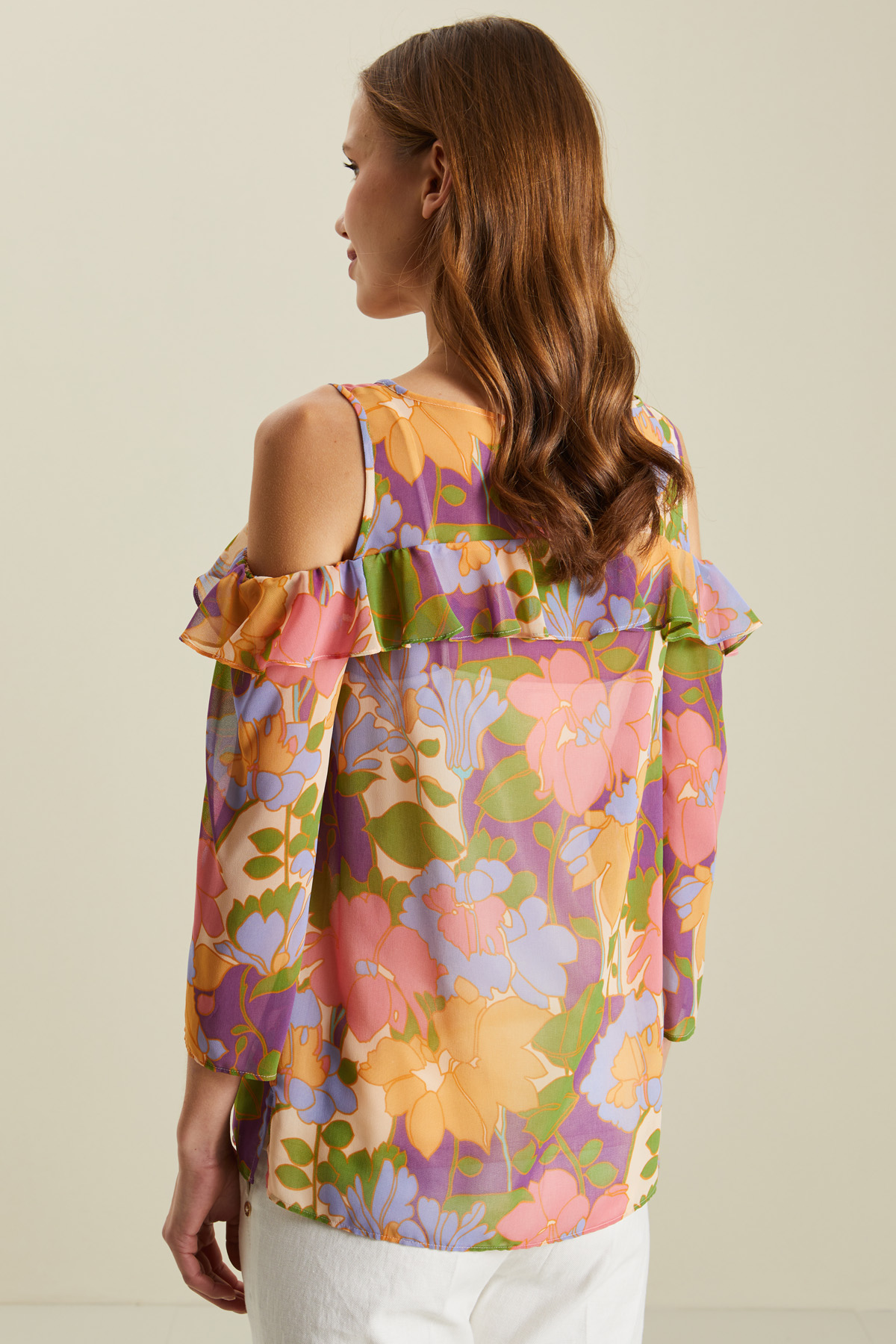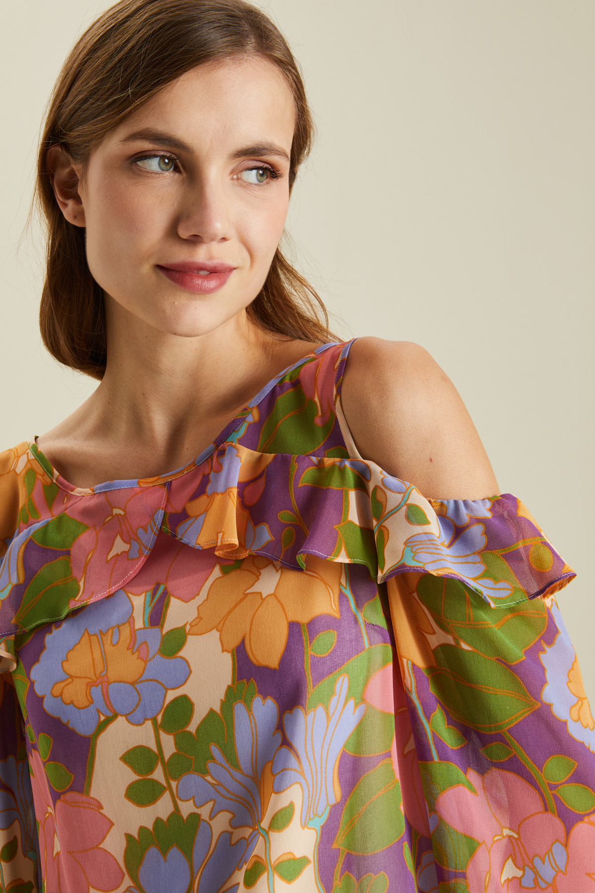 Top dalla linea fluida realizzato in georgette stampata, con scollo rotondo, spalline sottili, dettaglio di volant, maniche a tre quarti, spalle scoperte e spacchetti laterali al fondo. Capo dotato di top sottoveste in abbinamento.