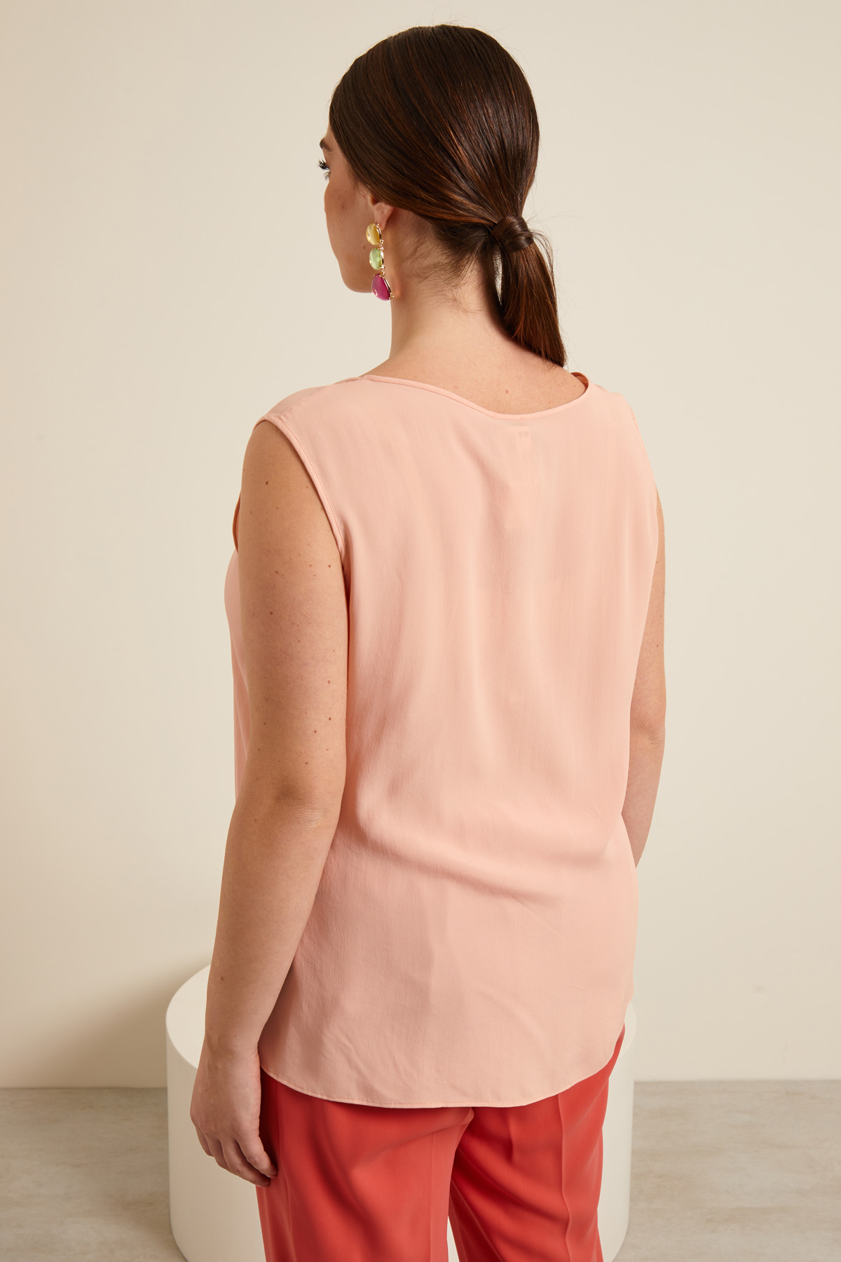 Top dalla linea fluida relizzato in crépe de chine di misto seta, con scollo a U, senza maniche e piccoli spacchi laterali al fondo.