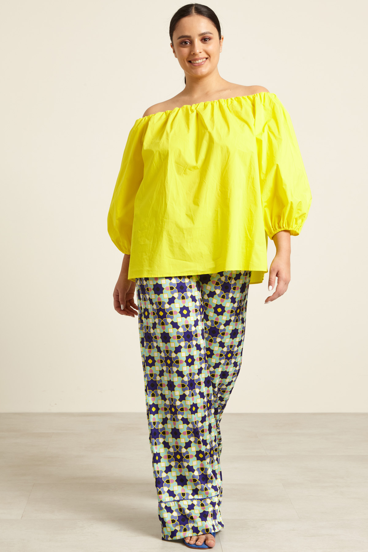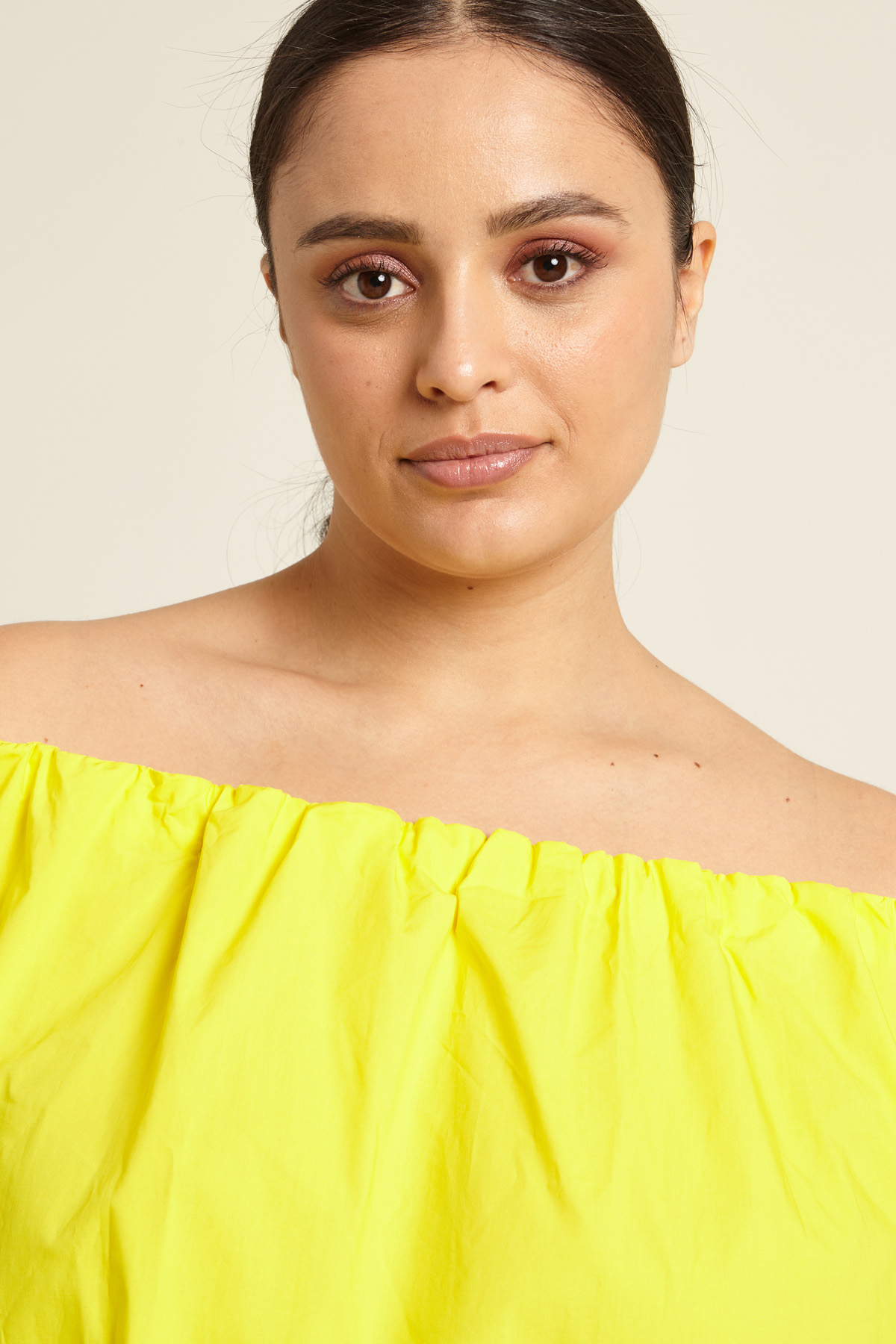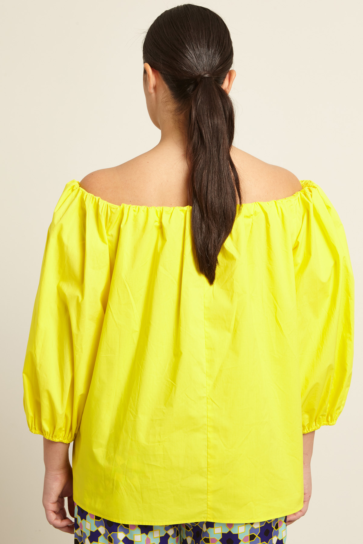 Casacca dalla linea over realizzata in popeline di puro cotone, con scollo off-shoulders elastico e maniche a tre quarti raglan.
