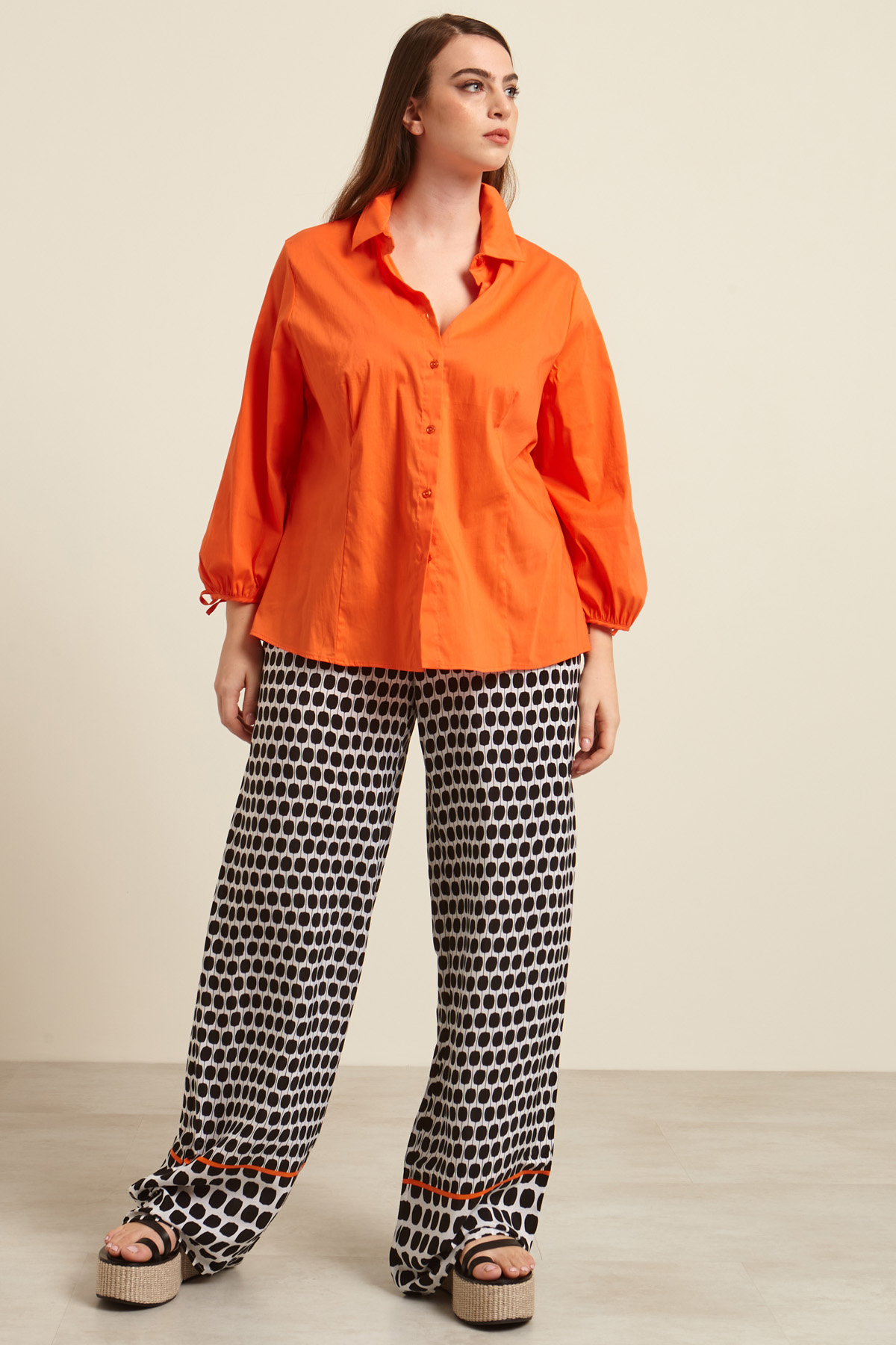 Camicia dalla linea dritta realizzata in cotone stretch con colletto classico, maniche a tre quarti chiuse al polso con laccetti. Allacciatura con bottoni sul davanti.