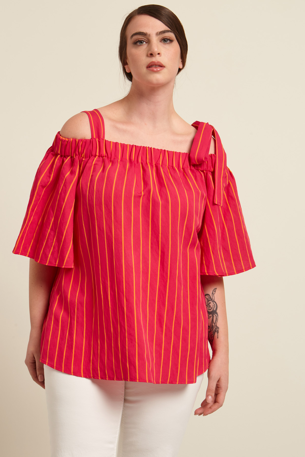 Blusa in viscosa con scollo off-shoulders con elastico, spallini con dettaglio di fiocco da allacciare sul lato sinistro, maniche corte. Linea svasata, per un fit confortevole.