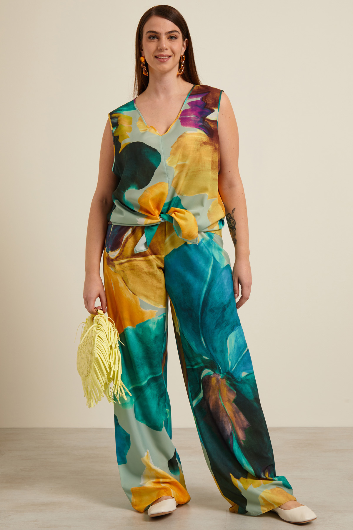 Casacca smanicata dalla linea dritta realizzata in crépe de chine stampato, con scollo a V e spacco sul fondo davanti.