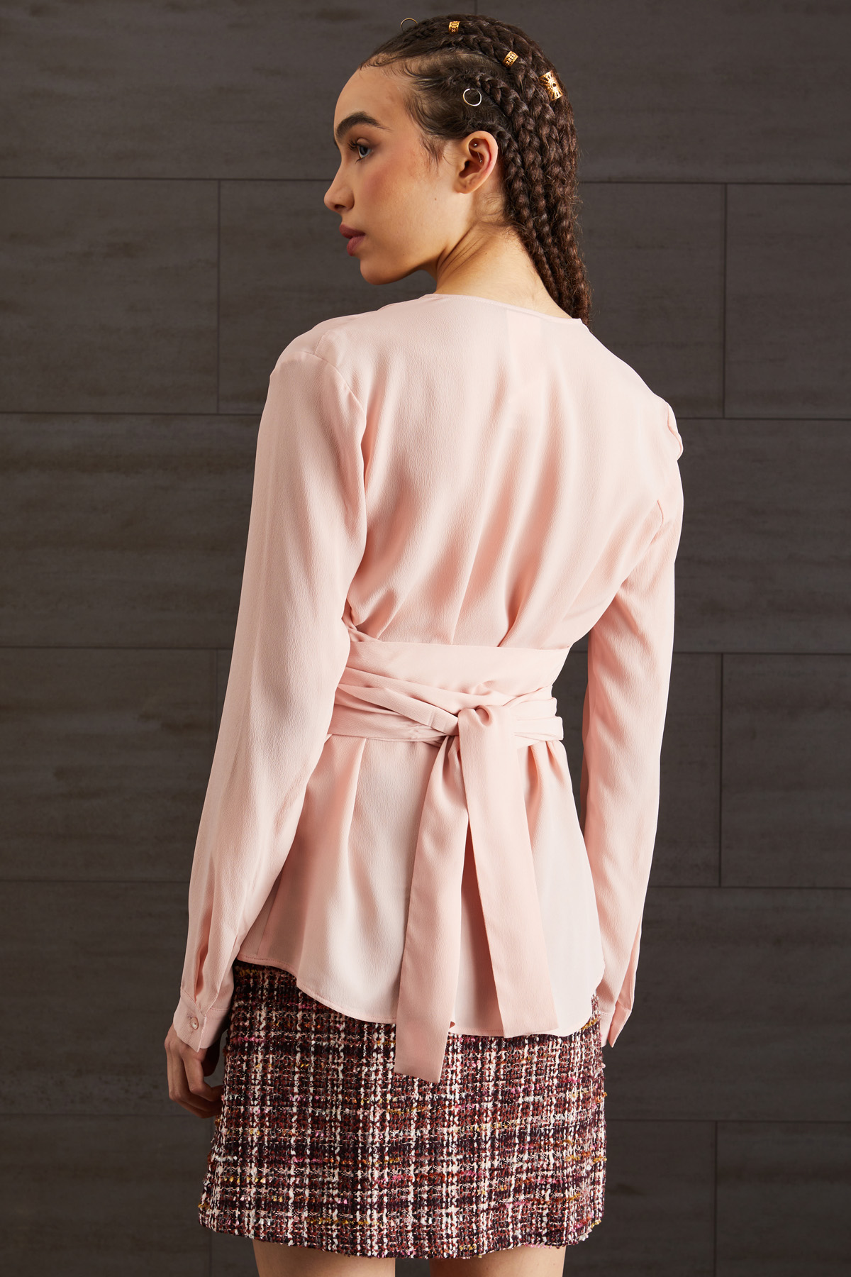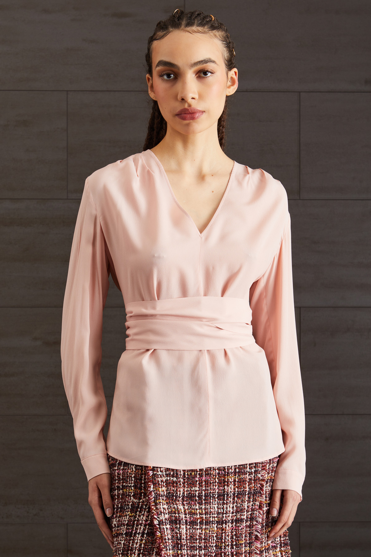 Casacca dalla linea dritta realizzata in tessuto crèpe di seta con scollo a V e maniche lunghe con polsini e bottone al fondo. Fusciacca da annodare in vita.
