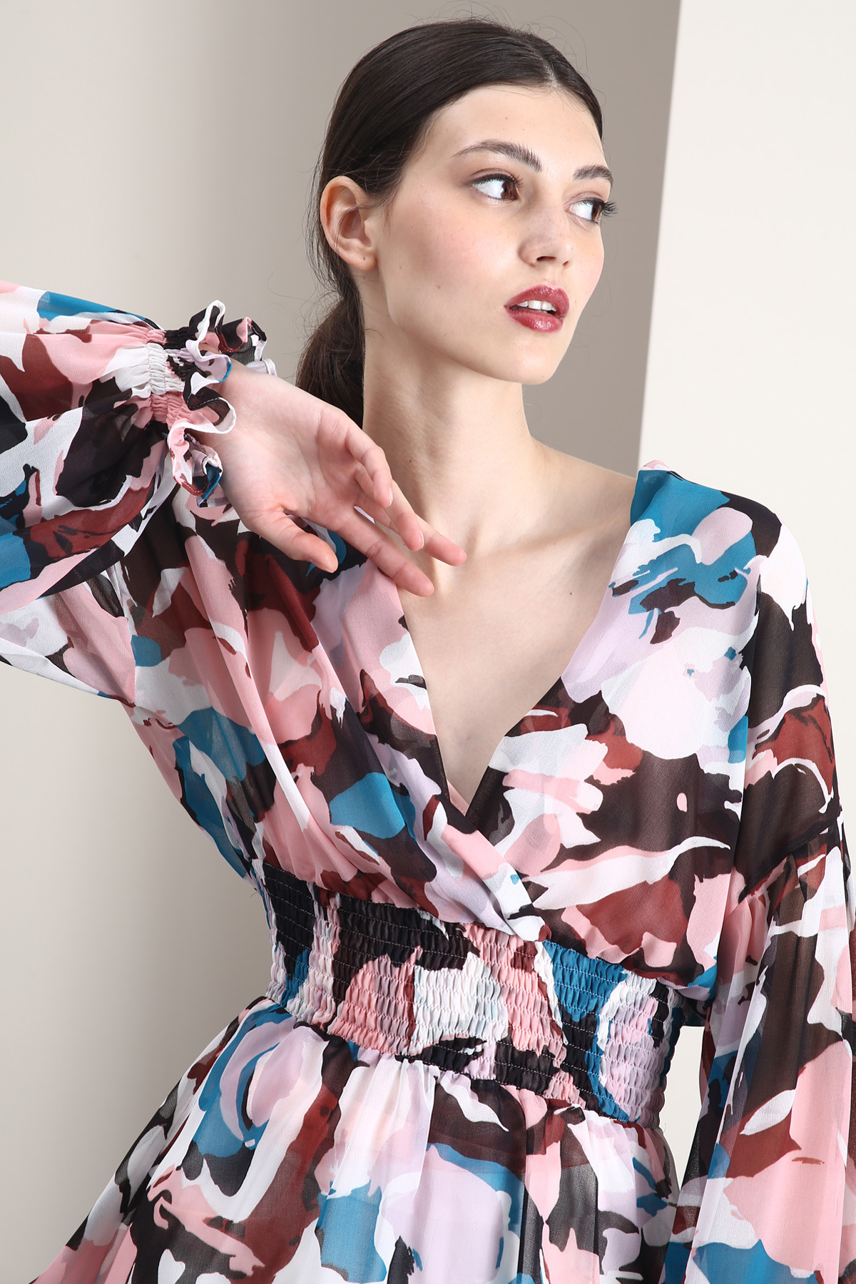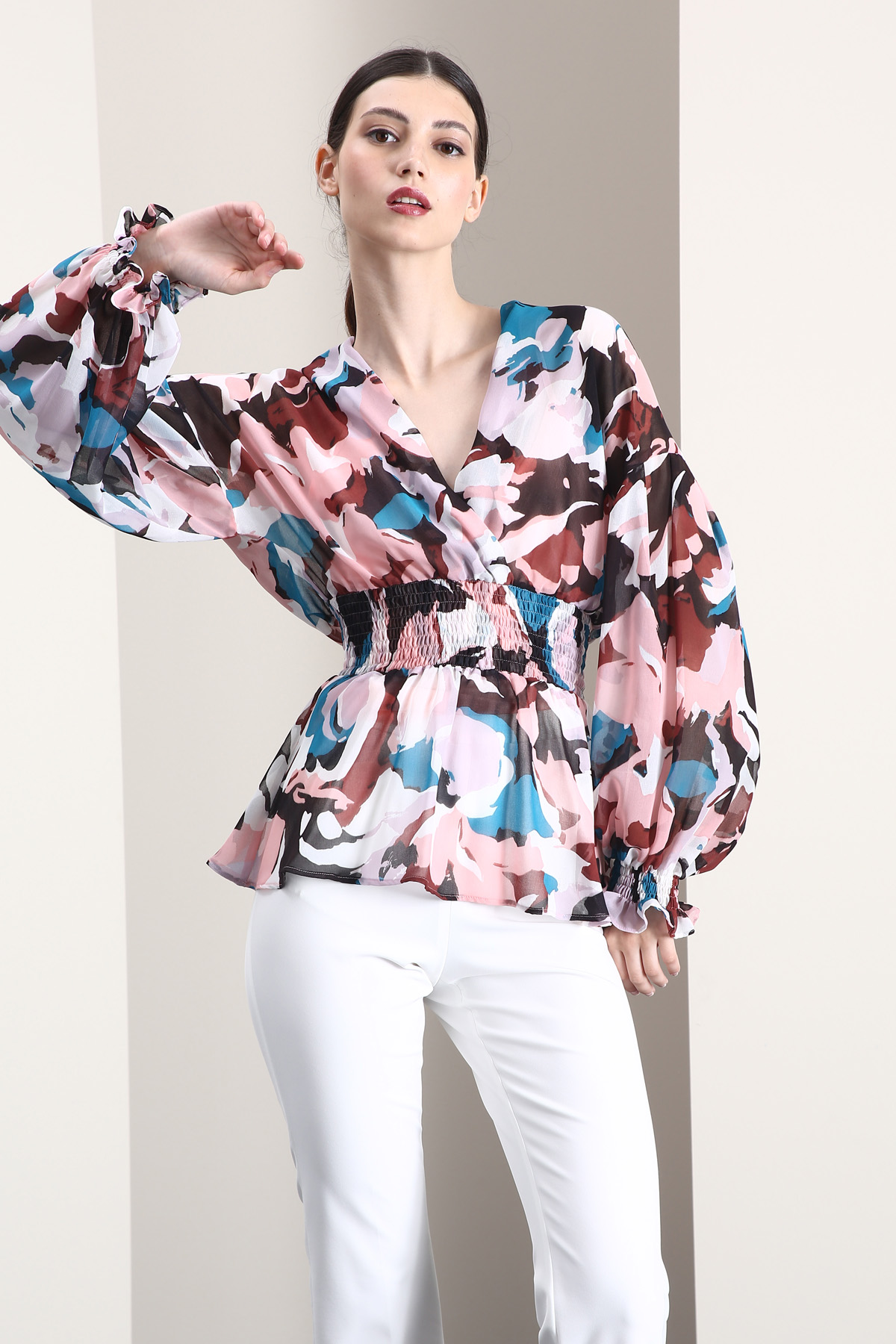 Blusa dalla linea fluida realizzata in georgette stampata, con scollo a V incrociato, maniche a sbuffo dal giro sceso e inserto elastico in vita e al polso. Top sottoveste coordinato in abbinamento.