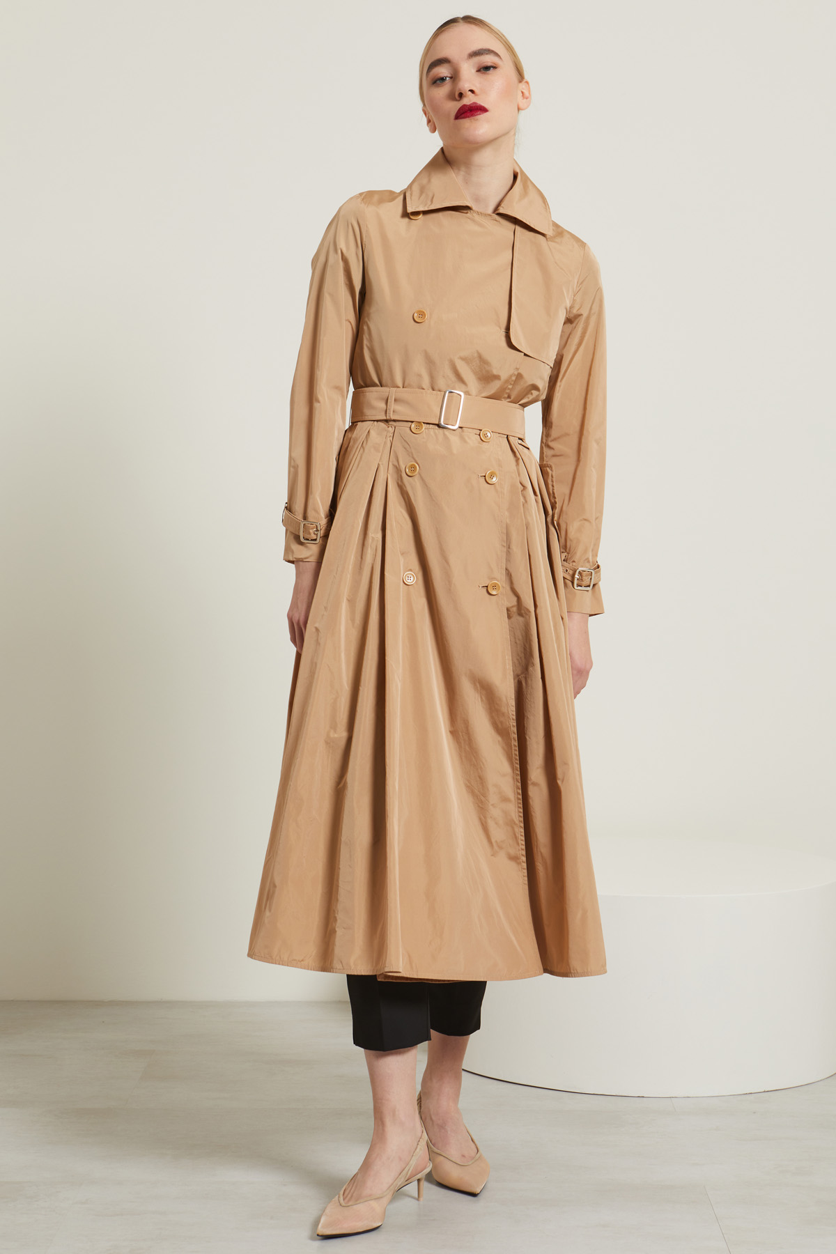 Soprabito dalla linea svasata realizzato in taffetà di misto seta tecnica antigoccia, con collo a rever, maniche lunghe con cinturini e fibbia squadrata, taglio in vita con motivo di pieghe cucite, tasche a filettone e mantellina nel retro. Allacciatura doppiopetto tramite bottoni a vista e cintura coordinata. Sfoderato.