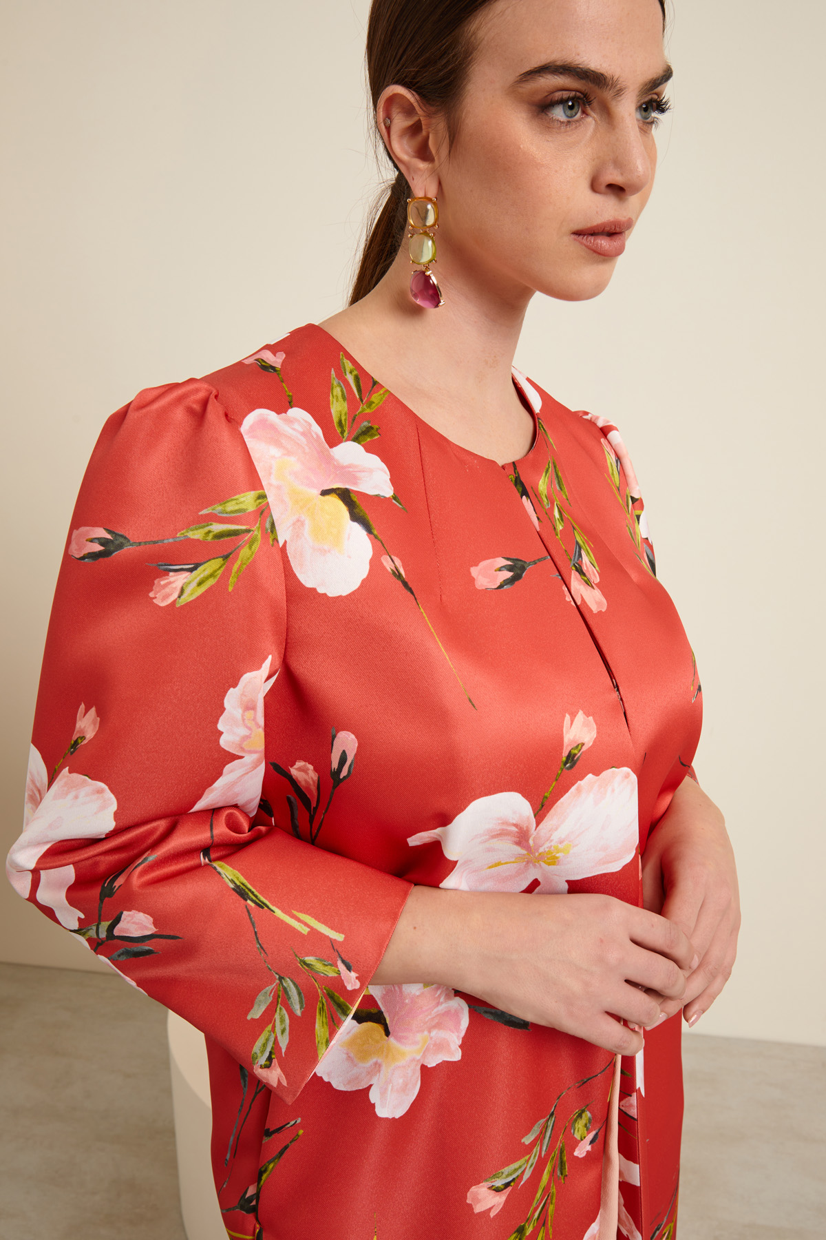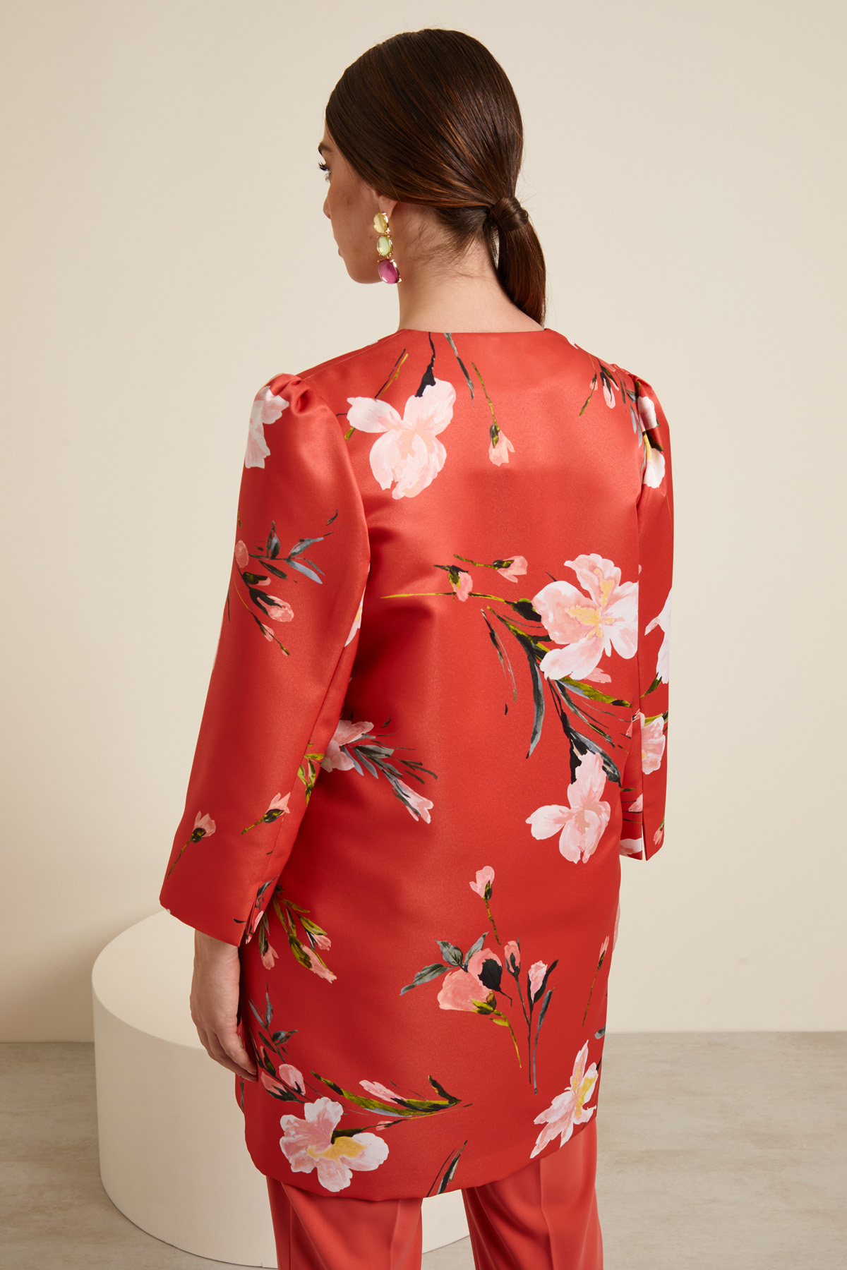 Soprabito dalla linea dritta realizzato in twill pesante stampato a fantasia, con scollo a giro, maniche lunghe leggermente arricchiate, tasche laterali inserite in cucitura e allacciatura tramite ganci. Capo foderato.