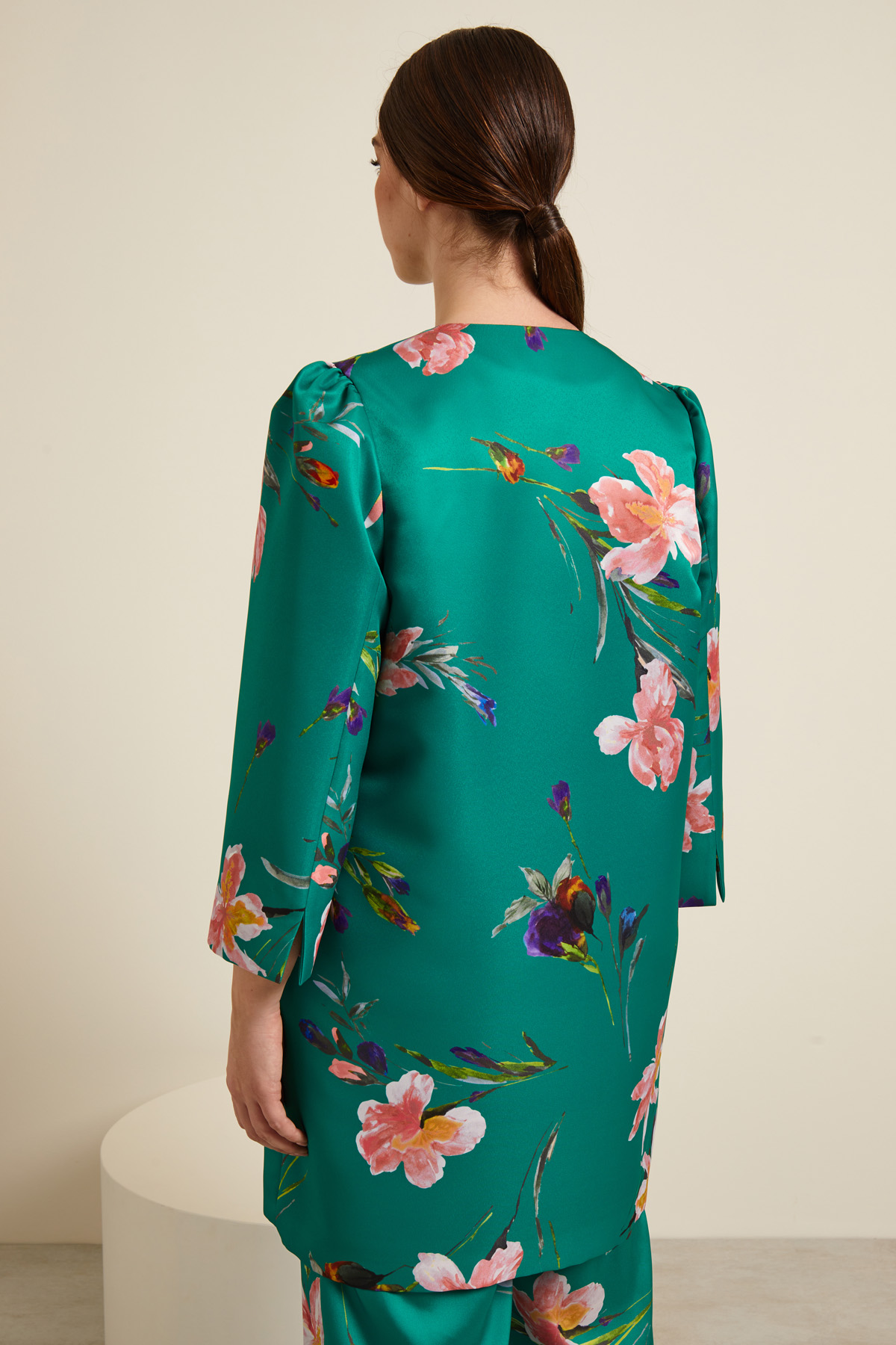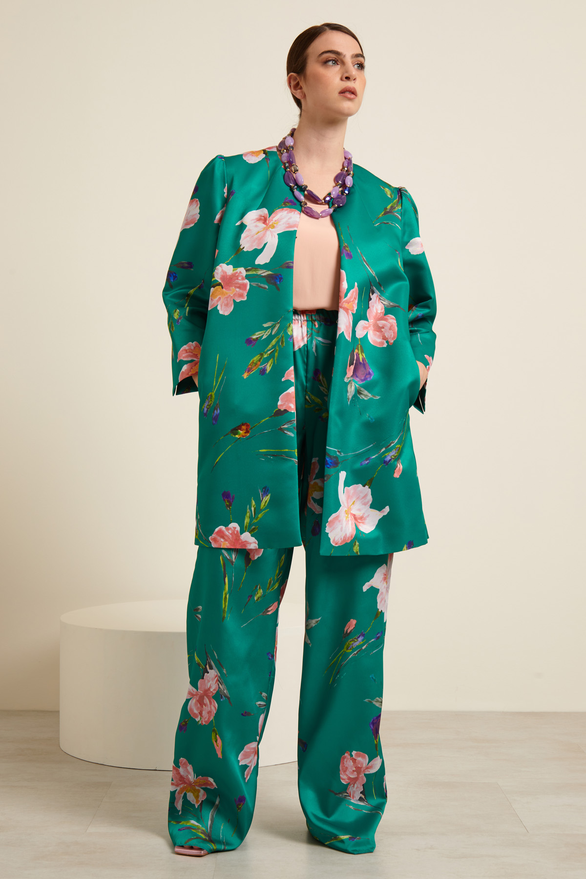 Soprabito dalla linea dritta realizzato in twill pesante stampato a fantasia, con scollo a giro, maniche lunghe leggermente arricchiate, tasche laterali inserite in cucitura e allacciatura tramite ganci. Capo foderato.