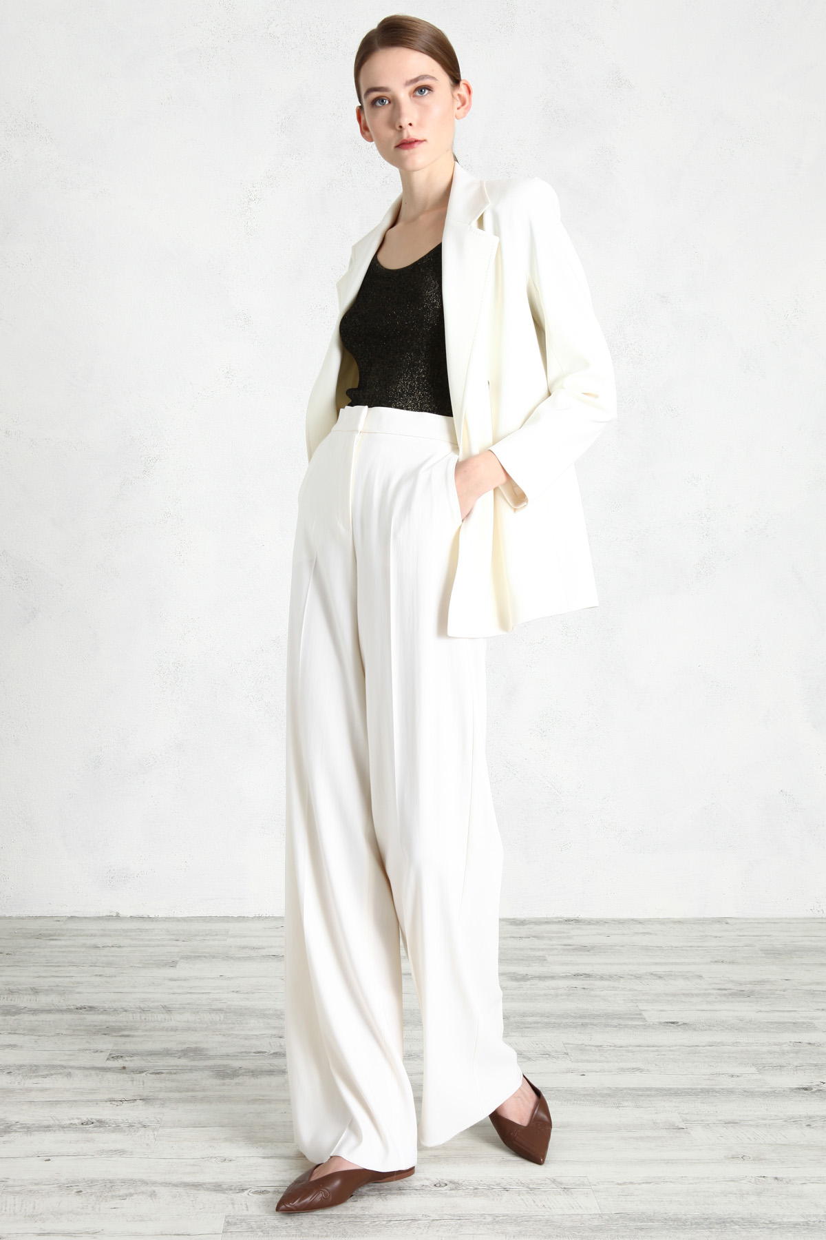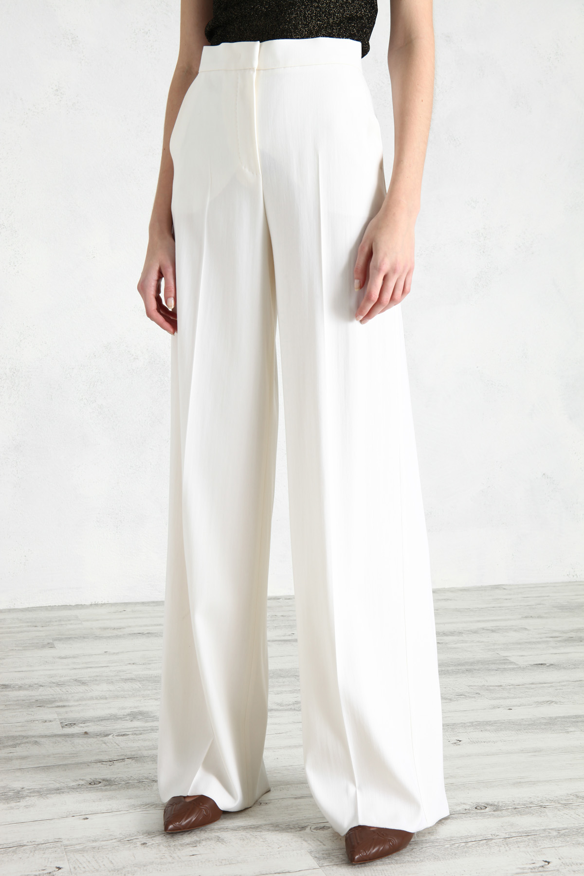 Pantalone a palazzo realizzati in crêpe di lana, con tasche laterali alla francese. Allacciatura nascosta con zip, bottone e gancio.