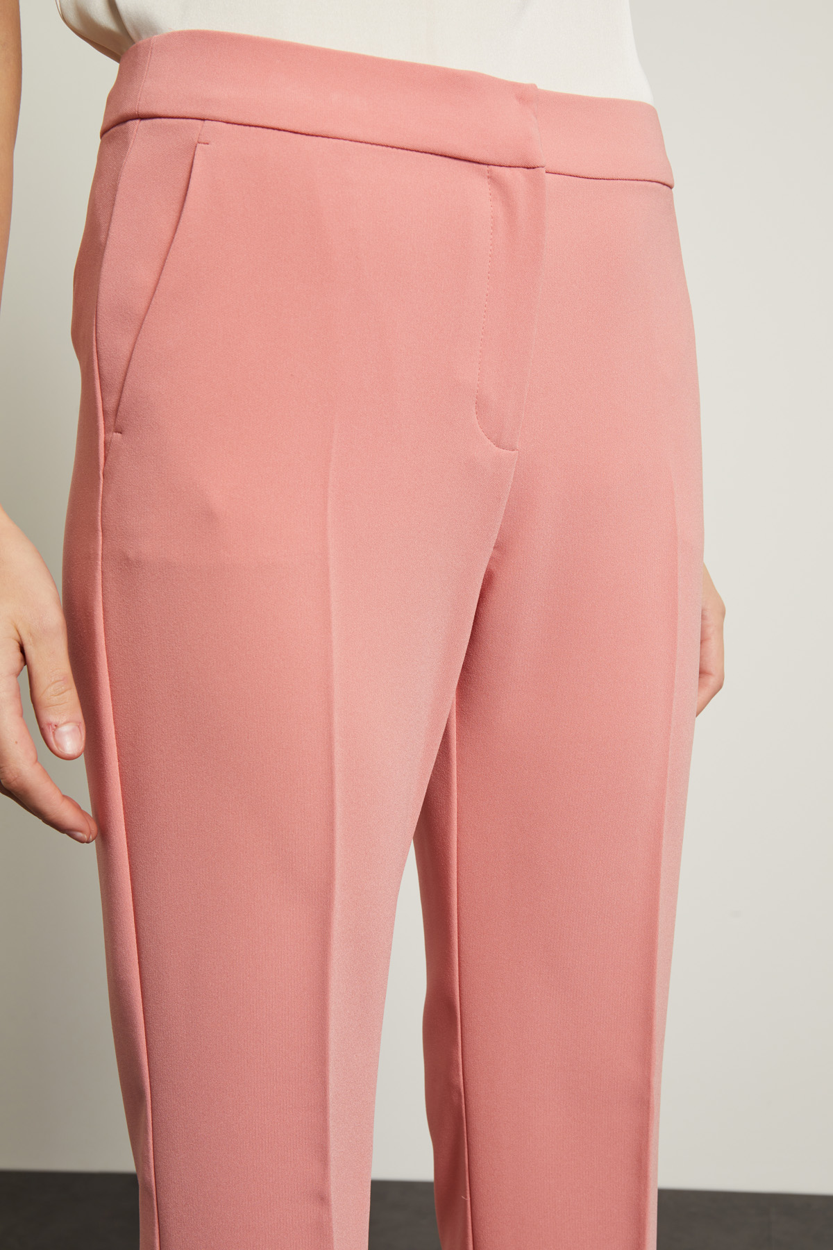 Pantaloni a palazzo realizzato in cady stretch con cintone in vita, tasche alla francese e piega stirata in lunghezza. Allacciatura tramite zip e bottone.