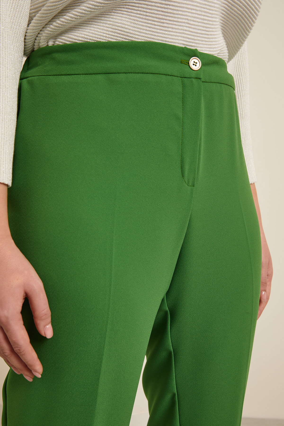 Pantaloni a sigaretta realizzati in enver satin, con cintone elastico in vita sul retro e piega stirata. Allacciatura tramite zip nascosta e bottone.