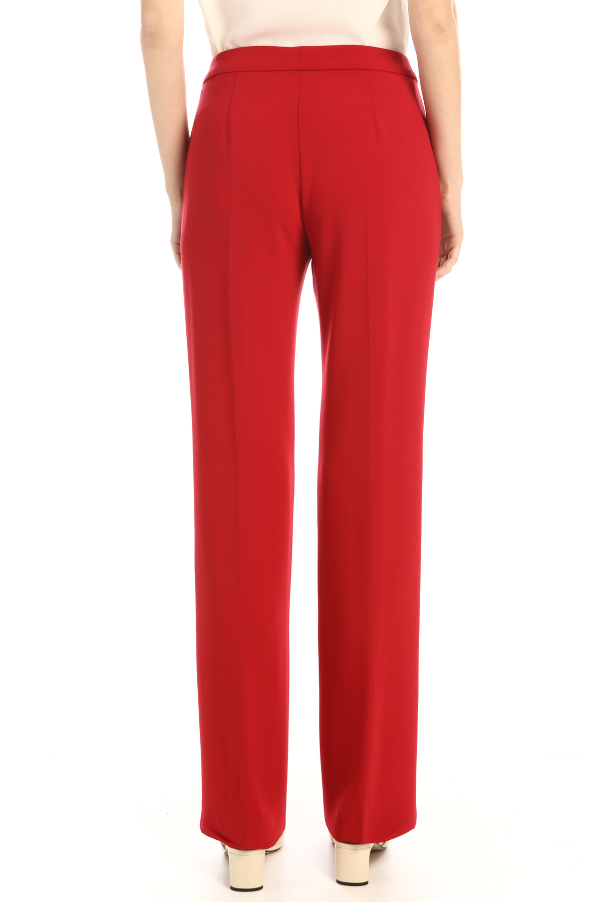Pantaloni dalla linea dritta realizzati in cady, con tasche laterali alla francese e allacciatura nascosta tramite zip, bottone e gancio.