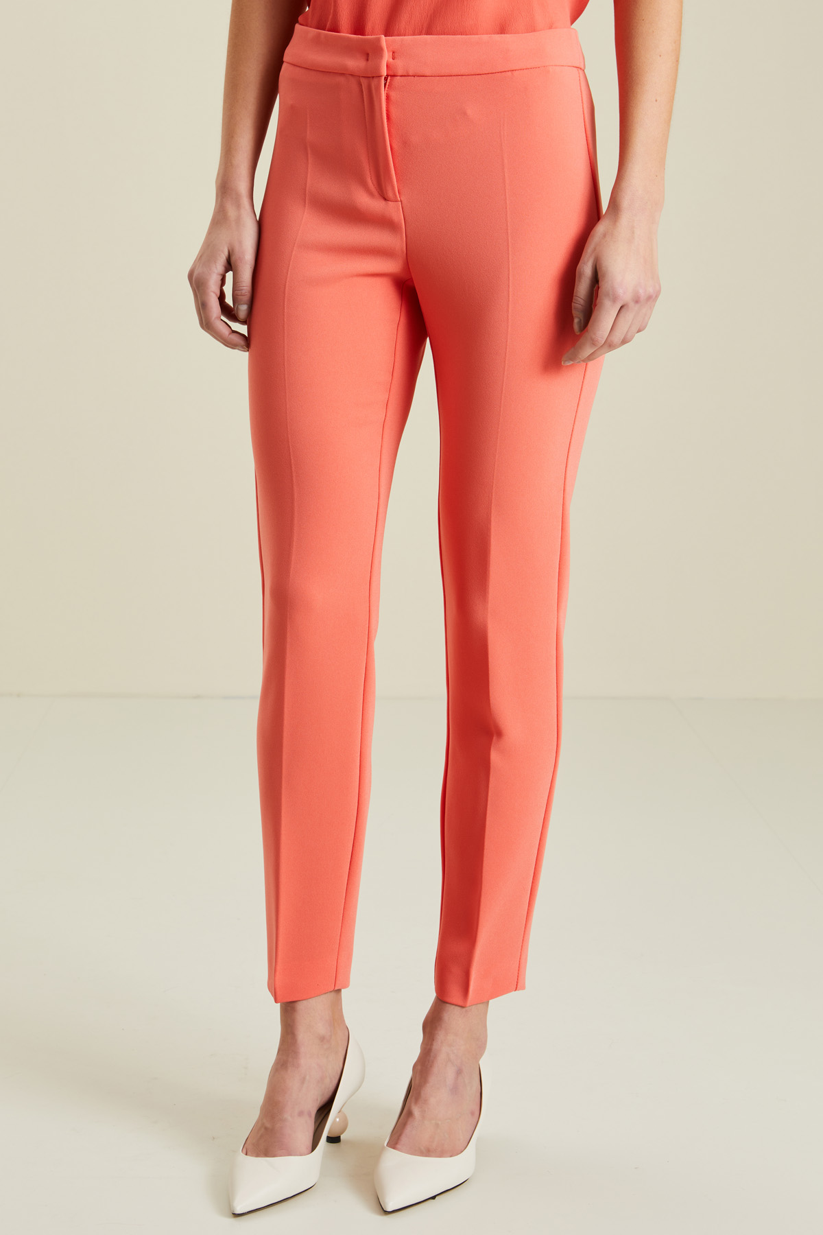 Pantaloni a sigaretta realizzati in cady stretch, con cintone in vita e allacciatura nascosta tramite zip, bottone e gancio.