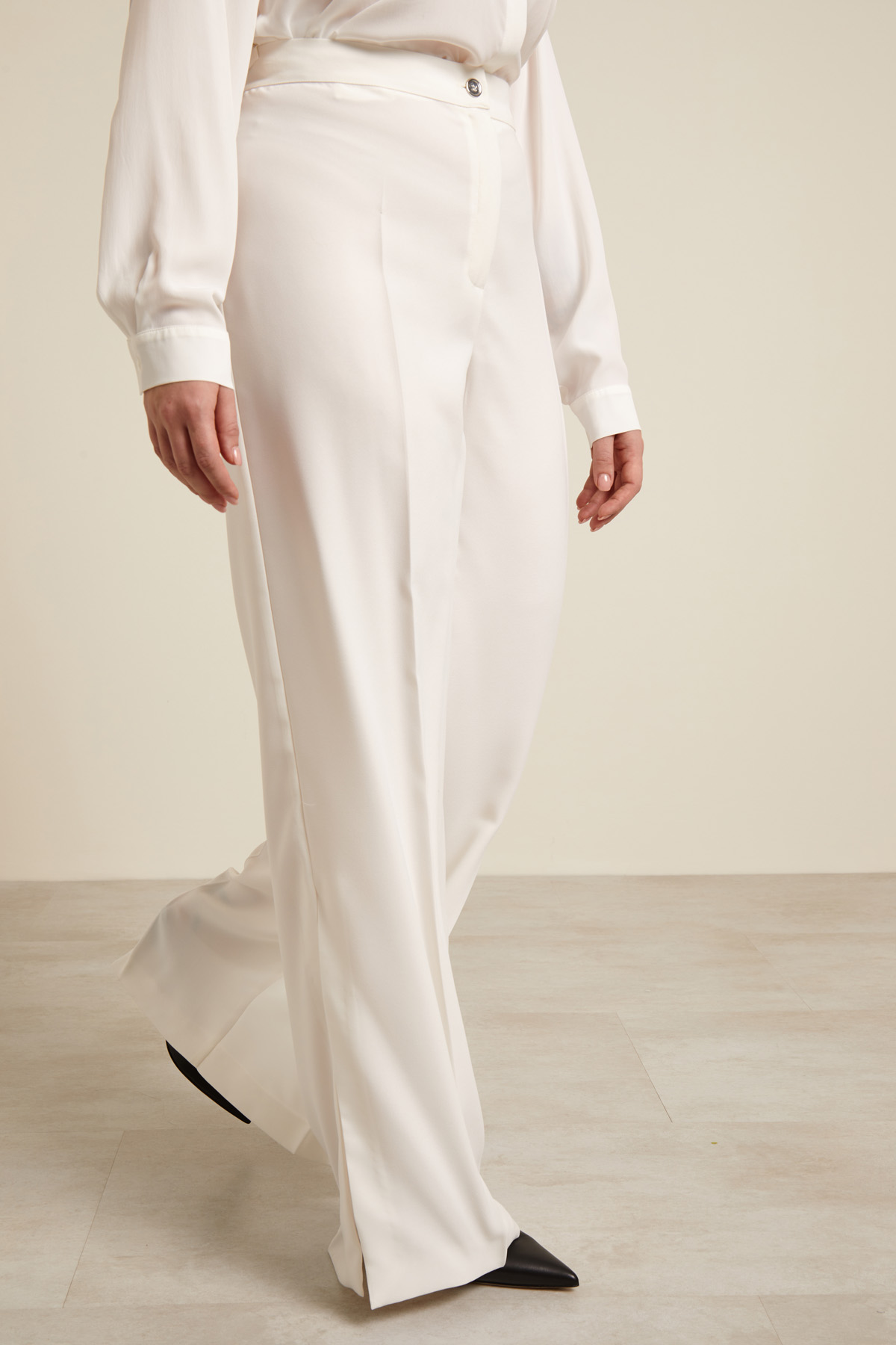Pantaloni a palazzo realizzati in enver satin, con cintone elastico in vita dietro, piega stirata e spacchi laterali a fondo capo. Allacciatura tramite zip nascosta e bottone.