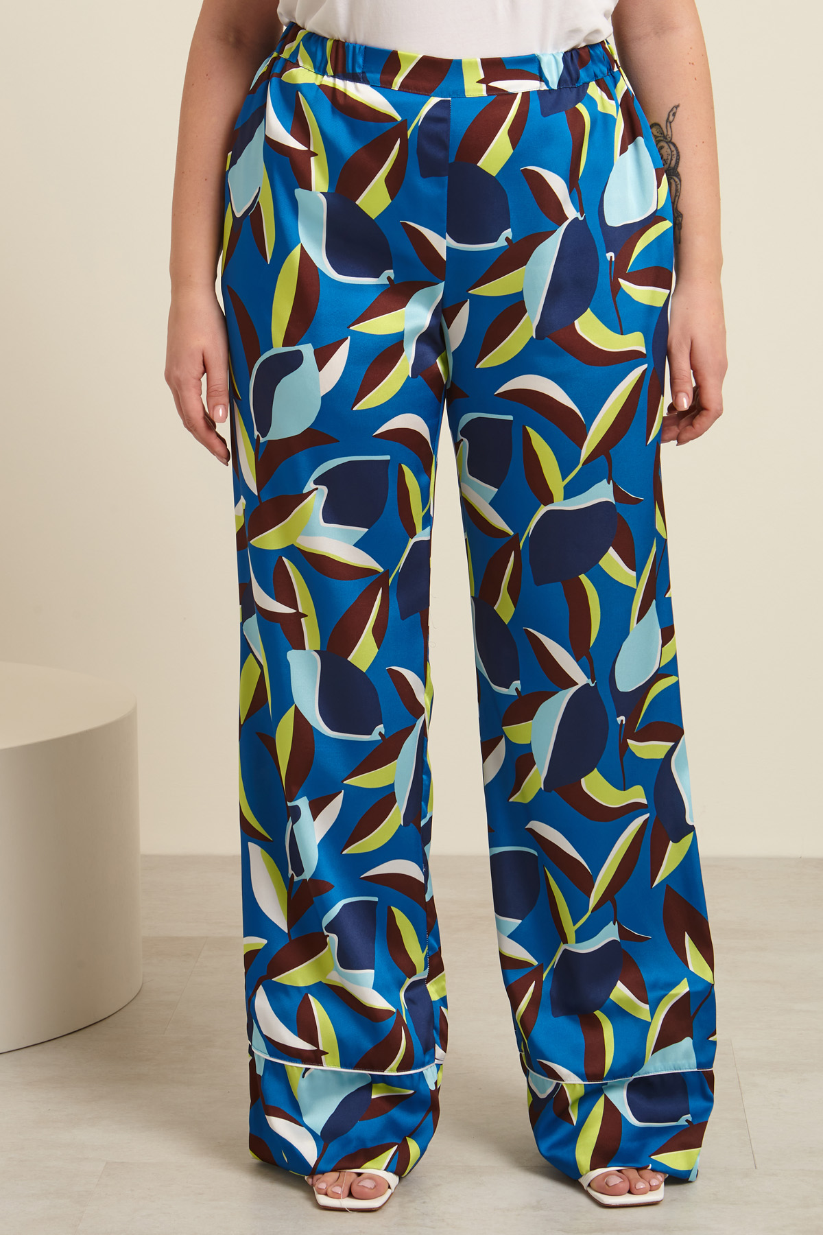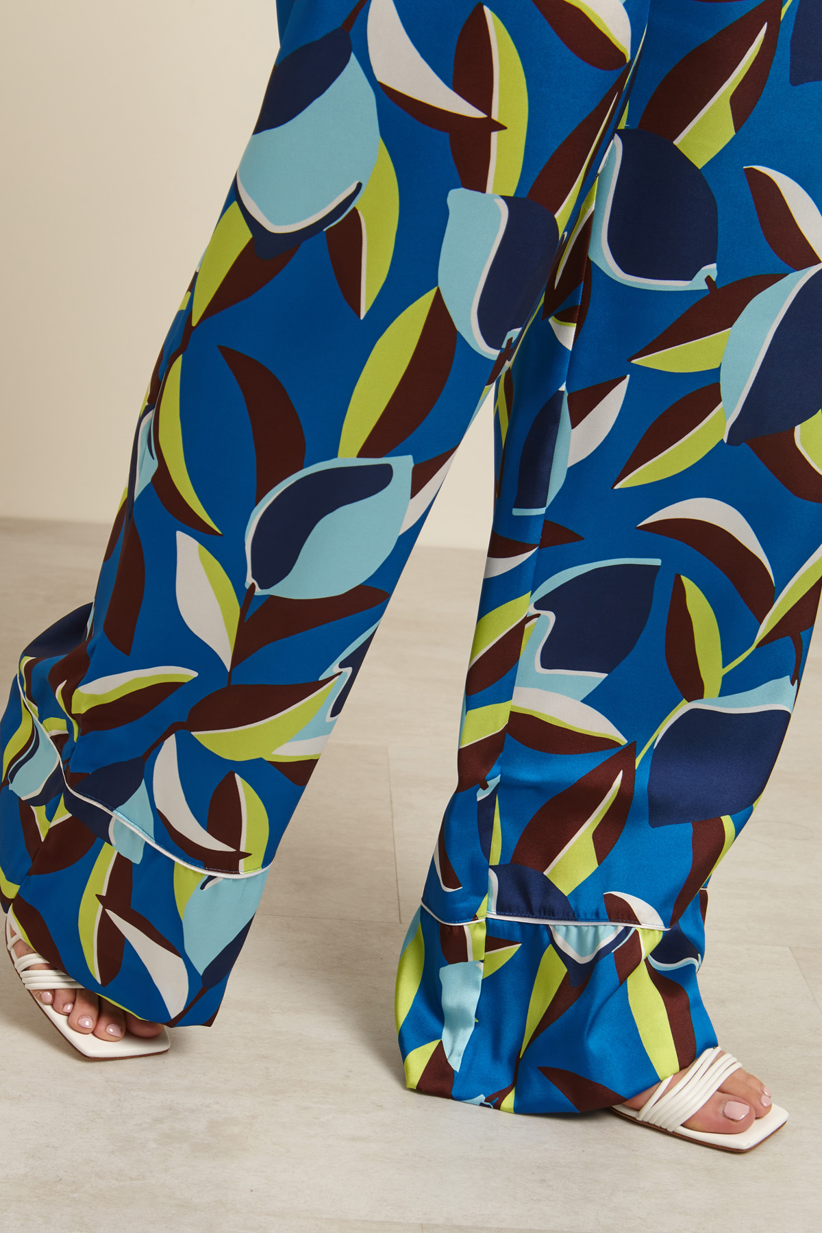 Pantaloni a palazzo realizzati in twill stampato, con inserto elastico in vita, tasche alla francese e profili rifiniti da piping.