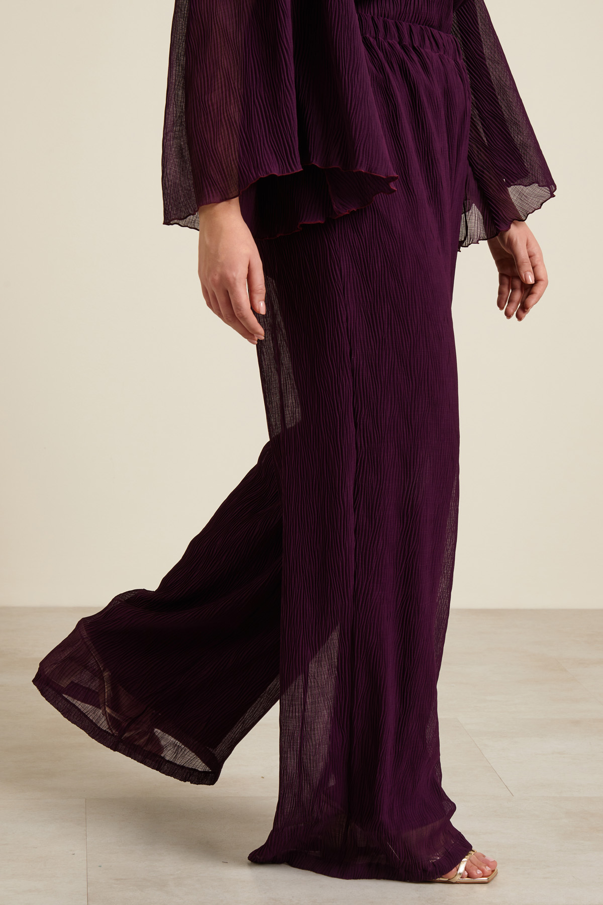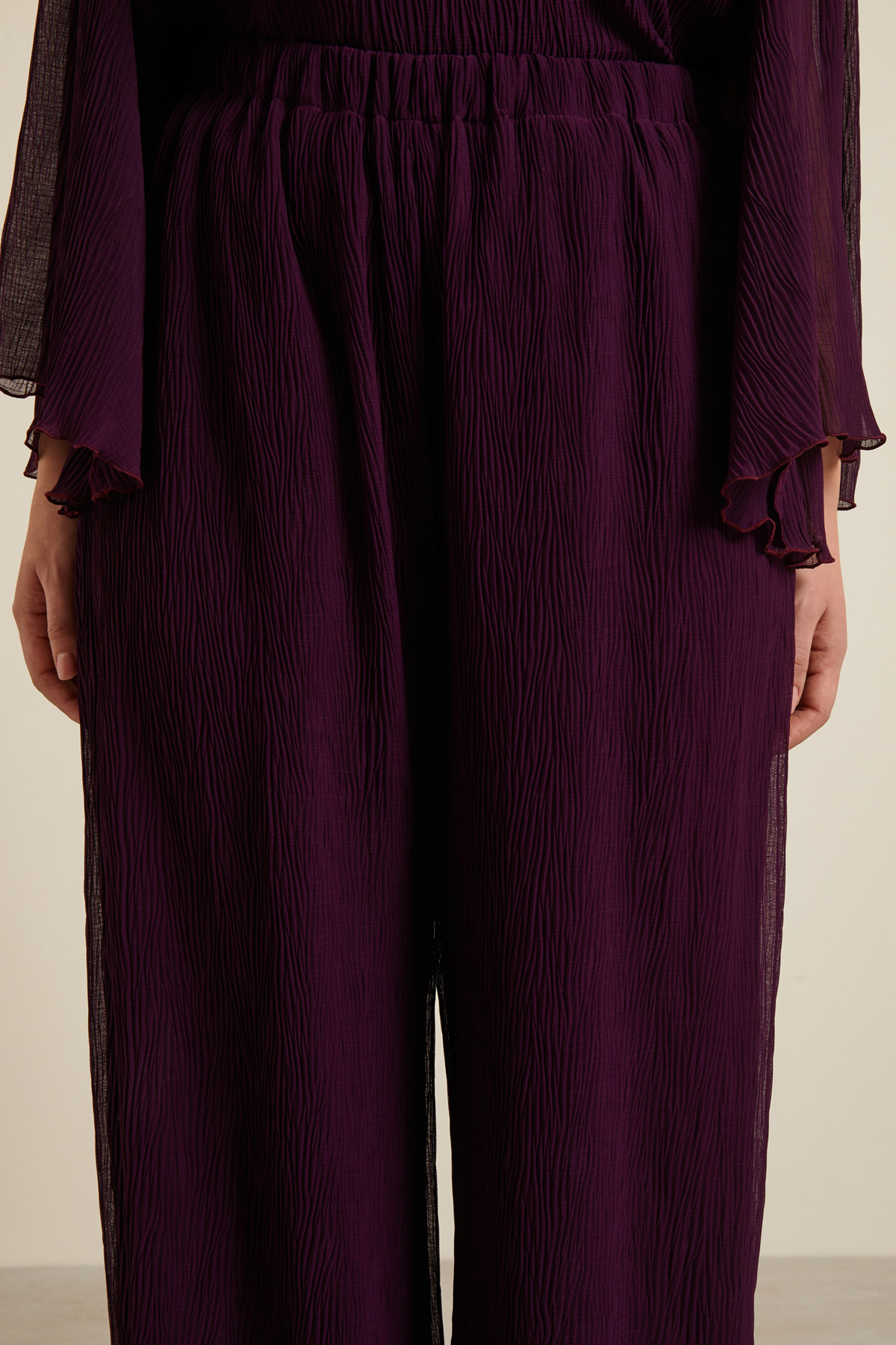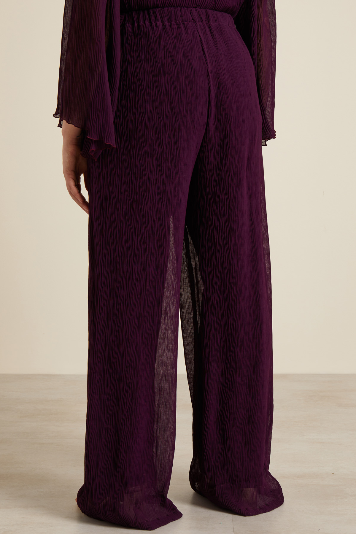 Pantaloni a palazzo dalla linea fluida realizzati in georgette con lavorazione plissè all over e inserto elastico in vita.