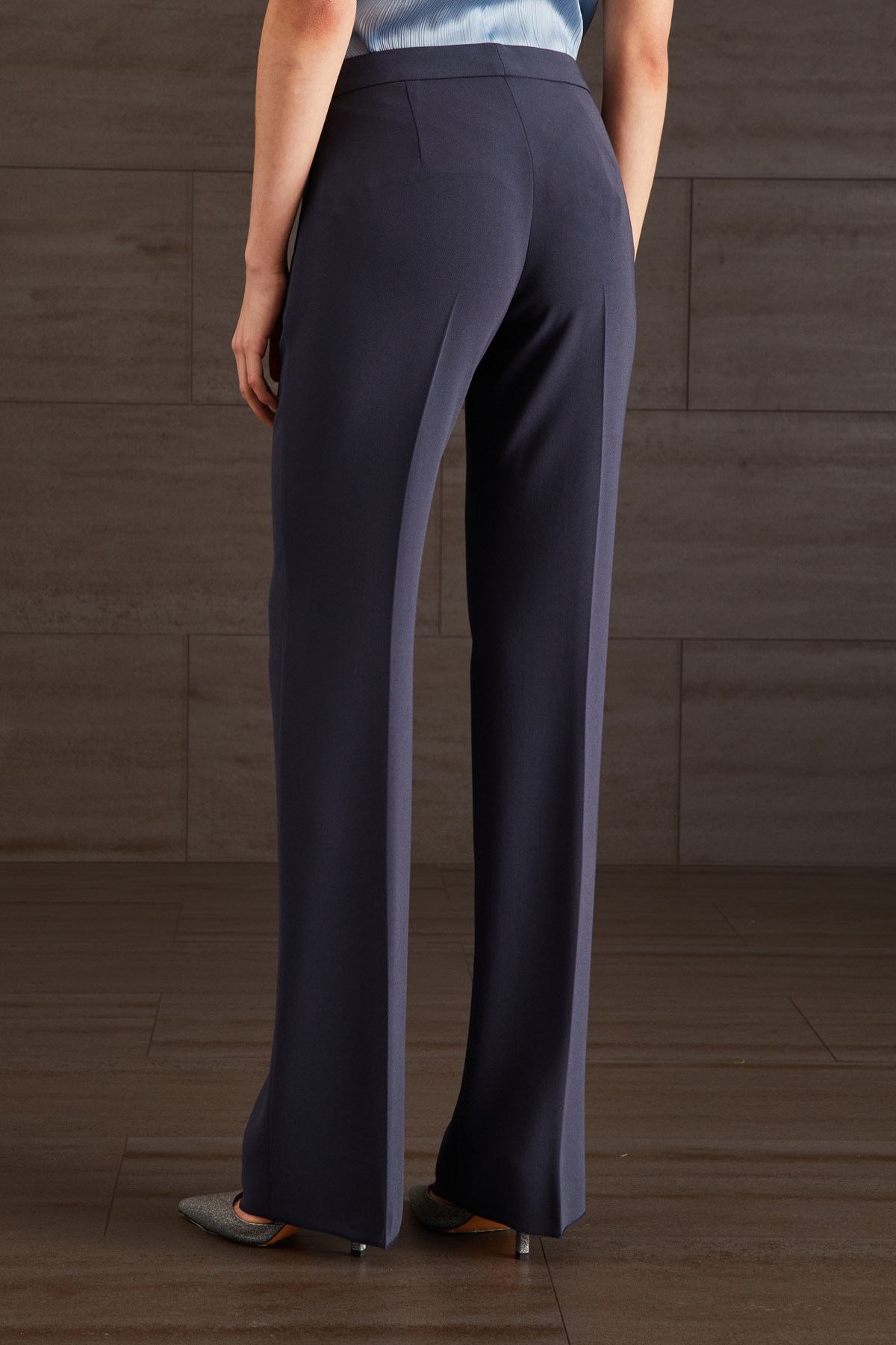 Pantaloni dalla linea dritta realizzati in cady con piega stirata e tasche alla francese. Chiusura nascosta tramite zip, gancio e bottone.