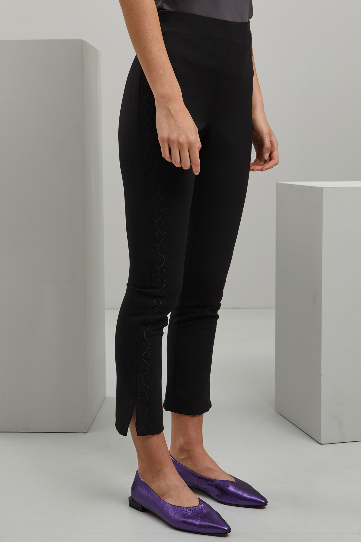 Pantaloni skinny flare relizzati in tessuto di misto viscosa stretch, con inserto elastico in vita e dettagli di ricamo in lunghezza, spacchetti al fondo. Allacciatura nascosta tramite zip.