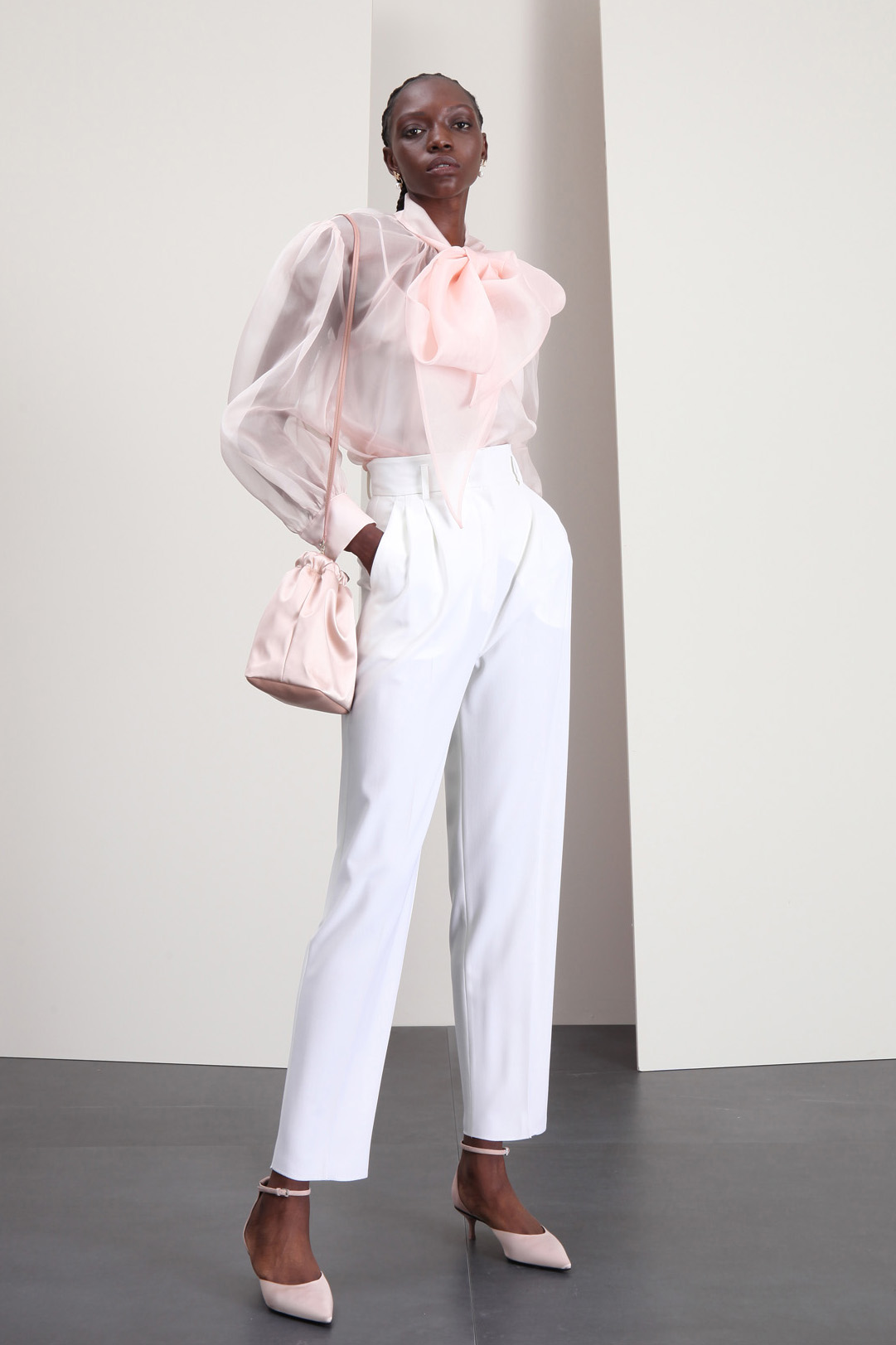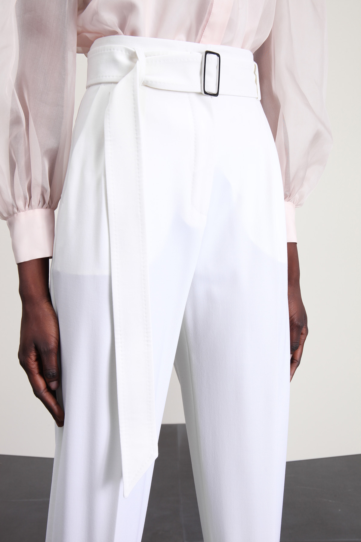 Pantaloni baggy realizzati in crepé di lana stretch, con passanti, pieghe cucite in vita, tasche laterali alla francese e allacciatura nascosta tramite zip, bottone e ganci. Cintura coordinata in abbinamento con fibbia in metallo.