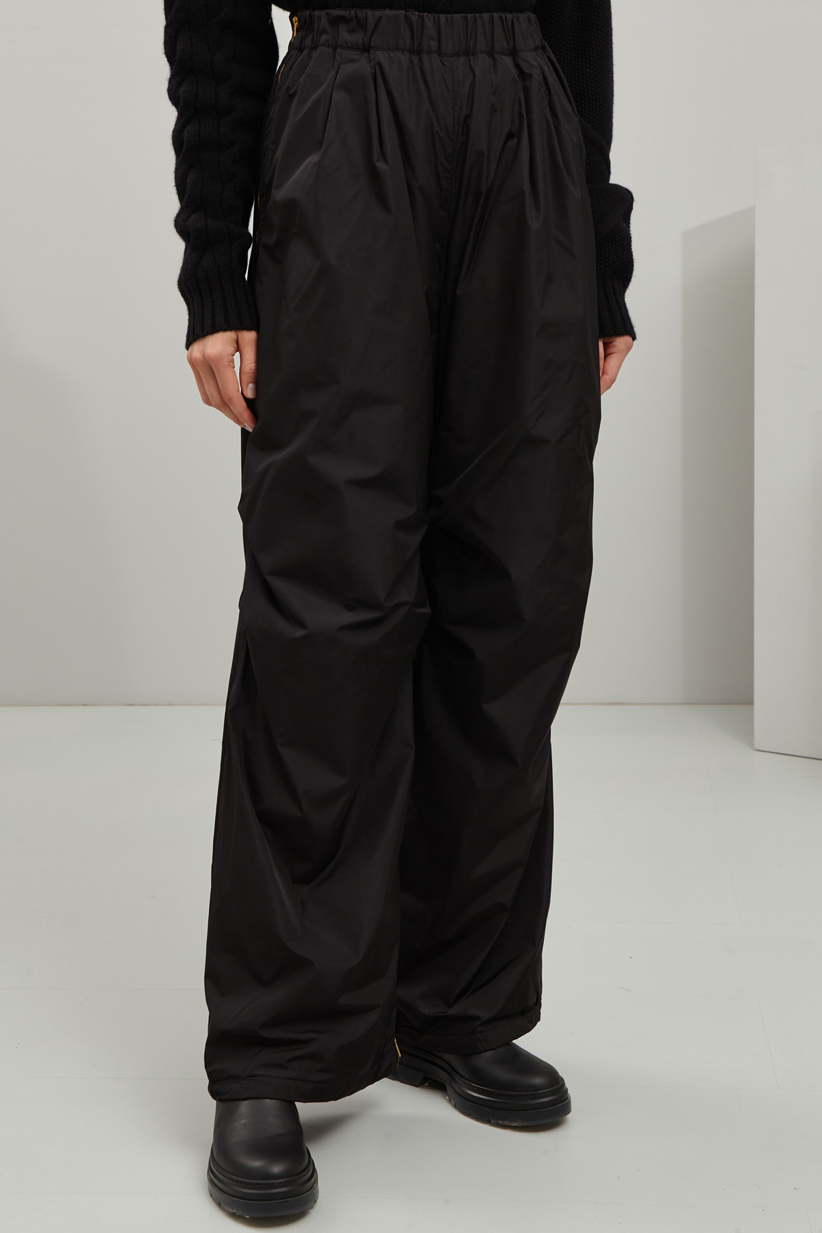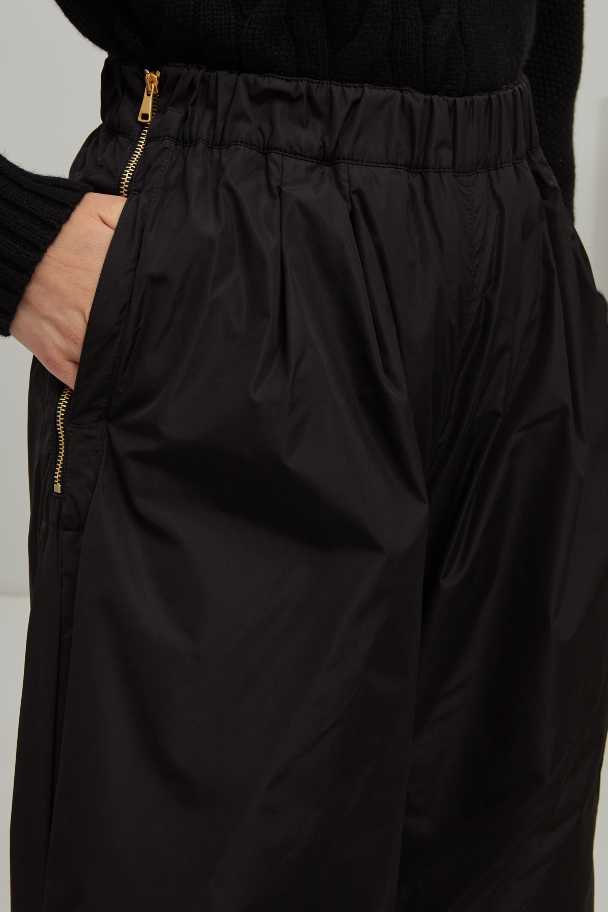 Pantaloni dalla linea morbida realizzati in taffetà tecnico, con inserto elastico in vita, tasche laterali a filetto, dettaglio di cerniere al fondo e sui fianchi. Foderati.