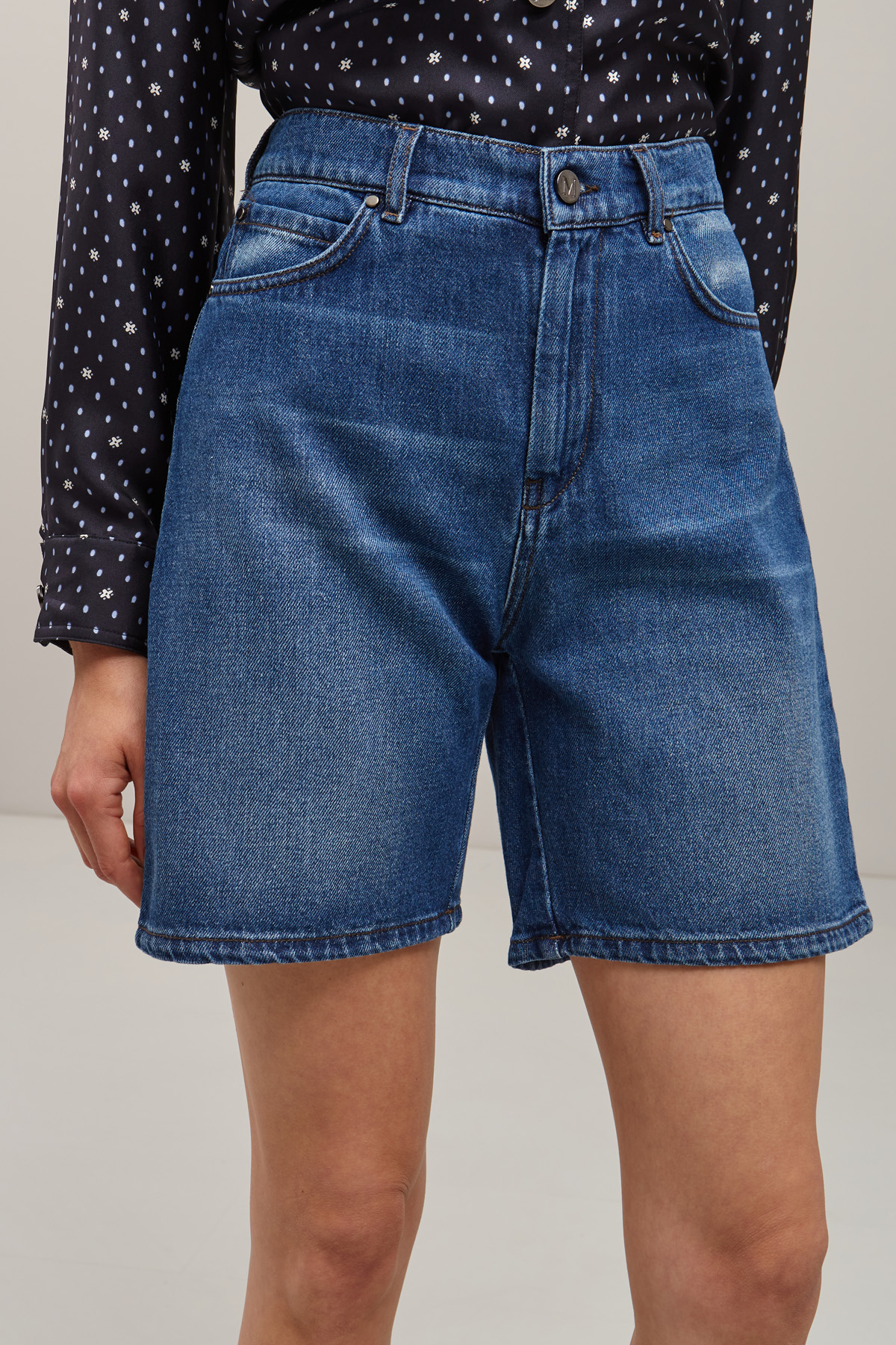 Shorts a vita alta dalla linea dritta realizzati in denim di puro cotone, con passanti in vita e cinque tasche. Allacciatura tramite zip e bottone in metallo.