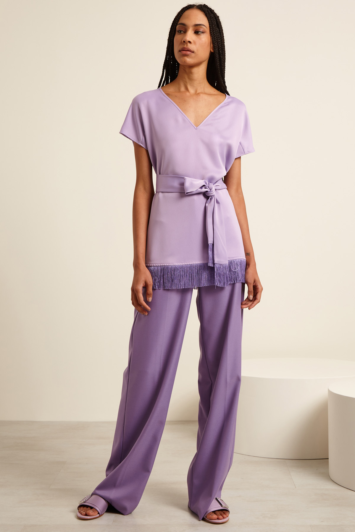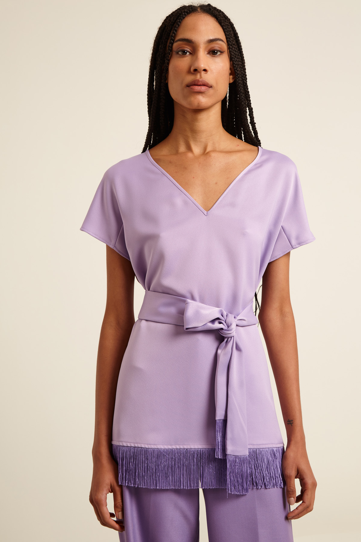 Casacca dalla linea dritta realizzata in enver satin con scollo a V, maniche corte a kimono e dettaglio di frange a fondo capo e cintura coordinata.