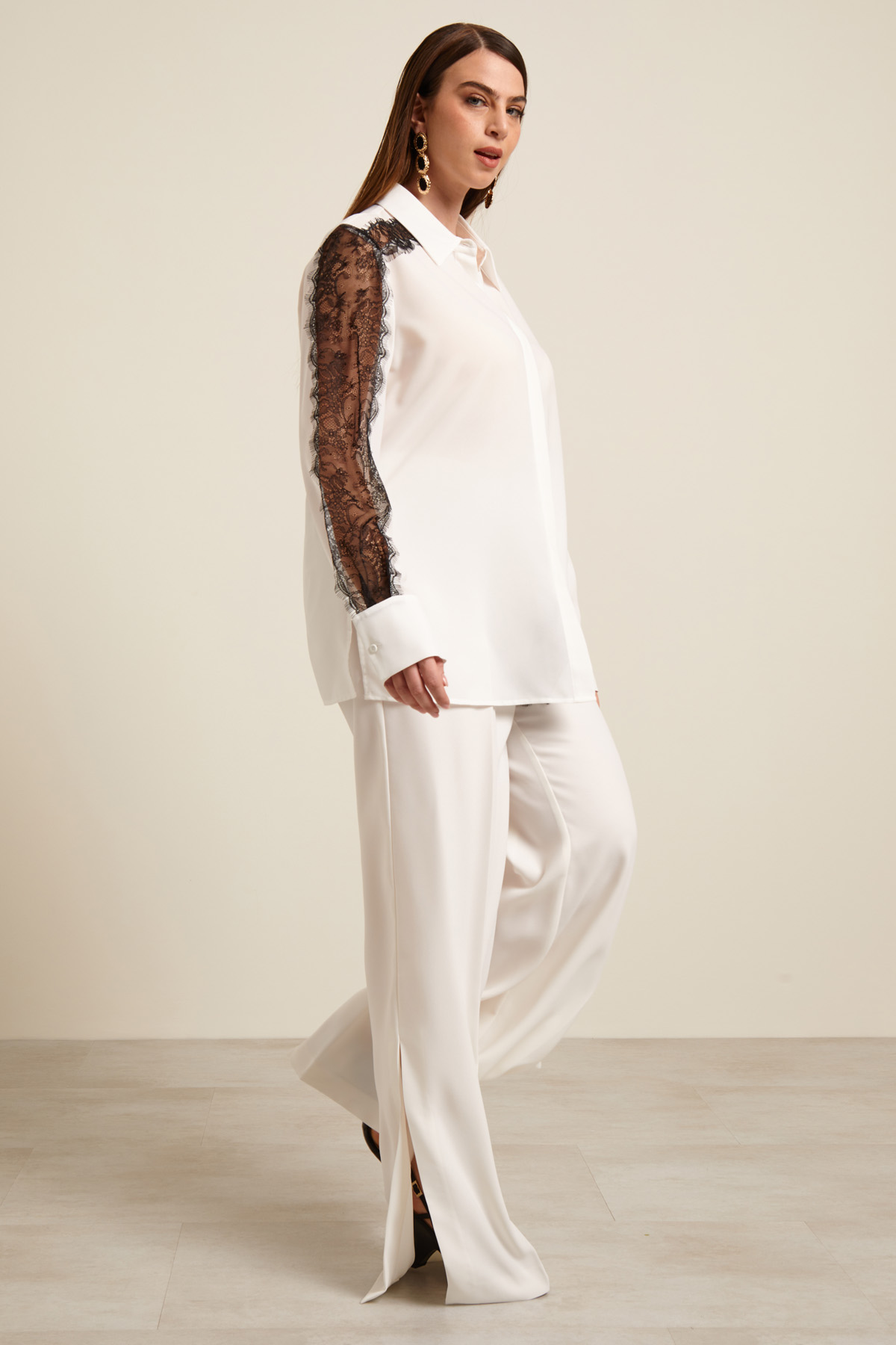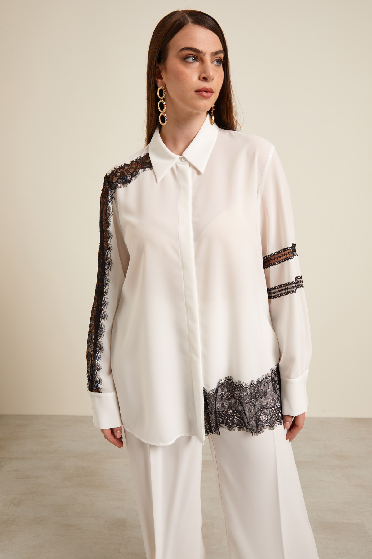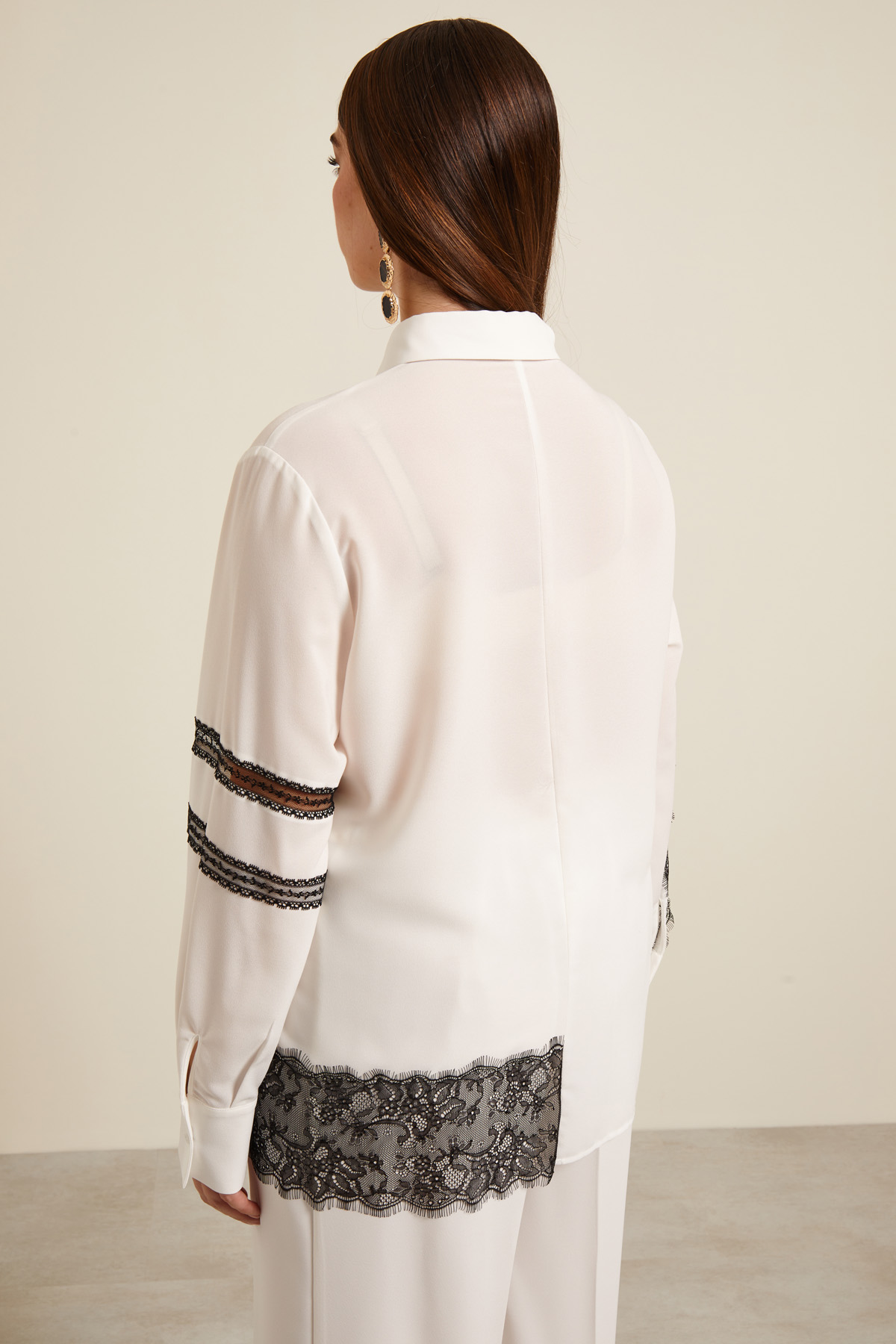 Casacca dalla linea fluida realizzata in tessuto crépe con inserti in pizzo, con colletto classico, maniche lunghe con polsino e bottone al fondo, spacchetti laterali. Allacciatura nascosta tramite bottoni.