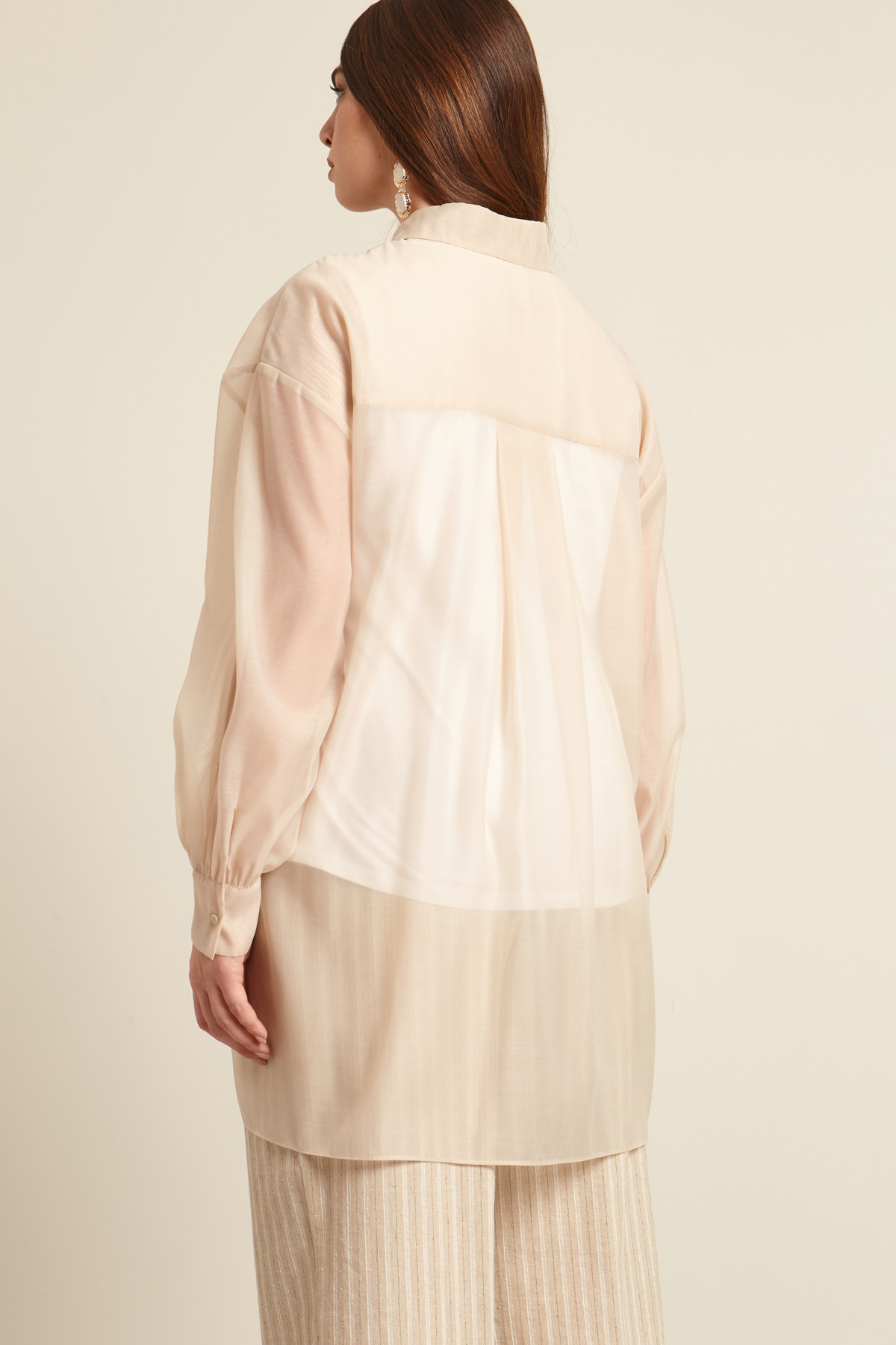 Camicia dalla linea dritta realizzata in organza lamè, con colletto classico, maniche lunghe con polsino e bottone, spacchetti laterali al fondo, carrè e cannoncino nel retro. Allacciatura tramite bottoni a vista.