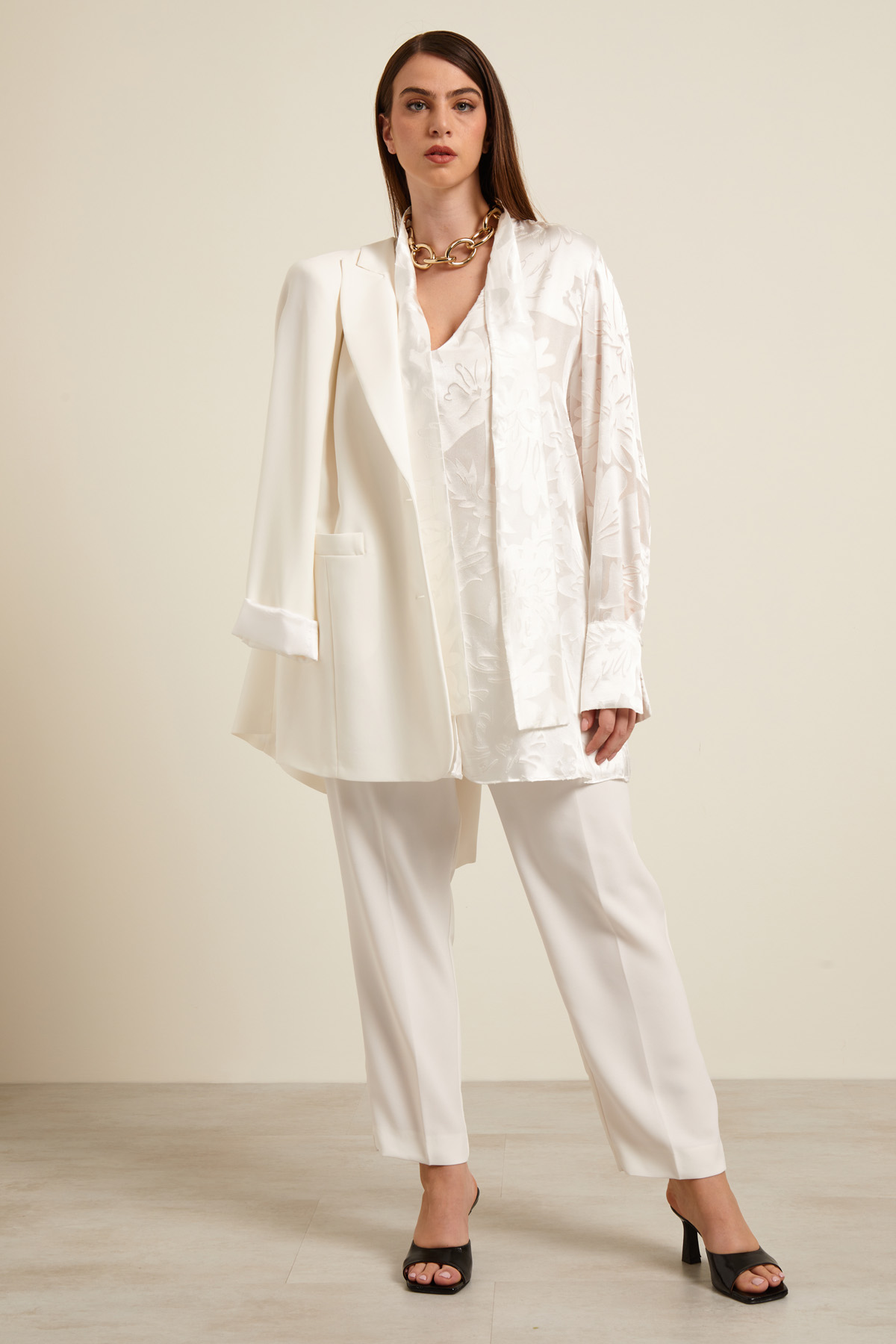 Blusa dalla linea fluida realizzata in raso dévoré di misto viscosa, con collo a foulard, apertura a V, maniche lunghe con spacchetto e bottone. Spacco a fondo capo sul davanti.