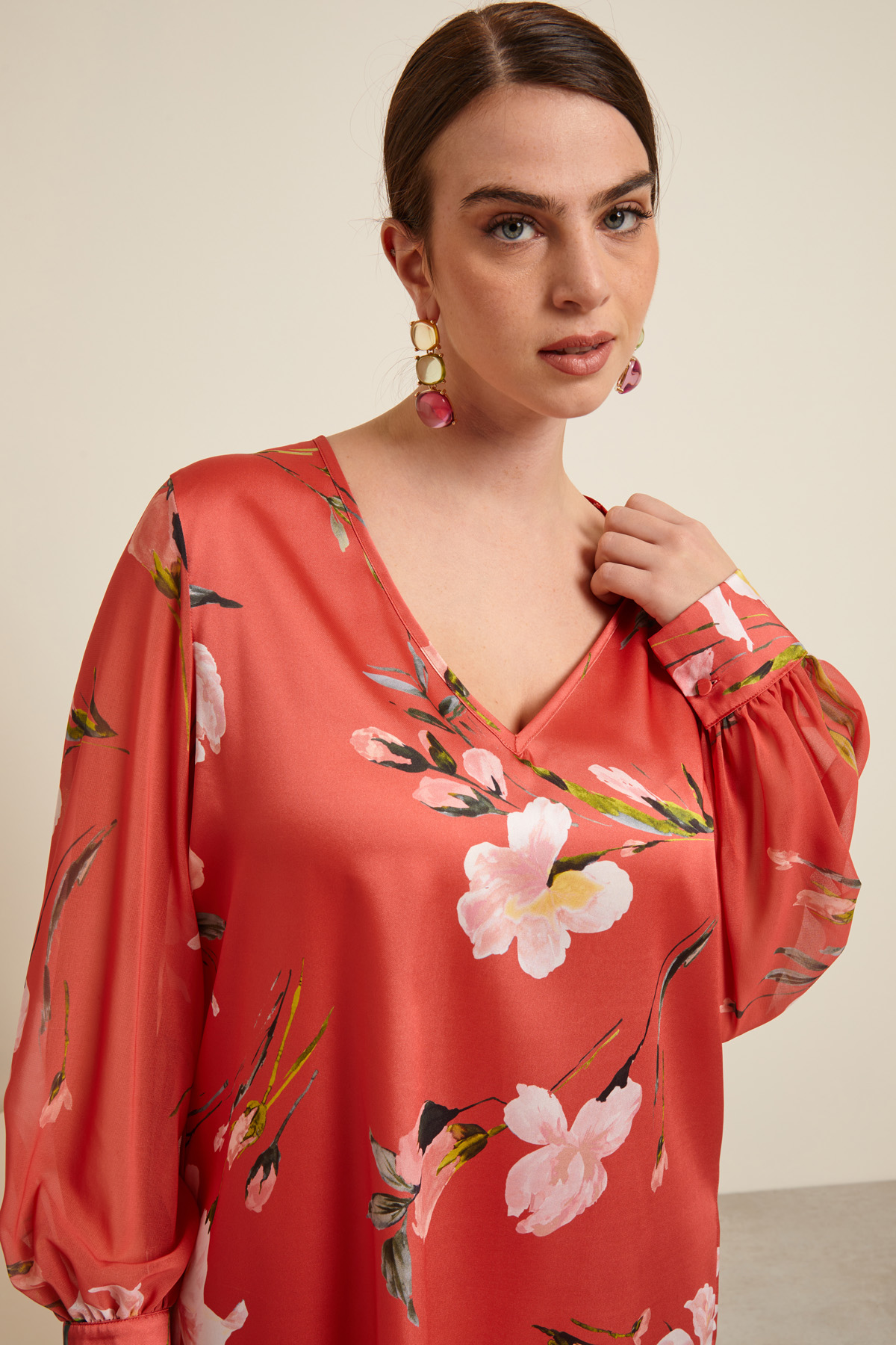 Blusa dalla linea fluida realizzata in twill stampato, con scollo a V e maniche in georgette con polsino e bottone.