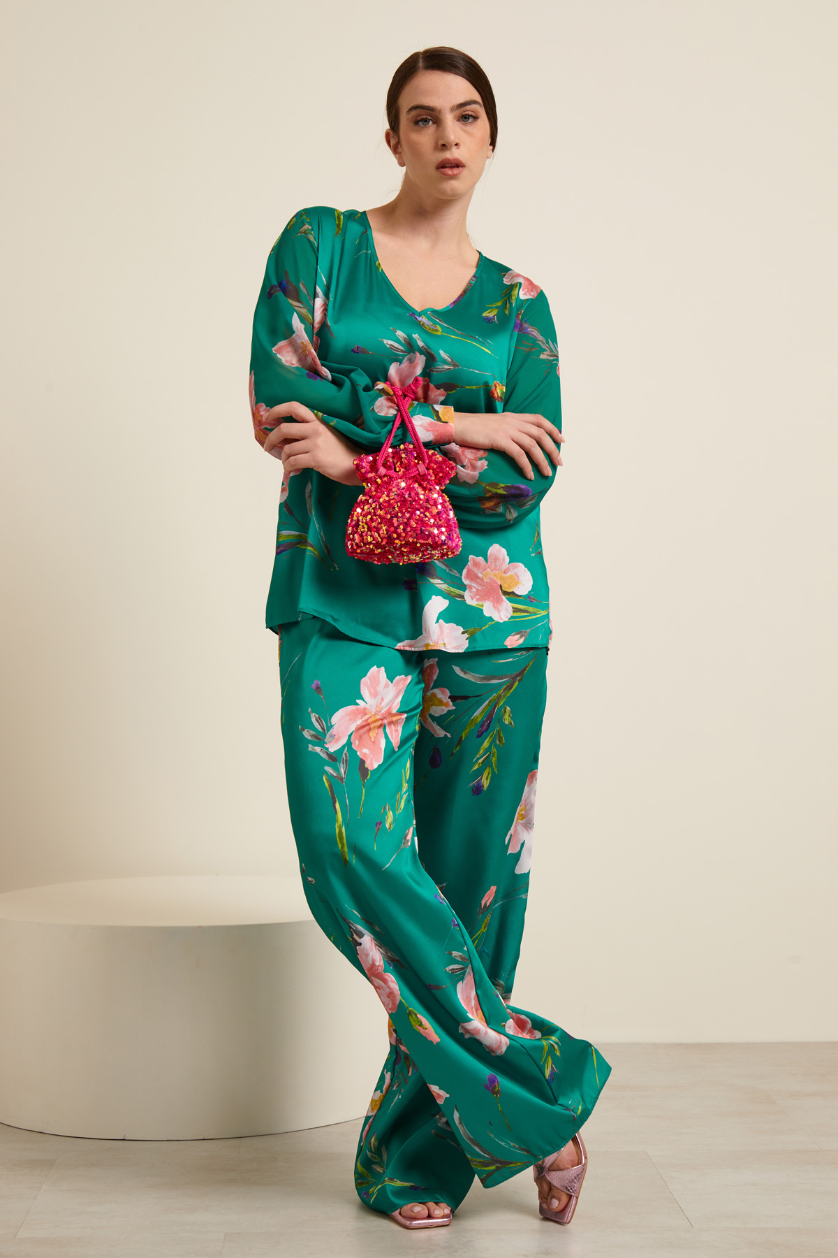 Blusa dalla linea fluida realizzata in twill stampato, con scollo a V e maniche in georgette con polsino e bottone.