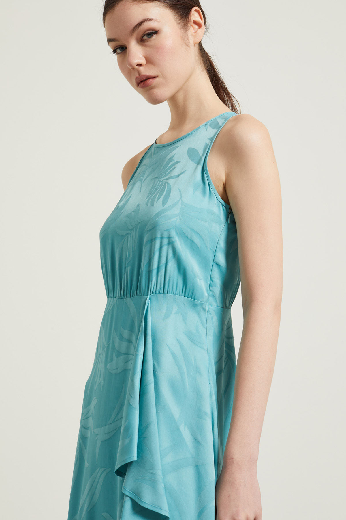 Abito smanicato dalla linea fluida realizzato in viscosa jacquard, scollo a giro con apertura a goccia con bottone nel retro, taglio in vita con motivo arricciato e dettaglio di volant.