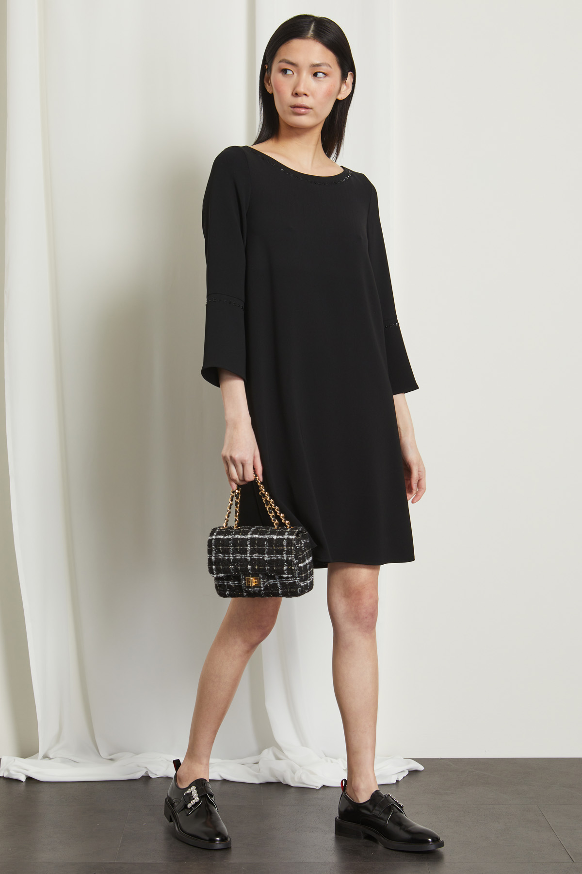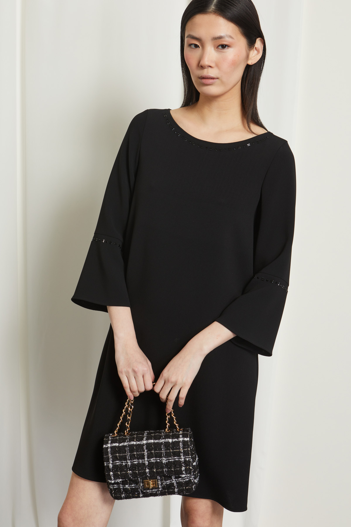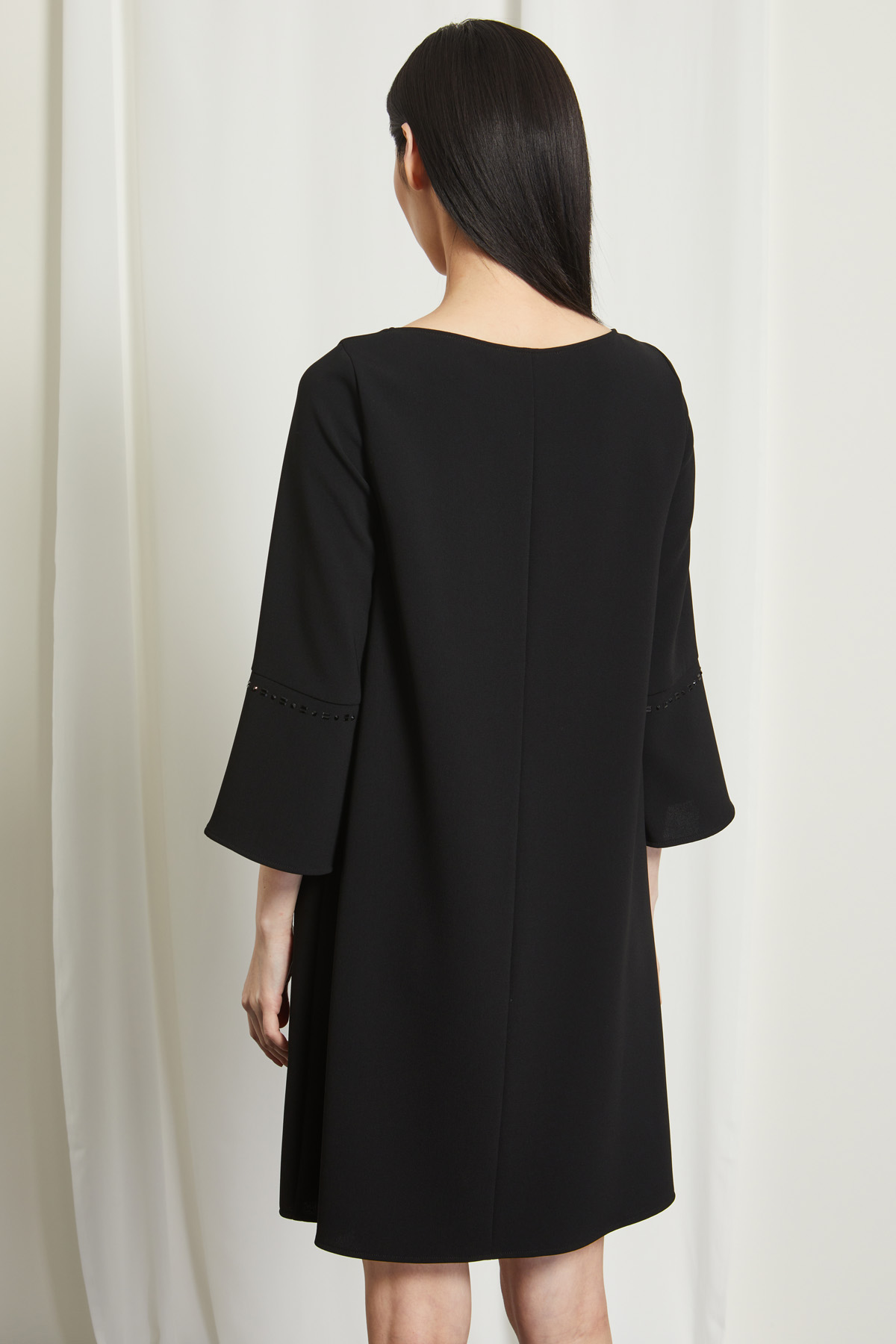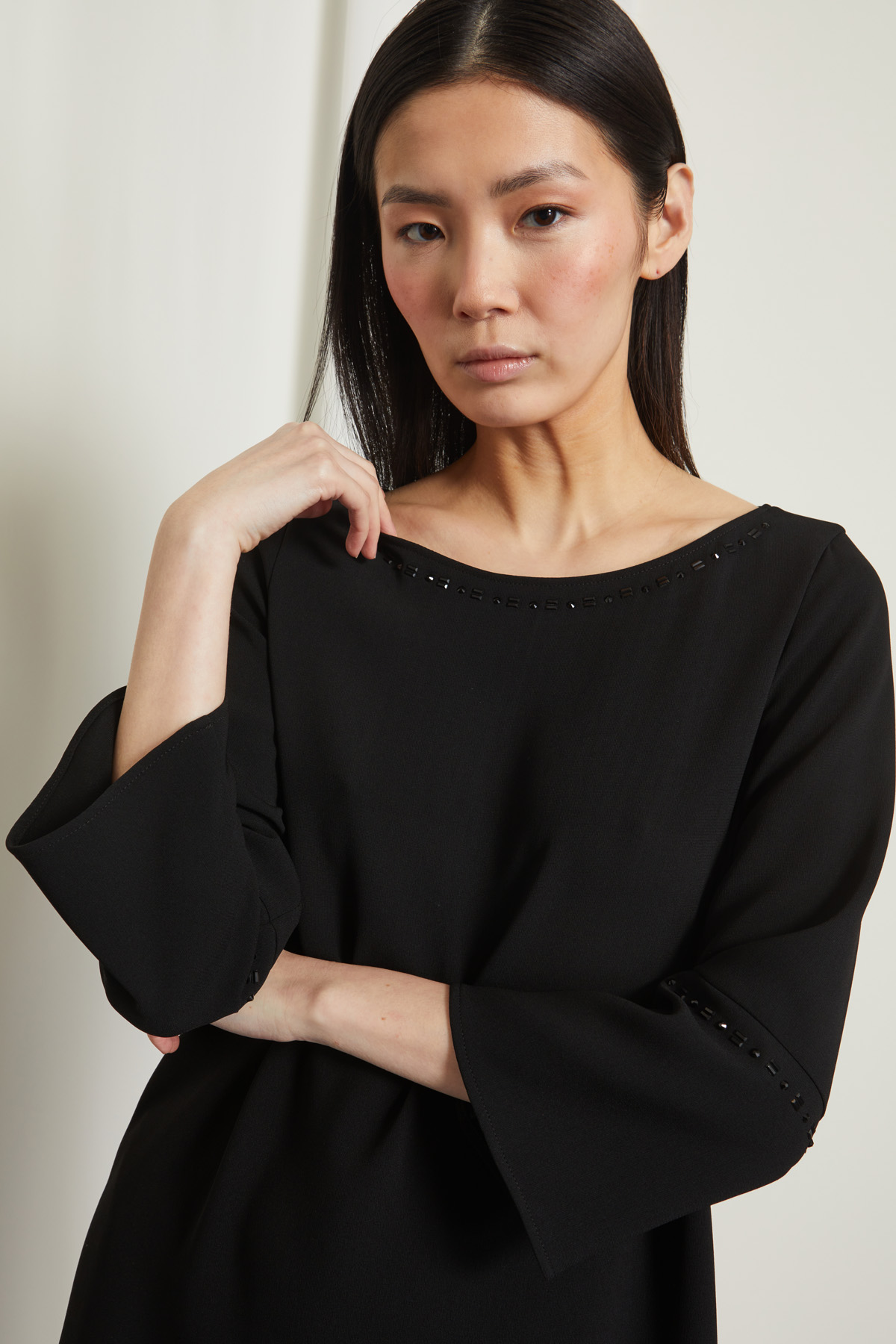 Abito dalla linea dritta realizzato in tessuto fluido con scollo a barchetta, maniche a tre quarti svasate e dettagli di strass lungo lo scollo e nella manica.